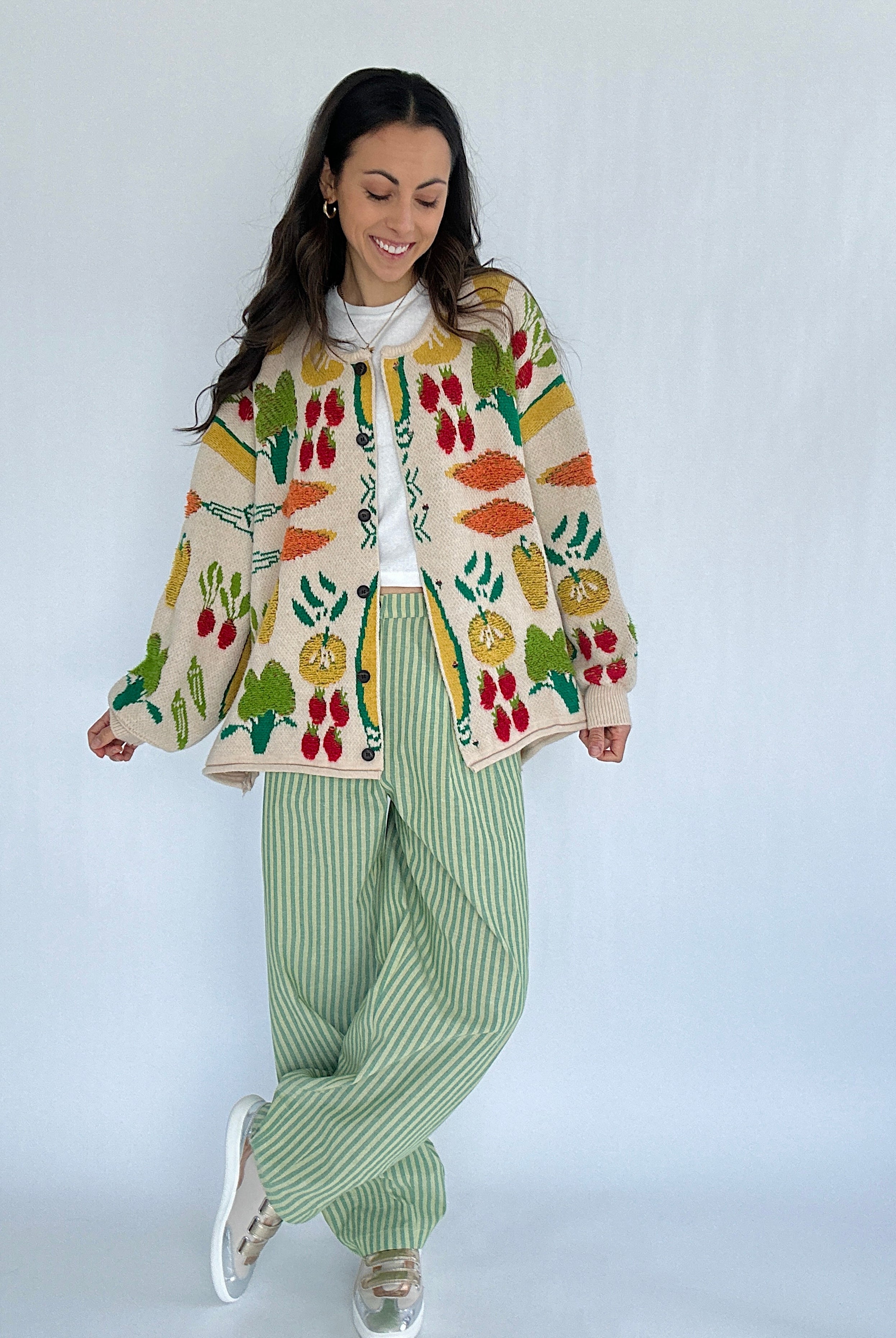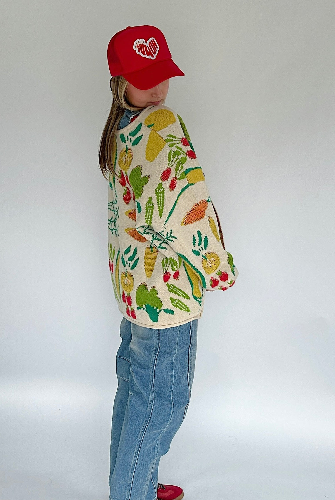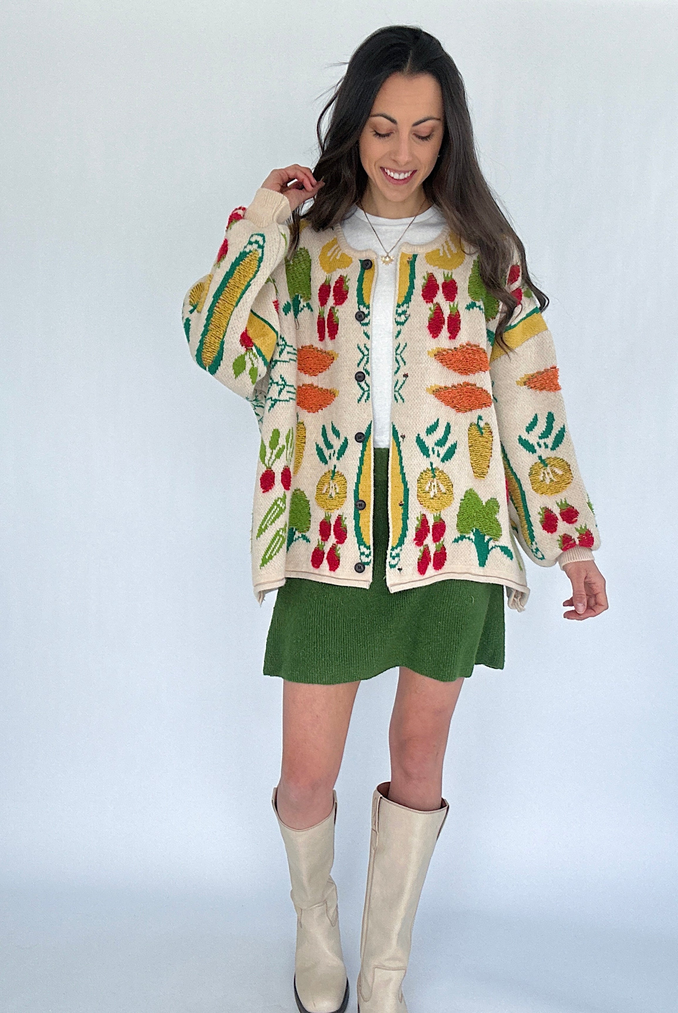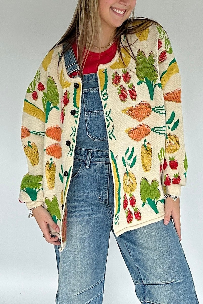Whimsical, colorful, and oh-so-comfy, the Fruits And Veggies Cardigan is a statement knit that brightens any outfit. Made in a medium-weight jacquard sweater knit with a cream background, it features an allover fruits + veggies pattern, a button-up front, and ribbed hems. With its oversized, one-size fit, this hip-length cardigan is as cozy as it is fun to wear.