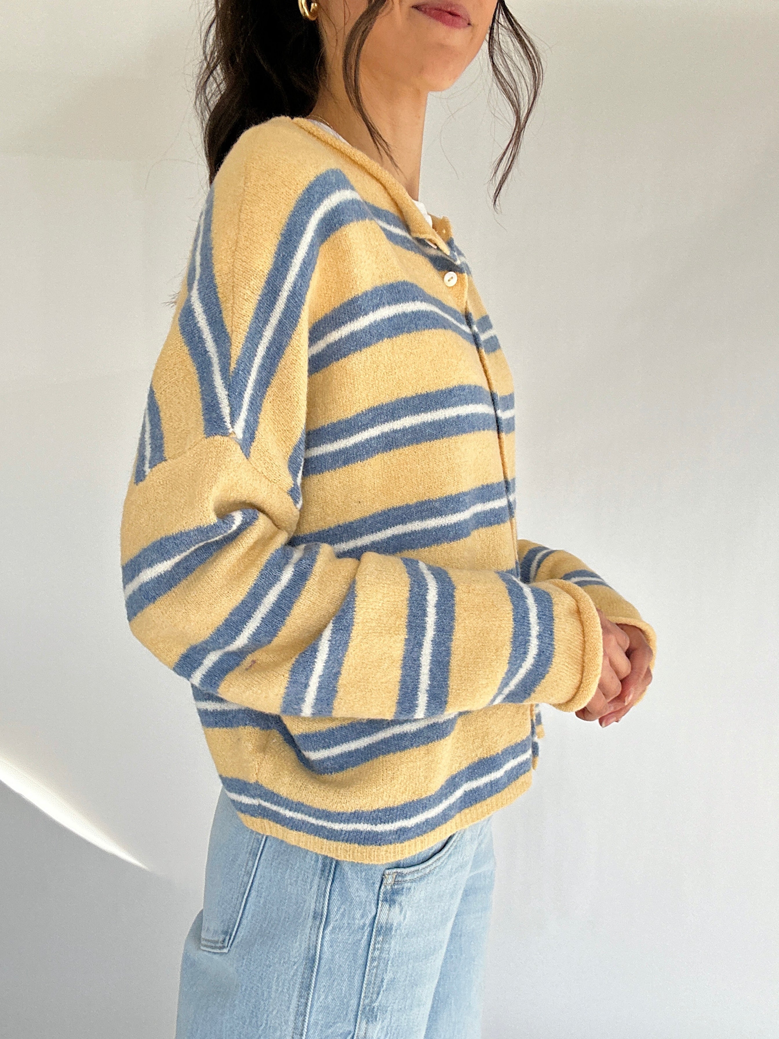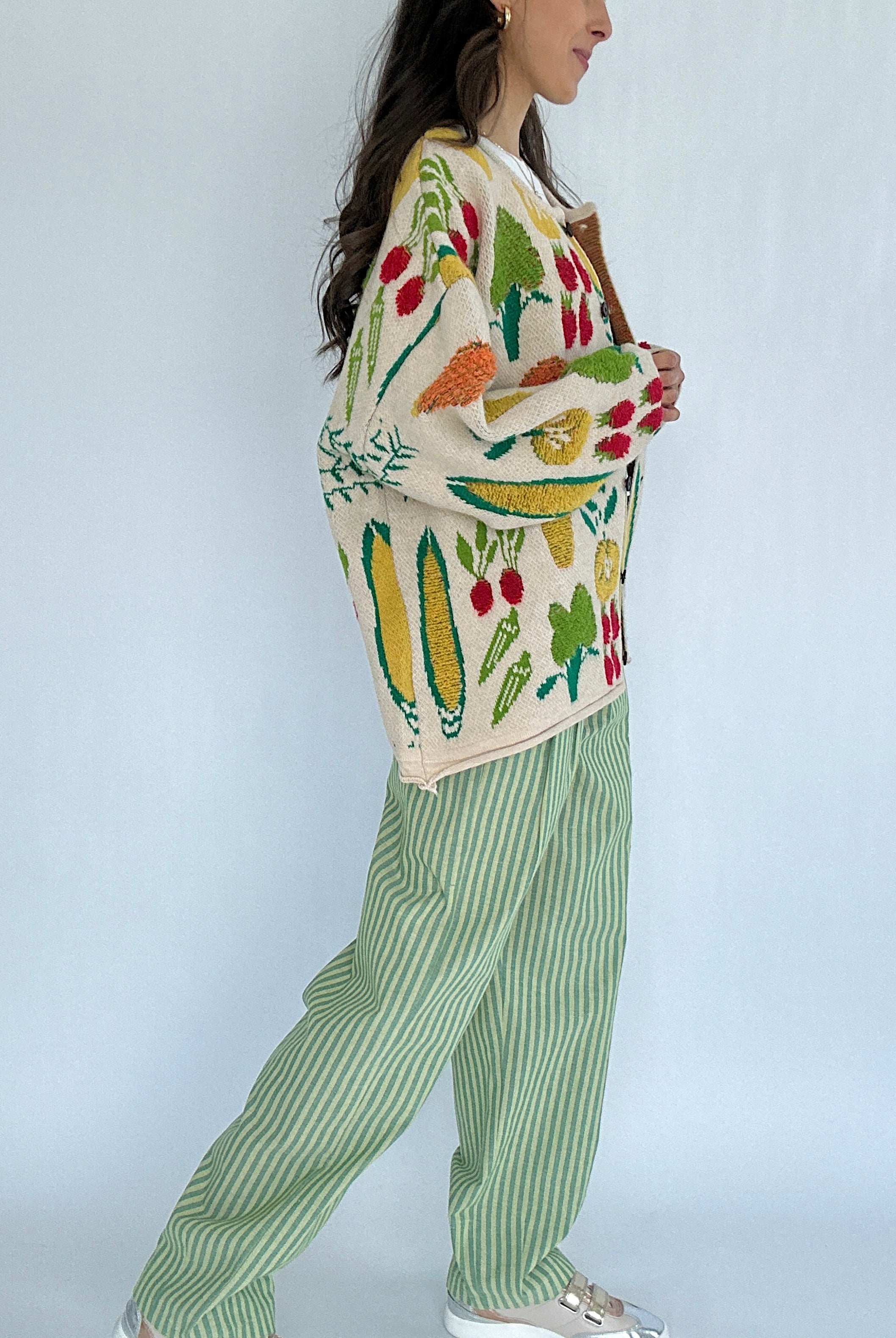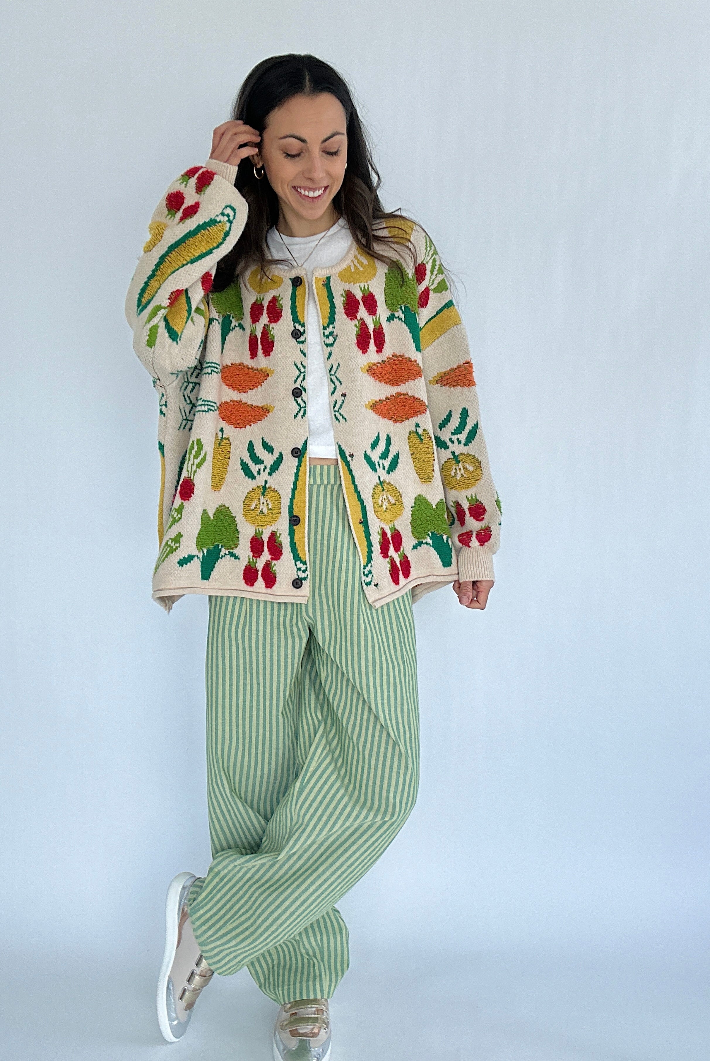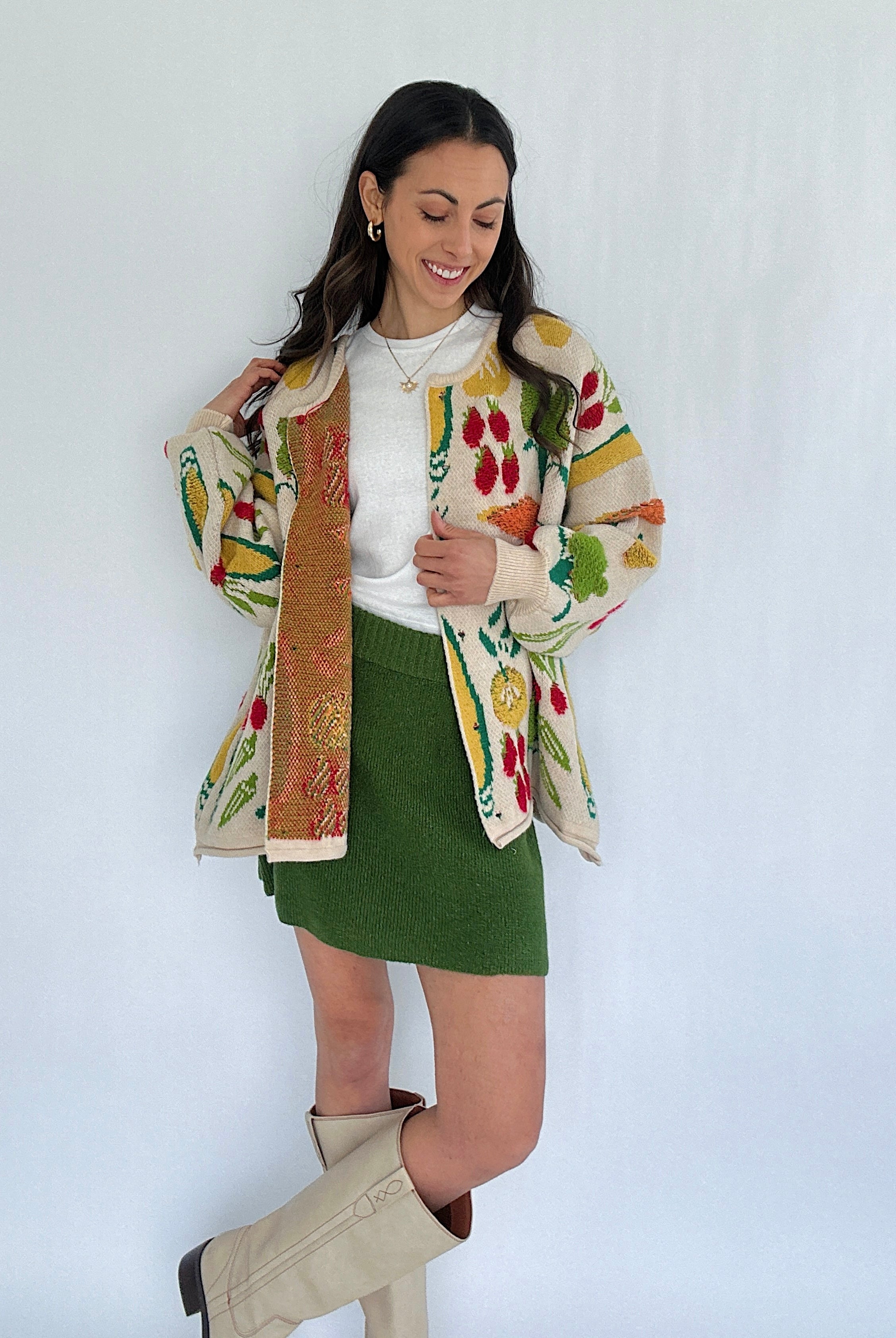 Whimsical, colorful, and oh-so-comfy, the Fruits And Veggies Cardigan is a statement knit that brightens any outfit. Made in a medium-weight jacquard sweater knit with a cream background, it features an allover fruits + veggies pattern, a button-up front, and ribbed hems. With its oversized, one-size fit, this hip-length cardigan is as cozy as it is fun to wear.