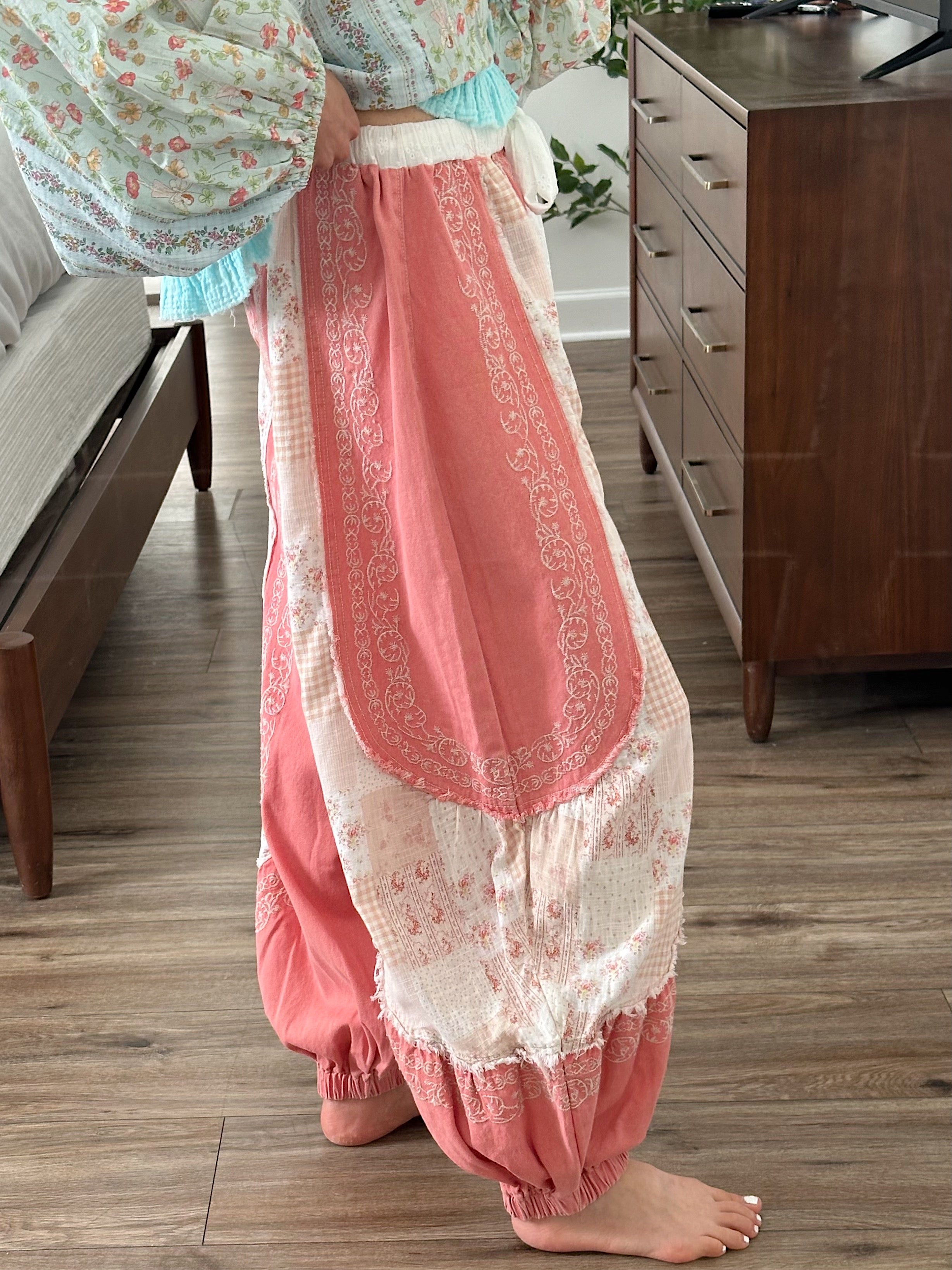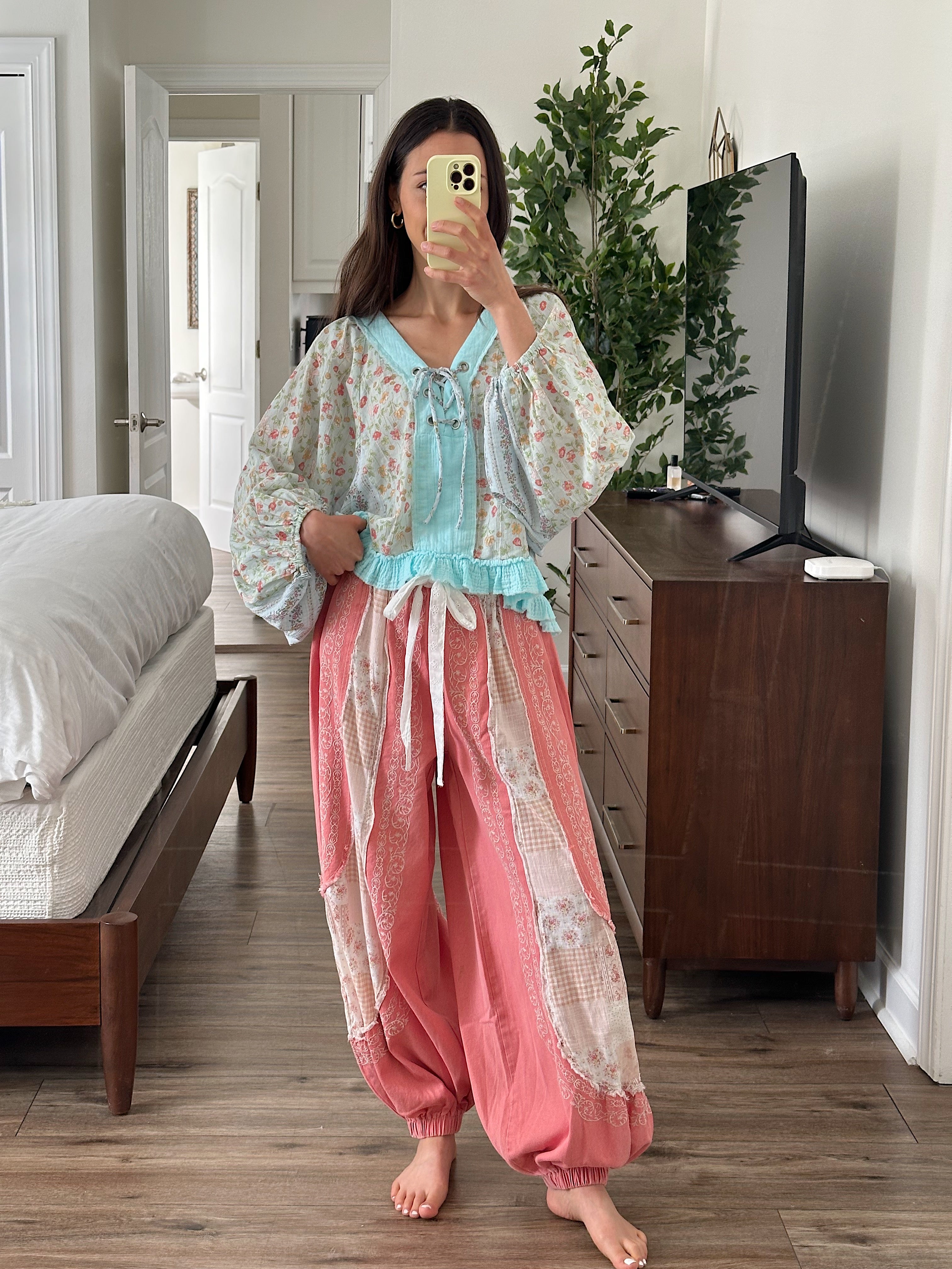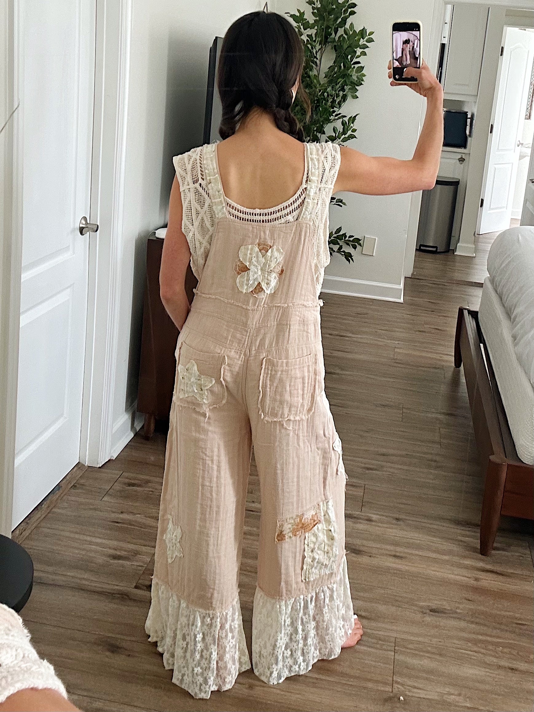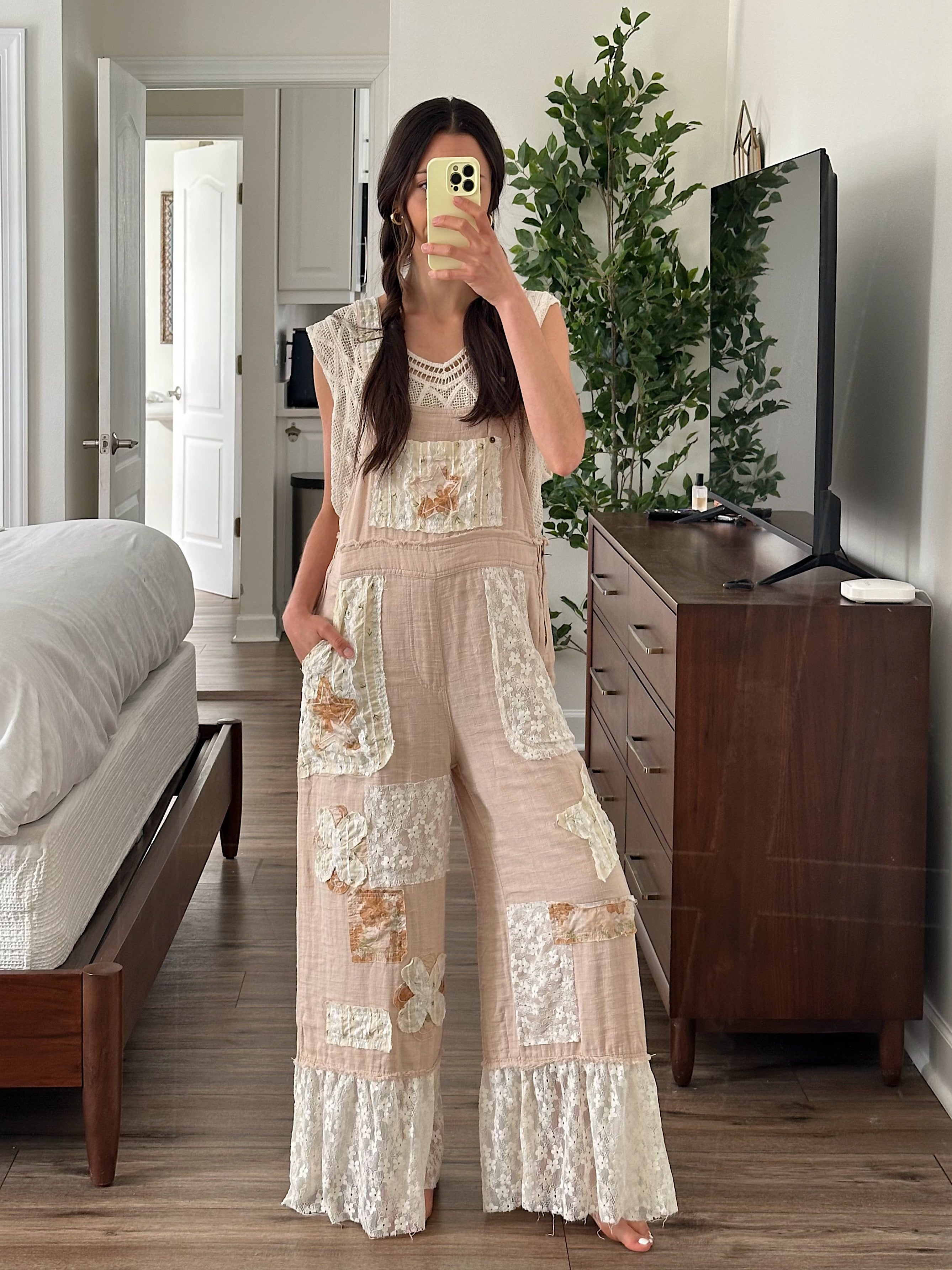 These overalls have that perfectly relaxed, lived-in fit that moves with you. The patchwork detail is what sets them apart—mixed florals and lace panels layered across the bodice and legs give them a handcrafted, one-of-a-kind feel you won't see on everyone else. The wide leg silhouette keeps things breezy, and the adjustable snap straps mean you can dial in the fit exactly how you like it. Pair with a simple white tee and sneakers, or swap in a tank and sandals... whatever the day calls for these overalls are here for it.