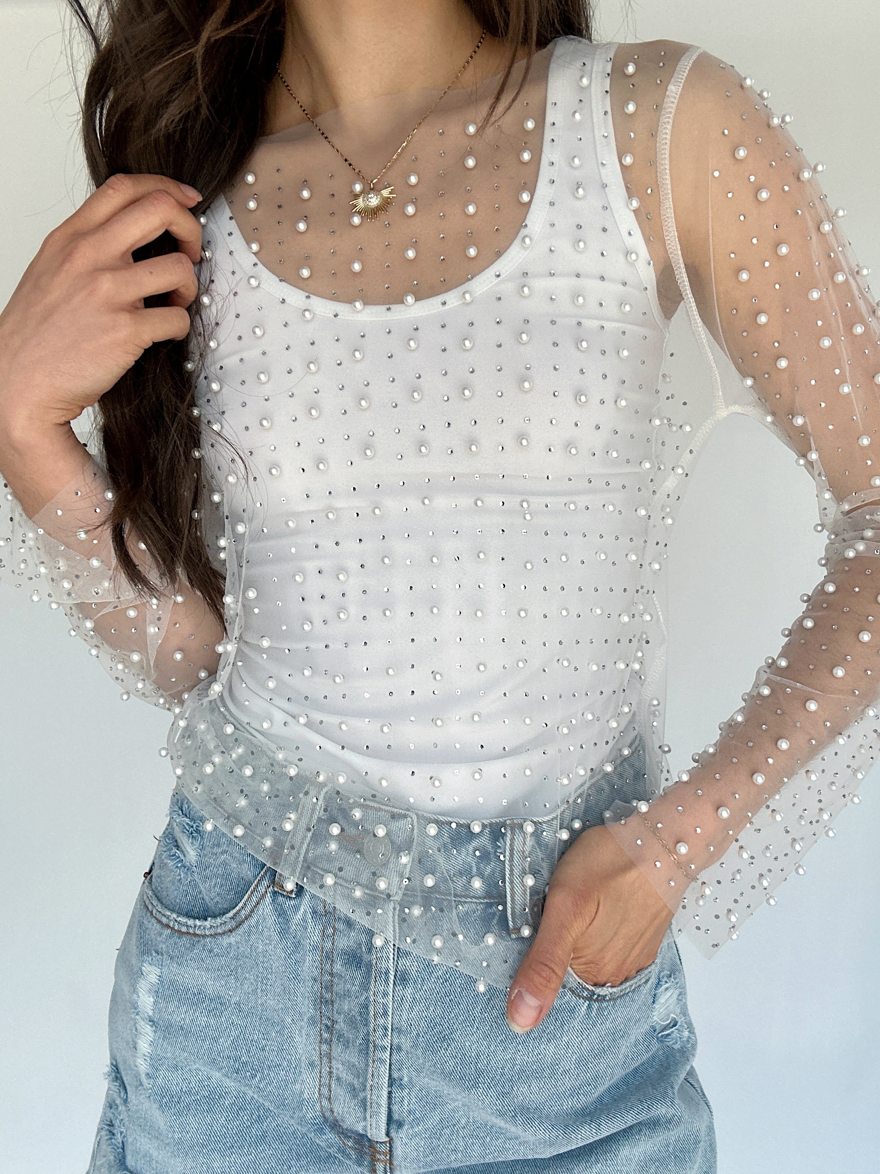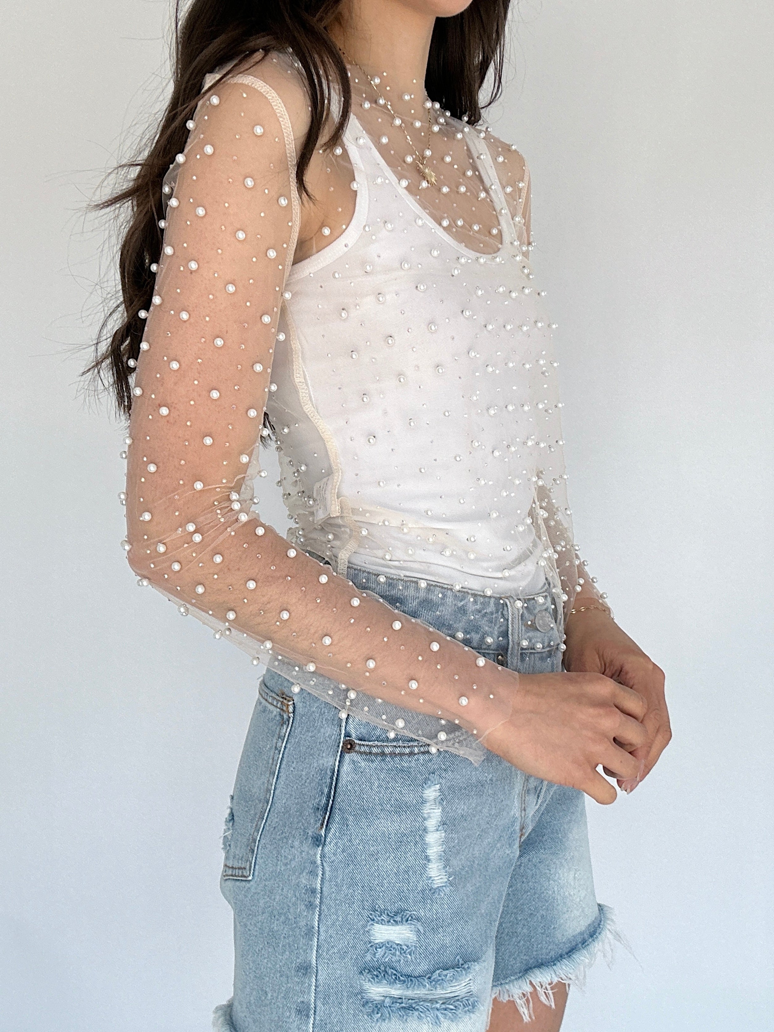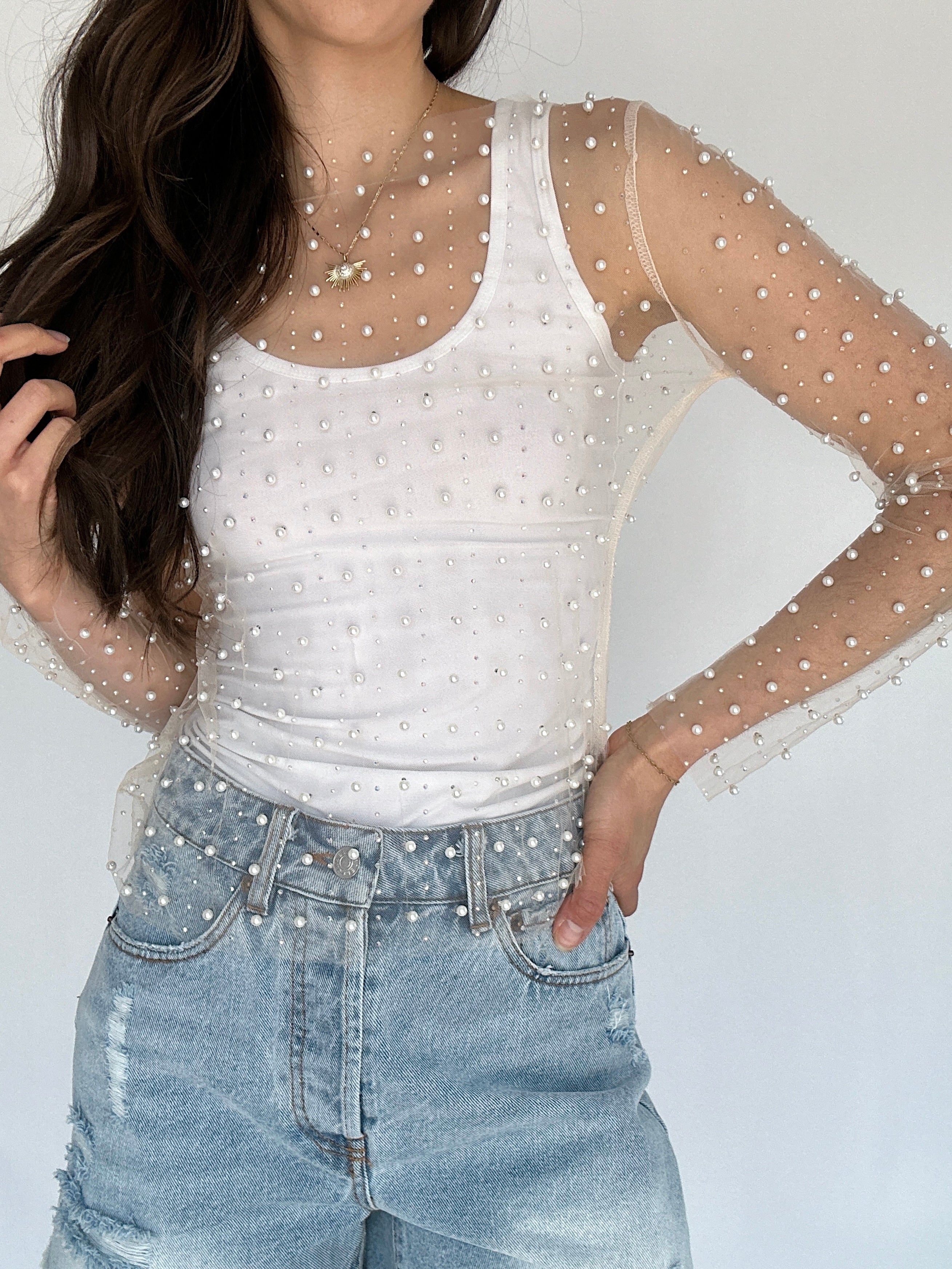 Main Character Embellished Mesh Top - Nude