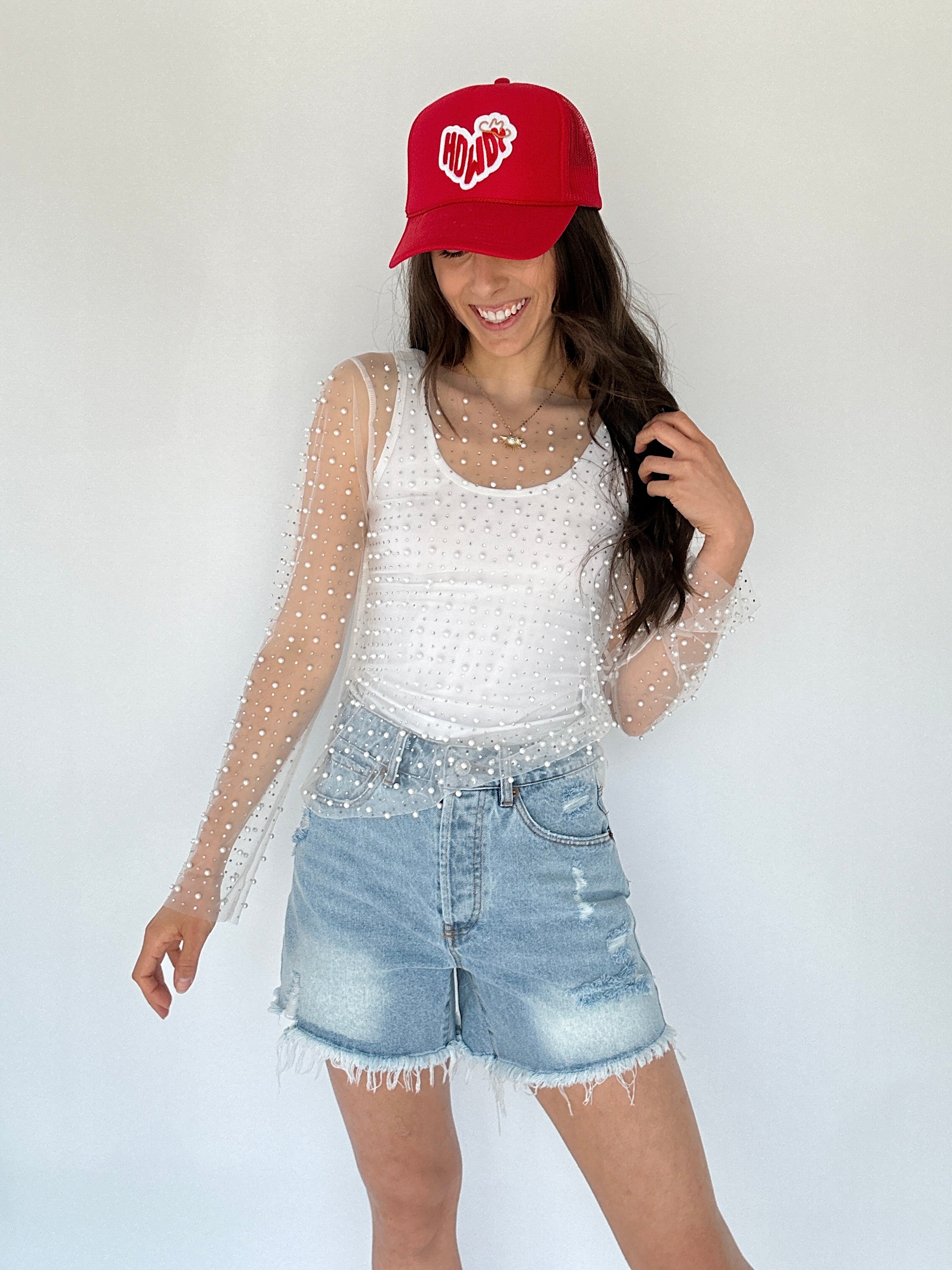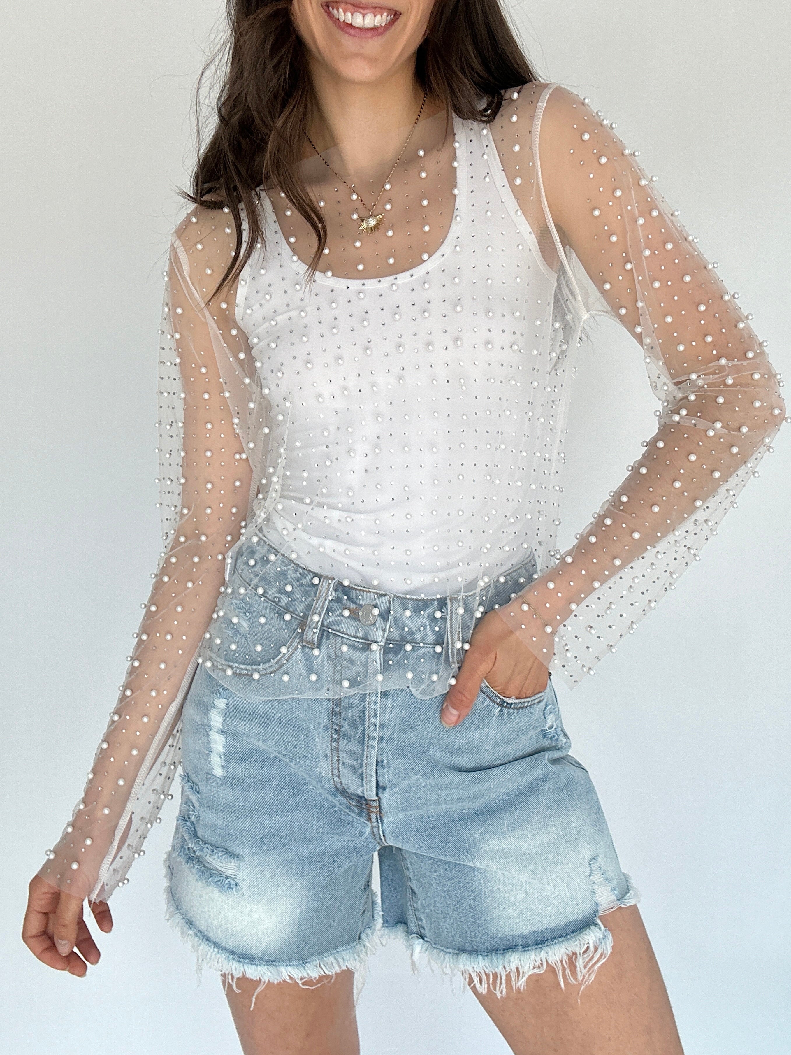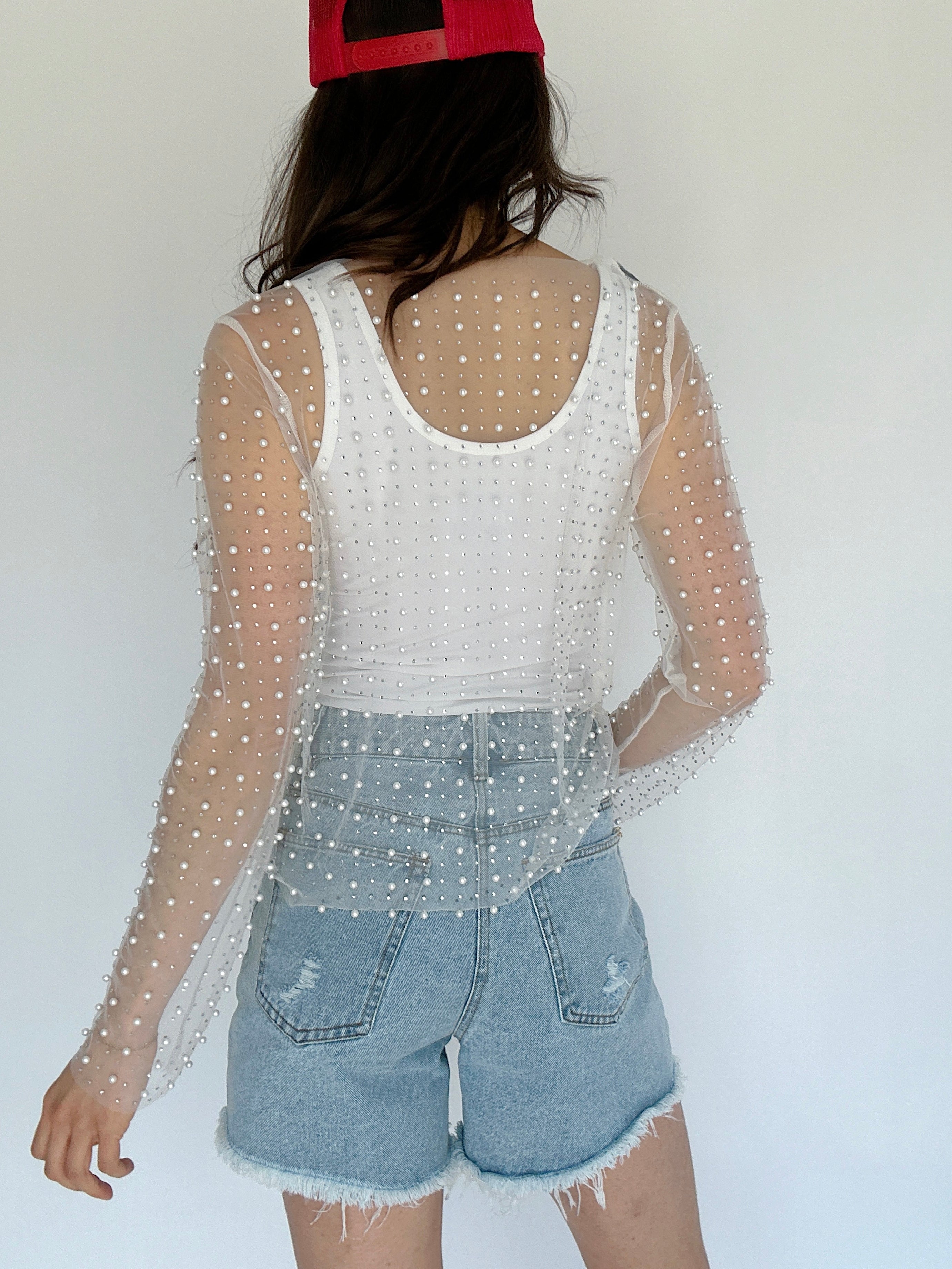 Main Character Embellished Mesh Top - White