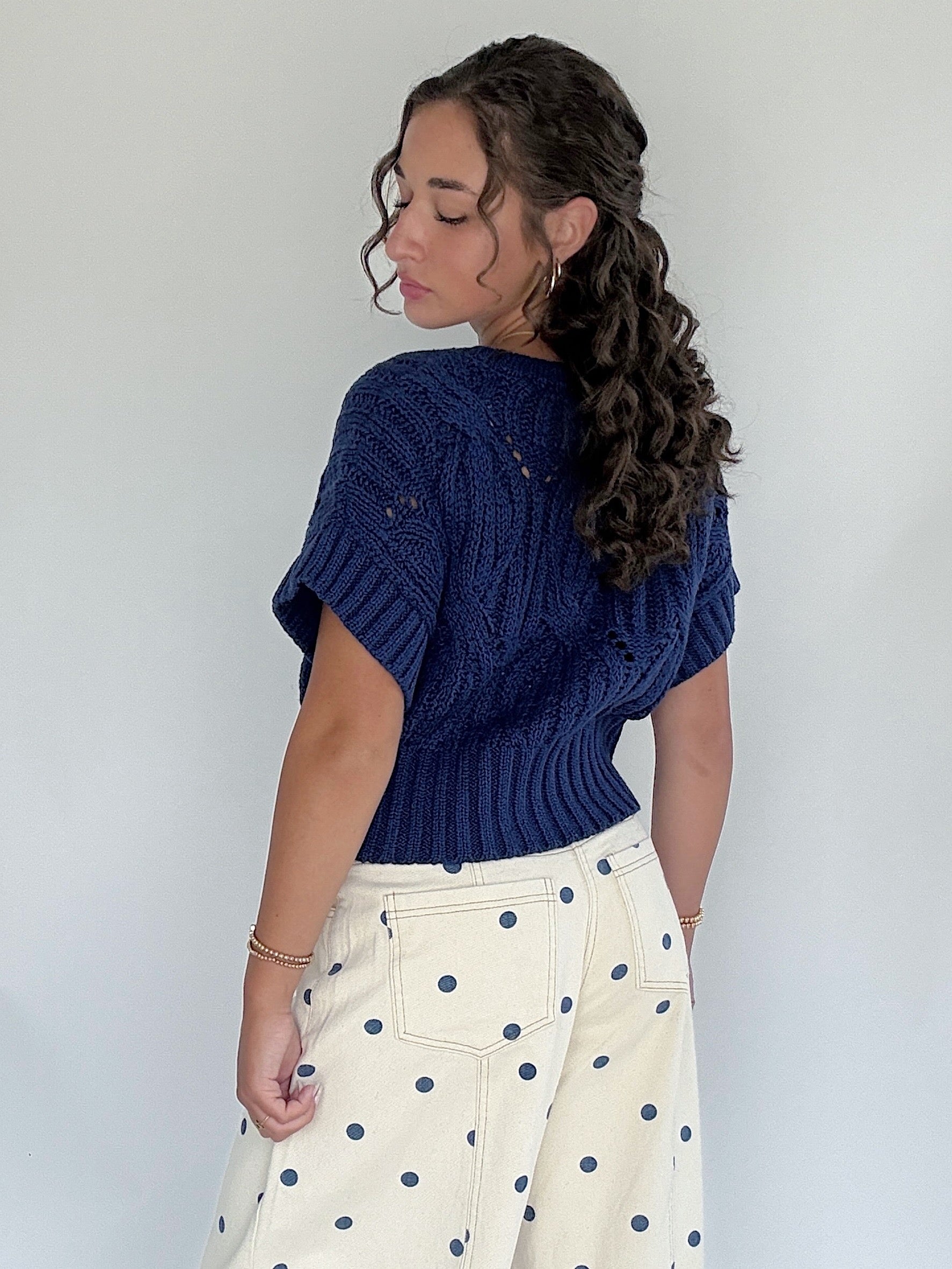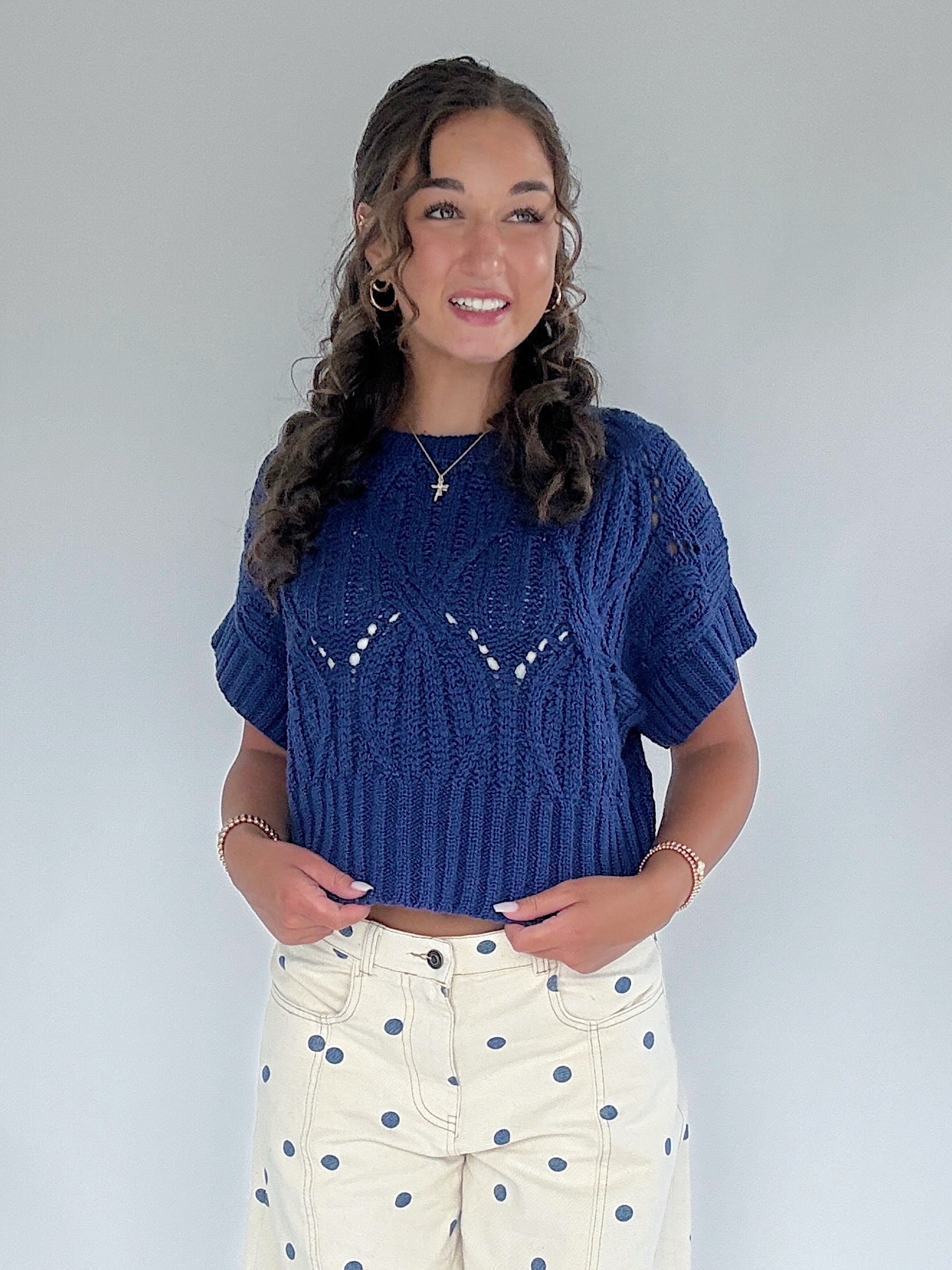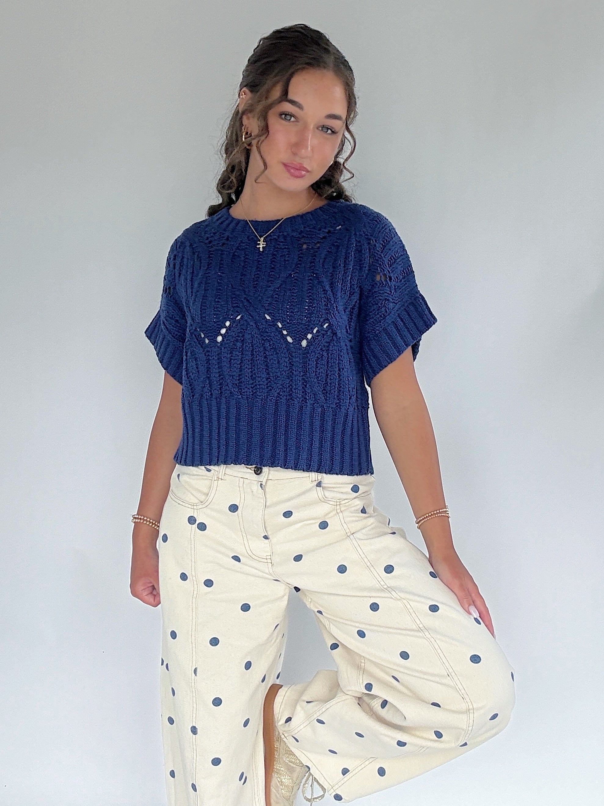 This navy blue short sleeve sweater has a round neckline and slightly cropped fit. So cute for transitioning seasons with wide leg pants, shorts or your favorite jeans! We also love throwing it over dresses too.