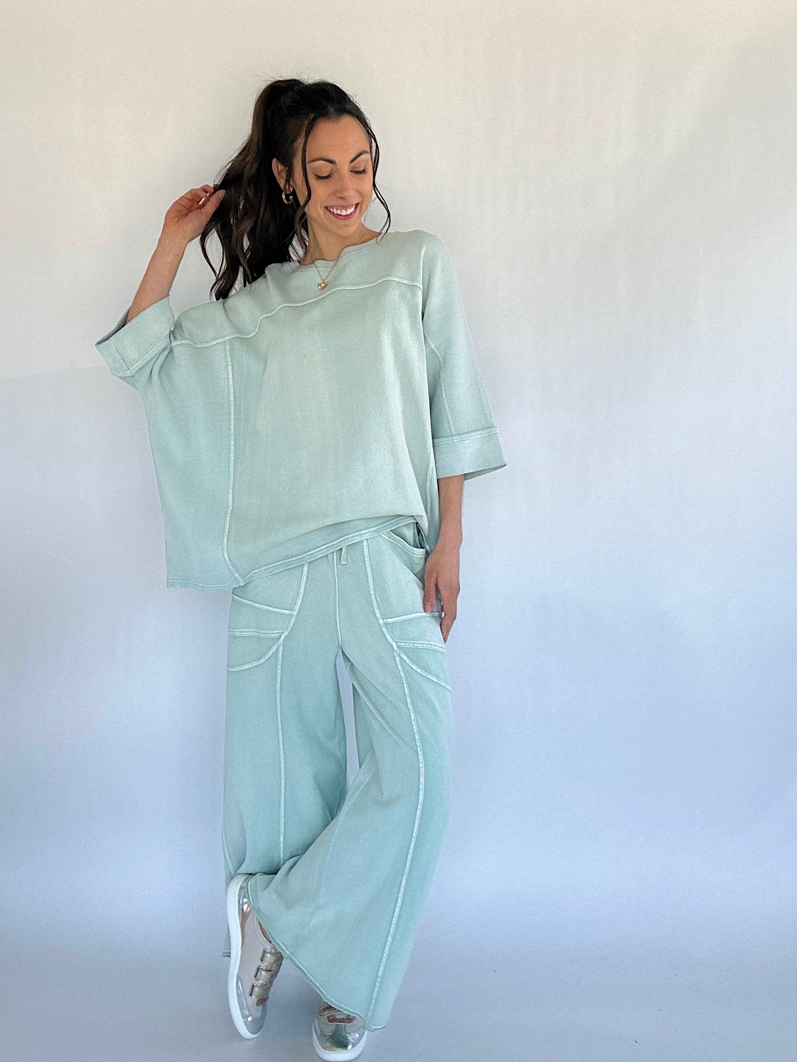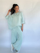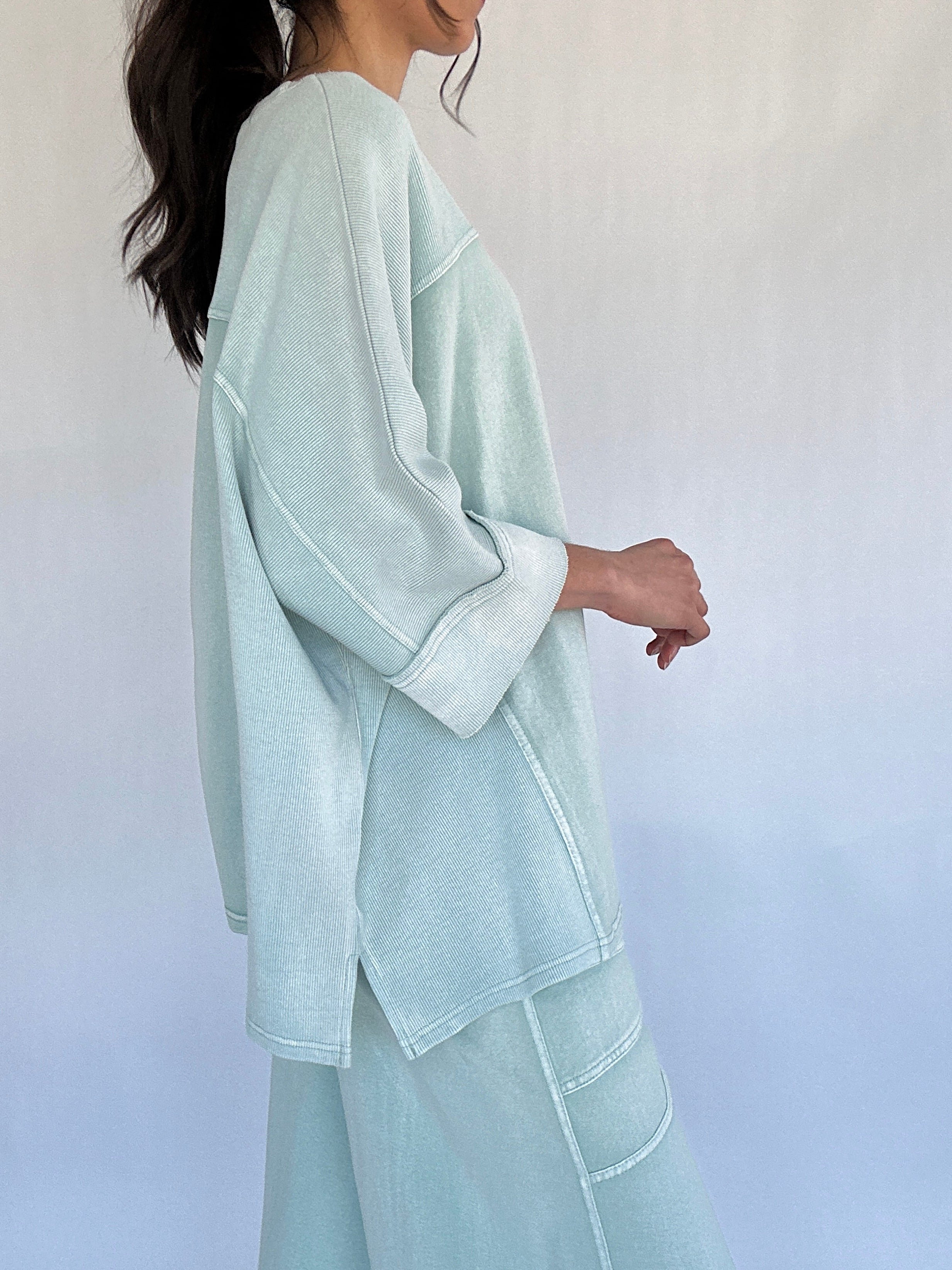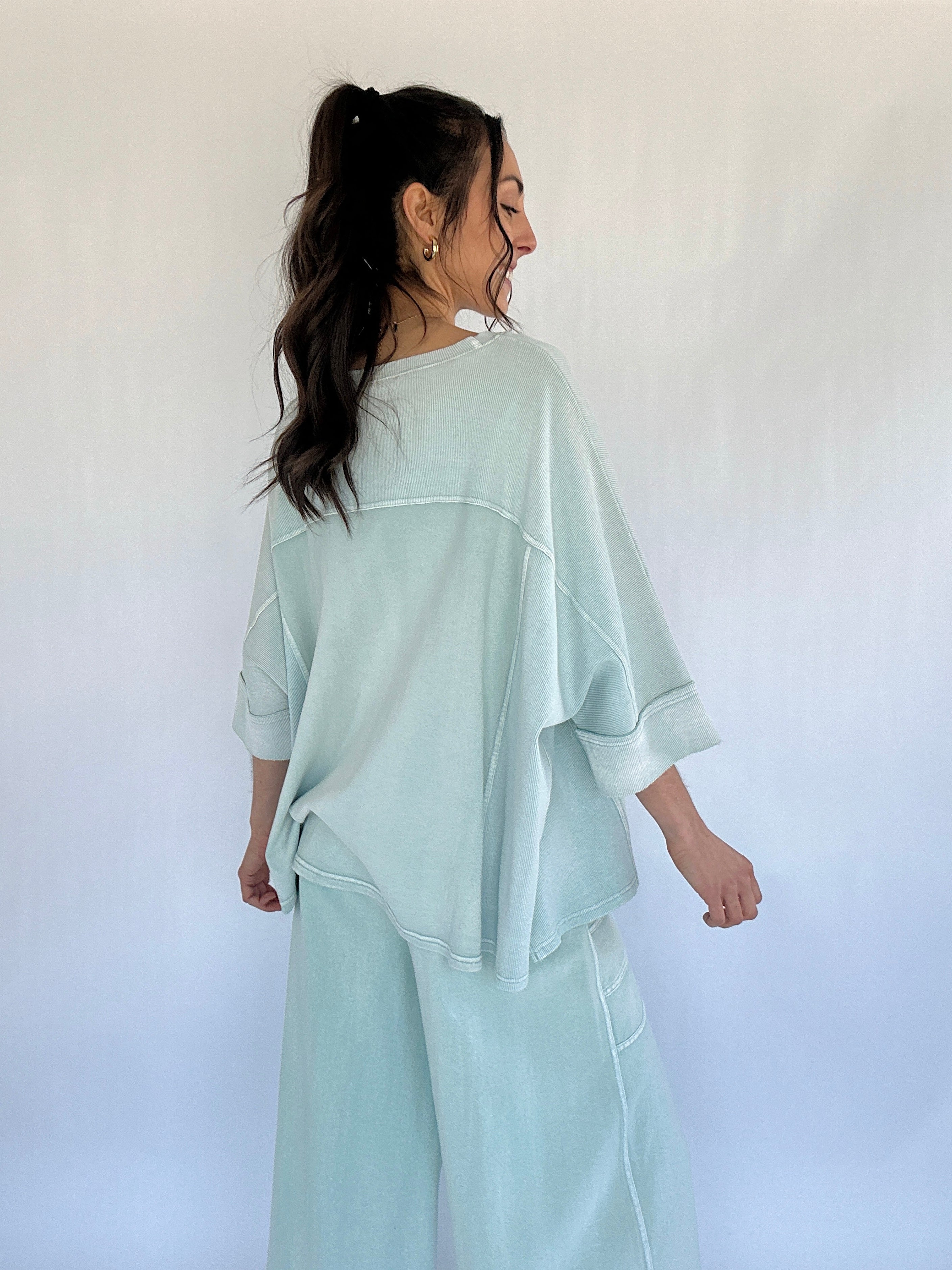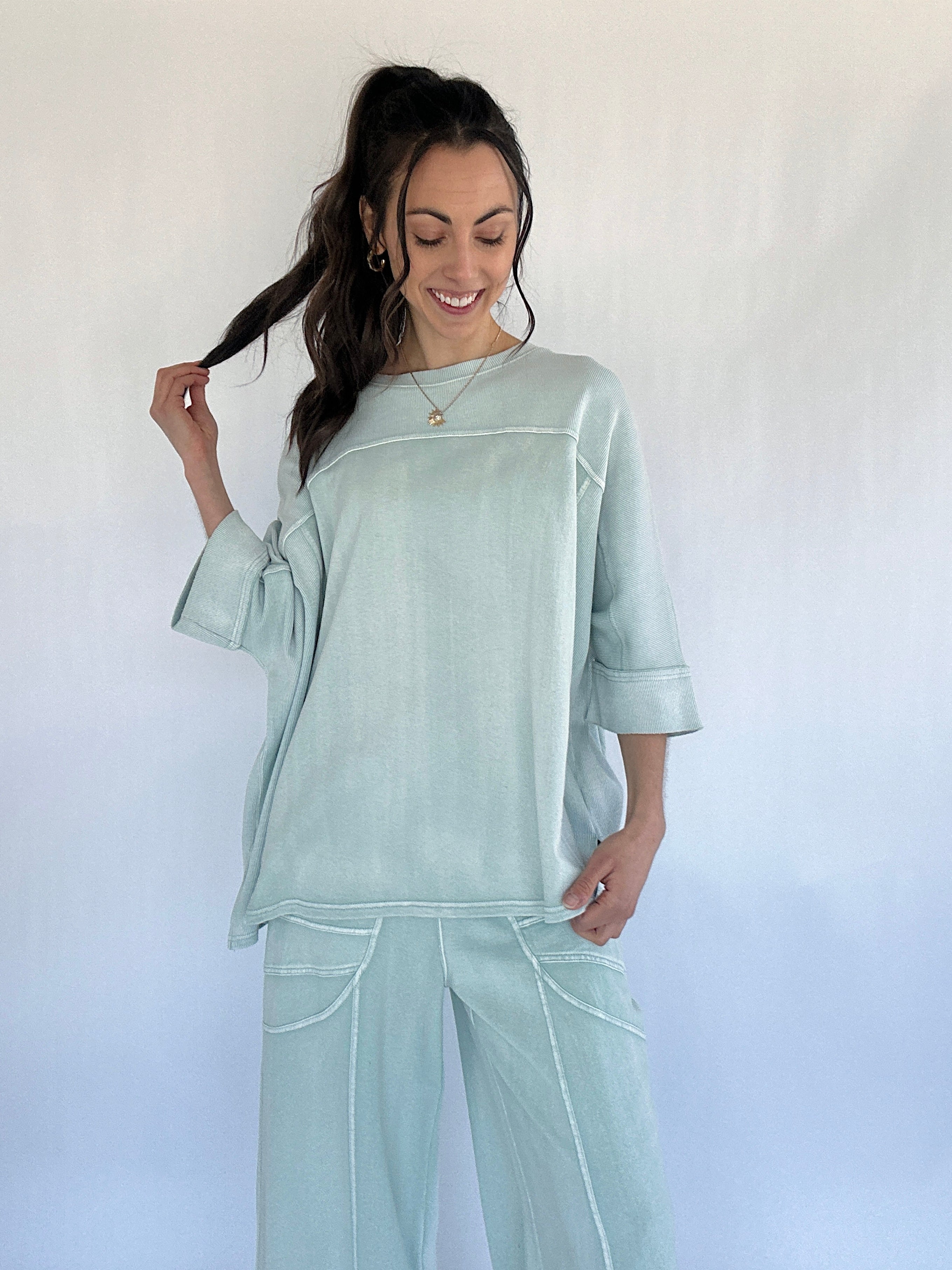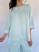 From slow mornings at home to errands and casual days out, the Dani Top is the kind of piece you’ll want to live in. Designed with an oversized, boxy silhouette and a soft mineral-washed finish, this top blends comfort with just enough detail to feel styled. Exposed seams, wide 3/4 sleeves, and side slits give it an easy, laid-back look that pairs perfectly with the matching Dani Pants—or your favorite denim.