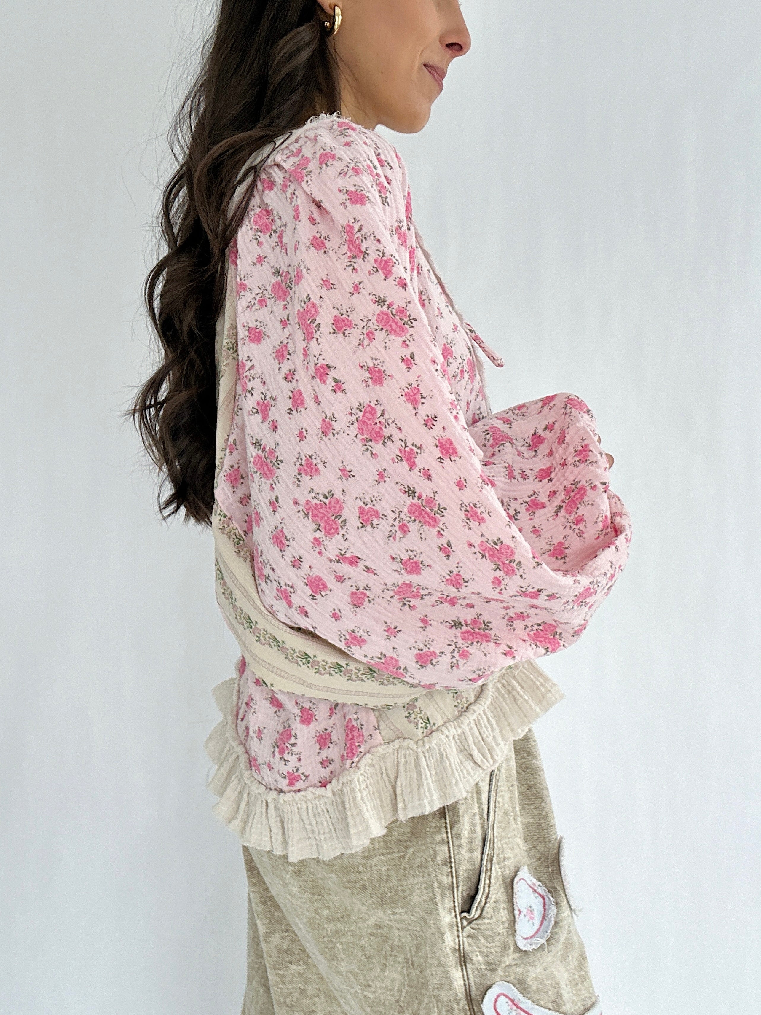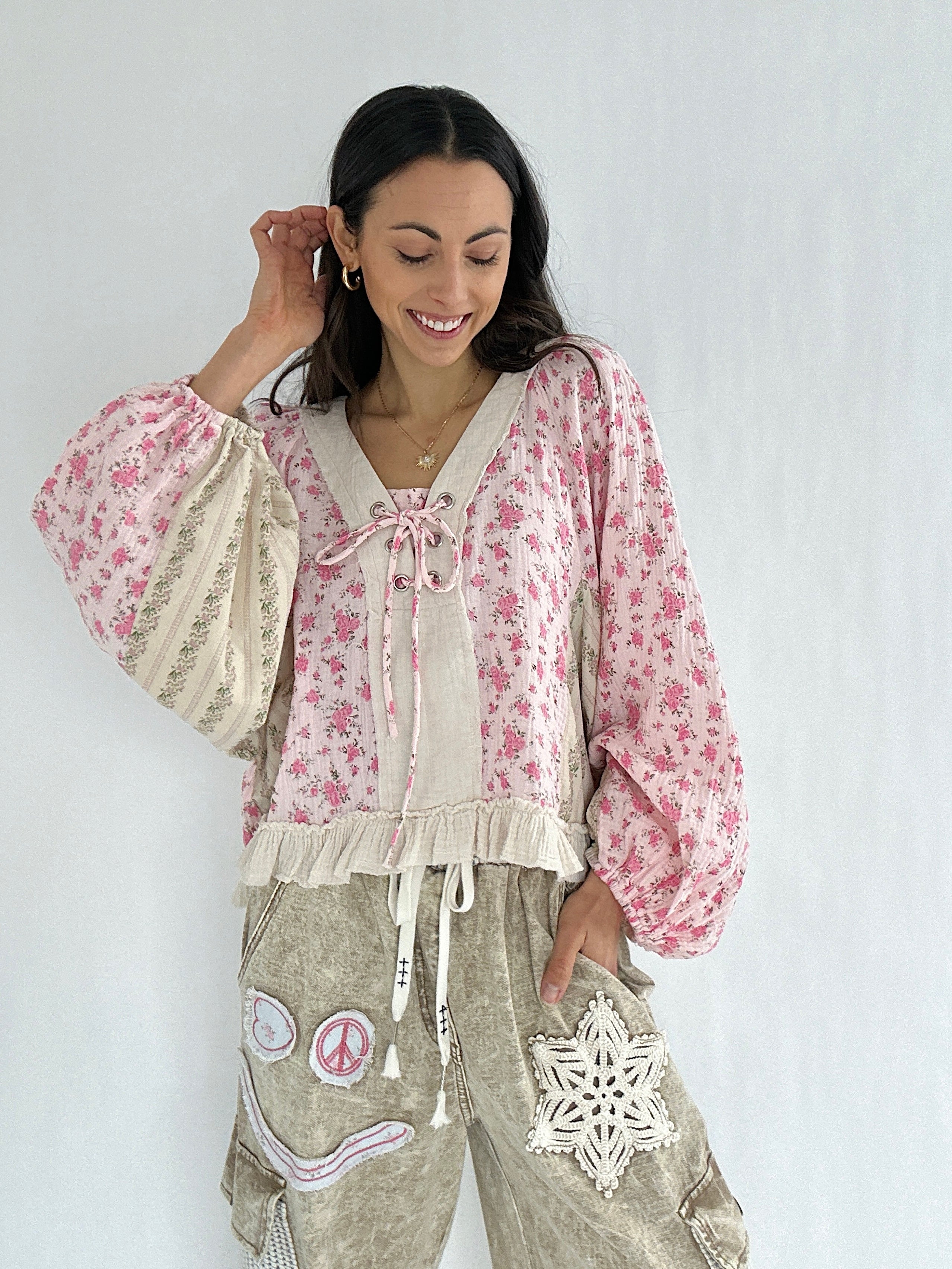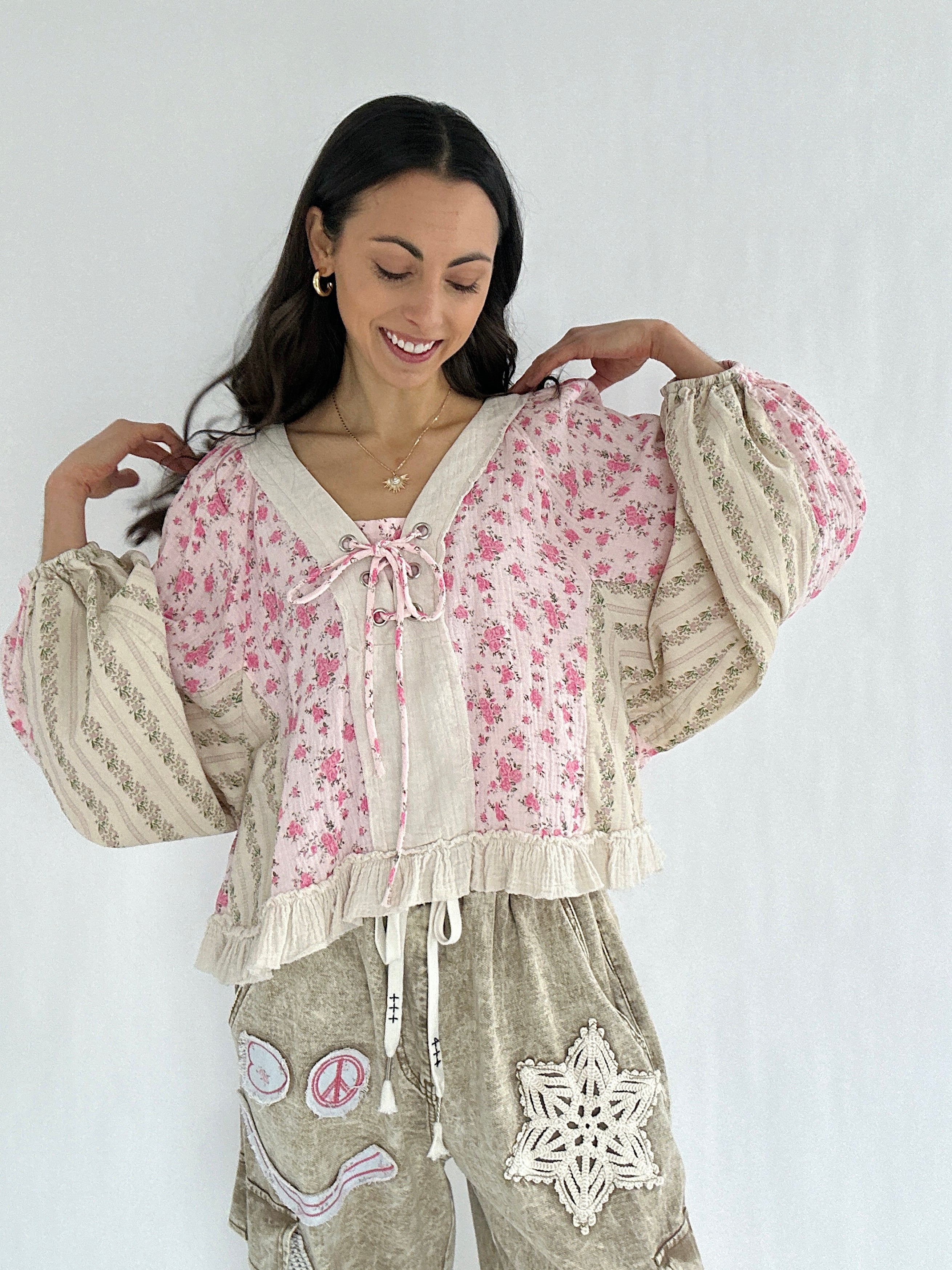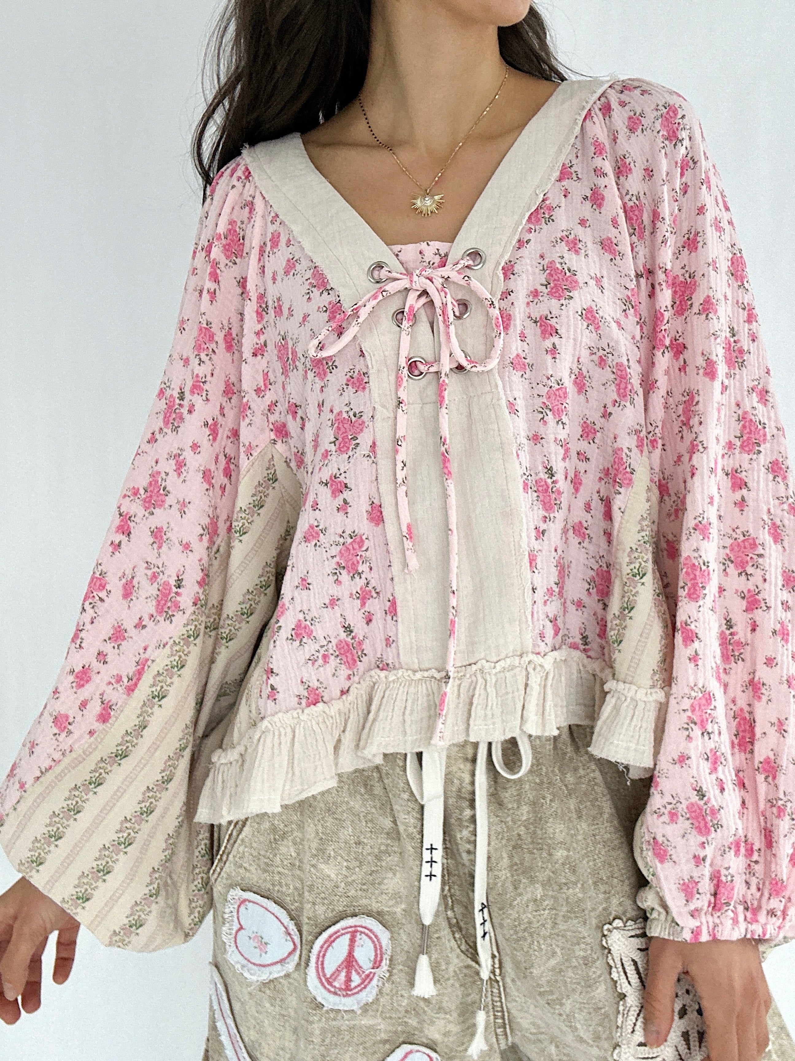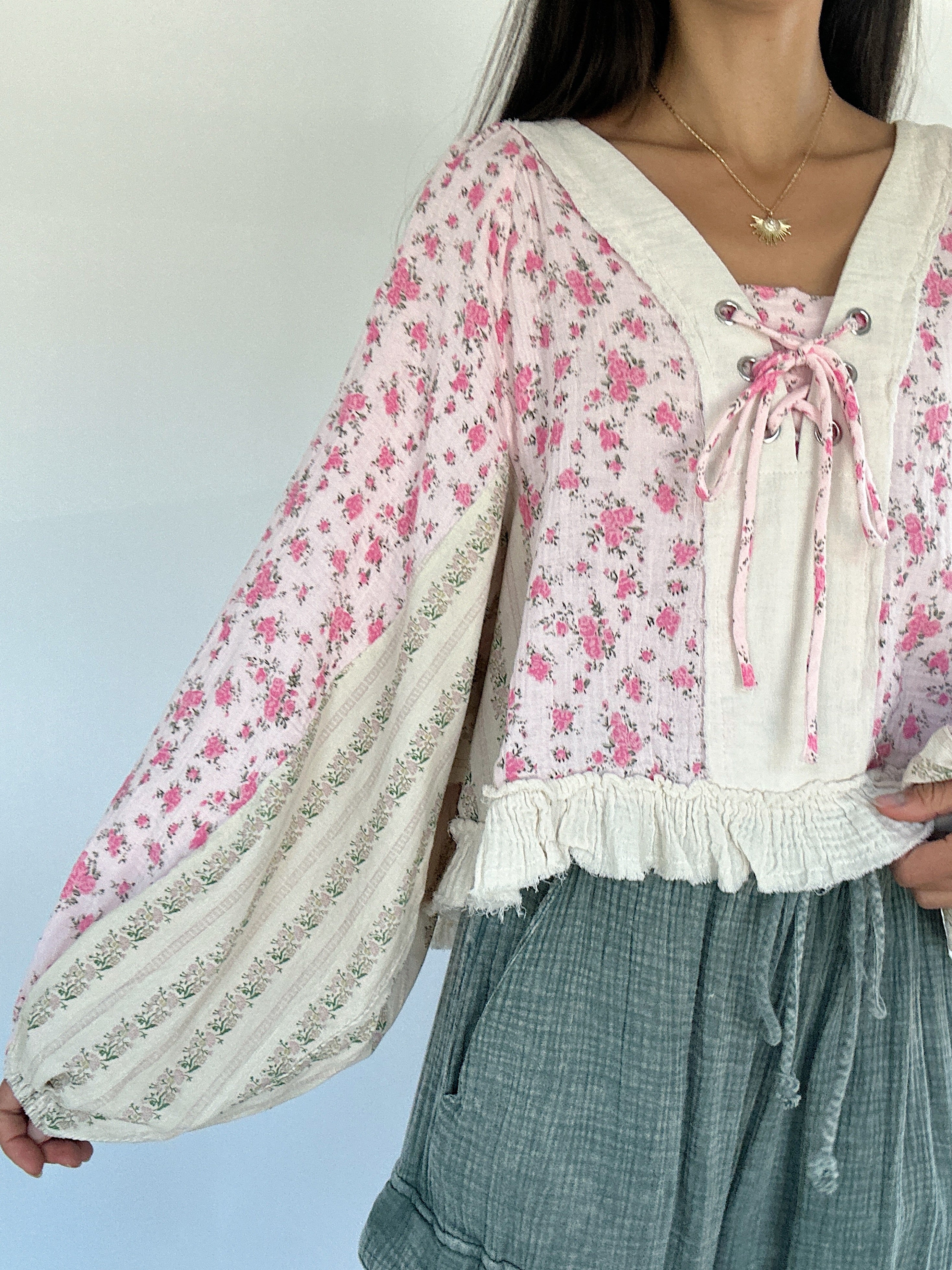 It has a sweet floral mix, vintage-inspired details, and effortlessly relaxed shape. The lace-up neckline, gauzy ruffle hem, and exposed raw seams give it that perfectly undone charm, while the billowy balloon sleeves brings a feminine boho vibe.
