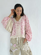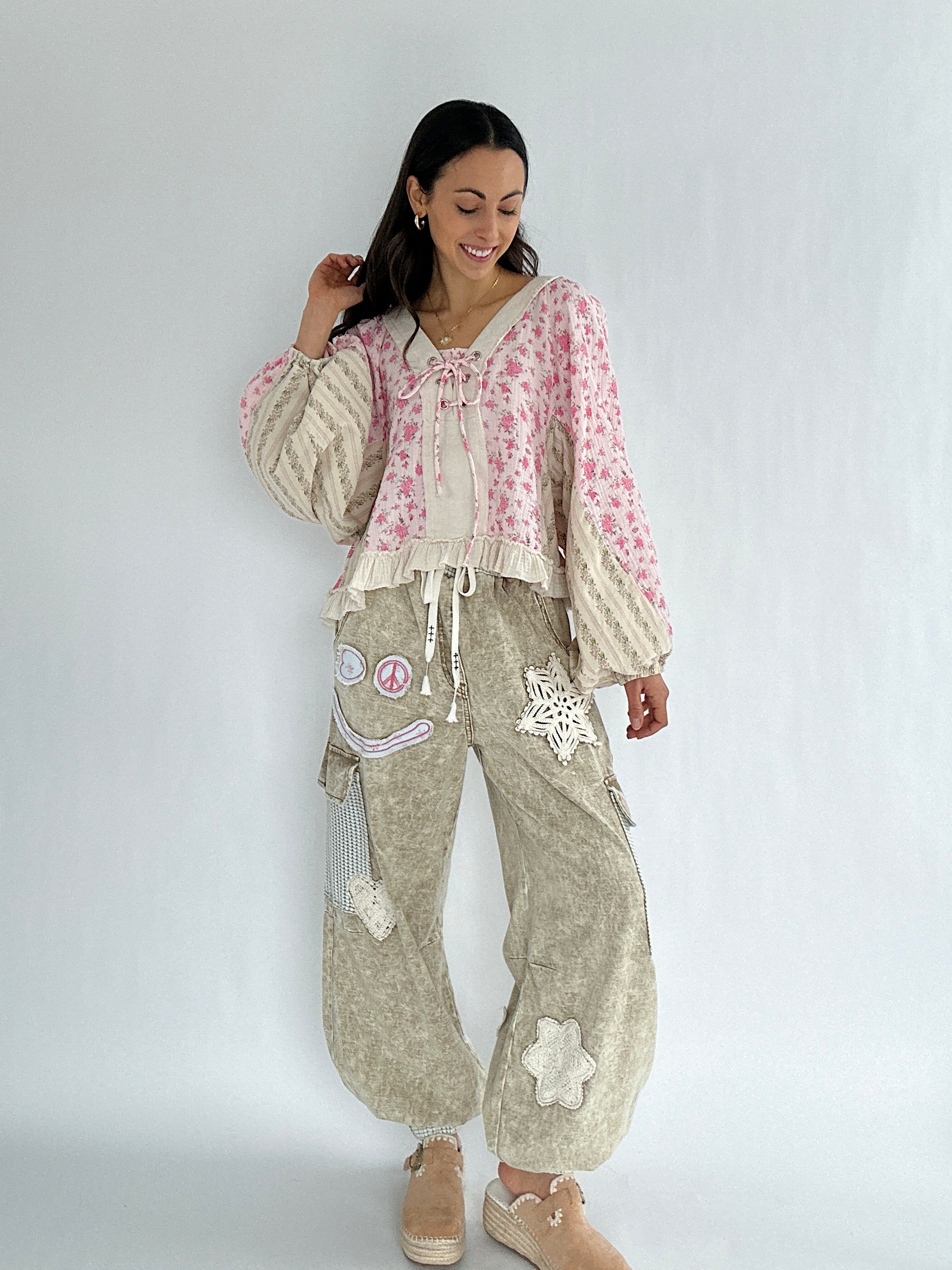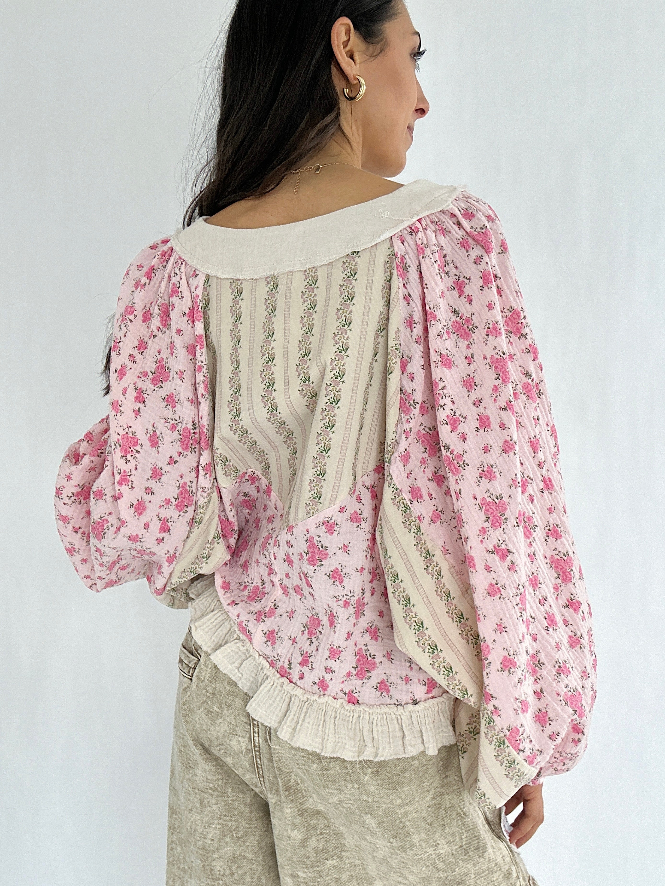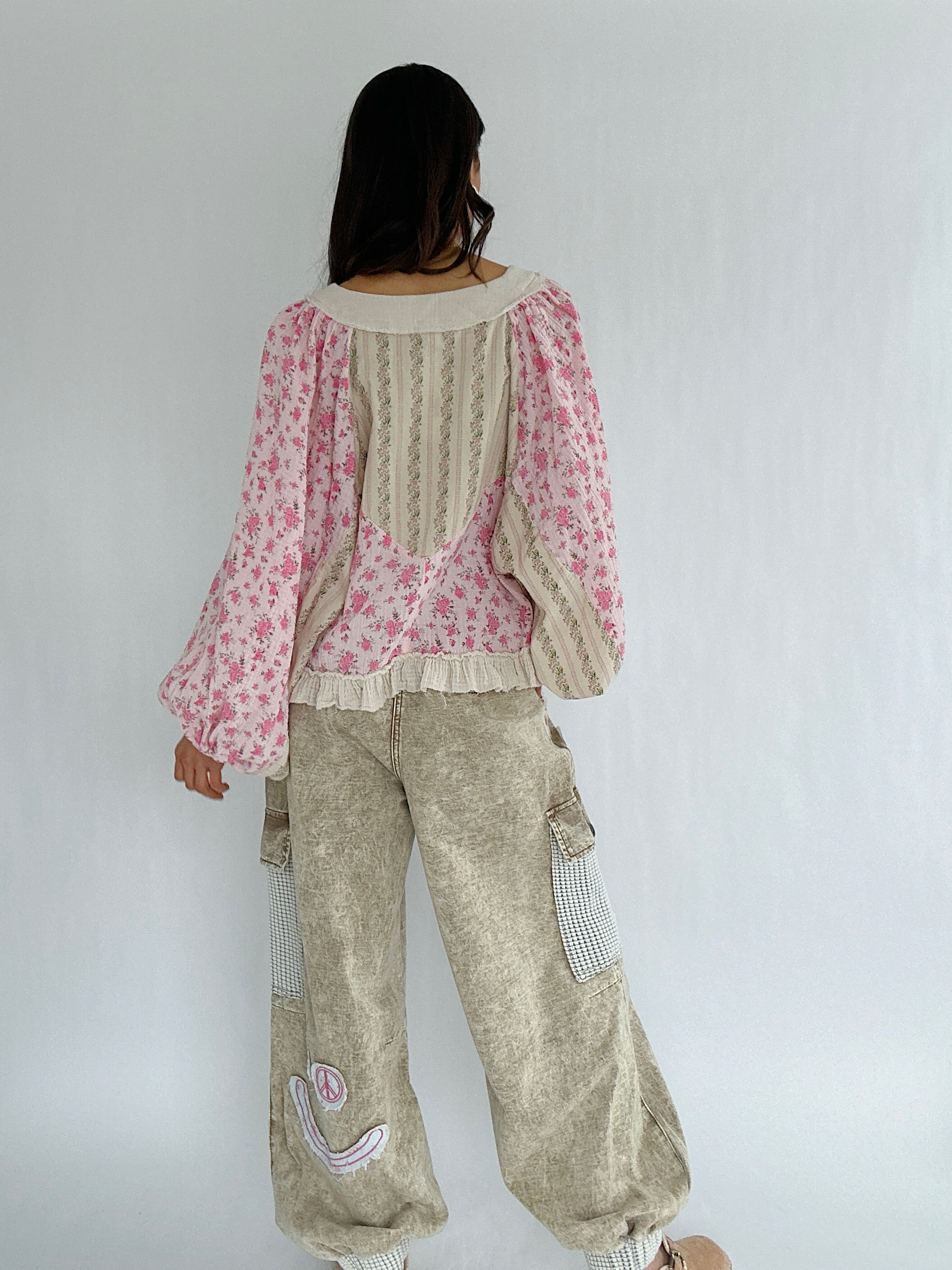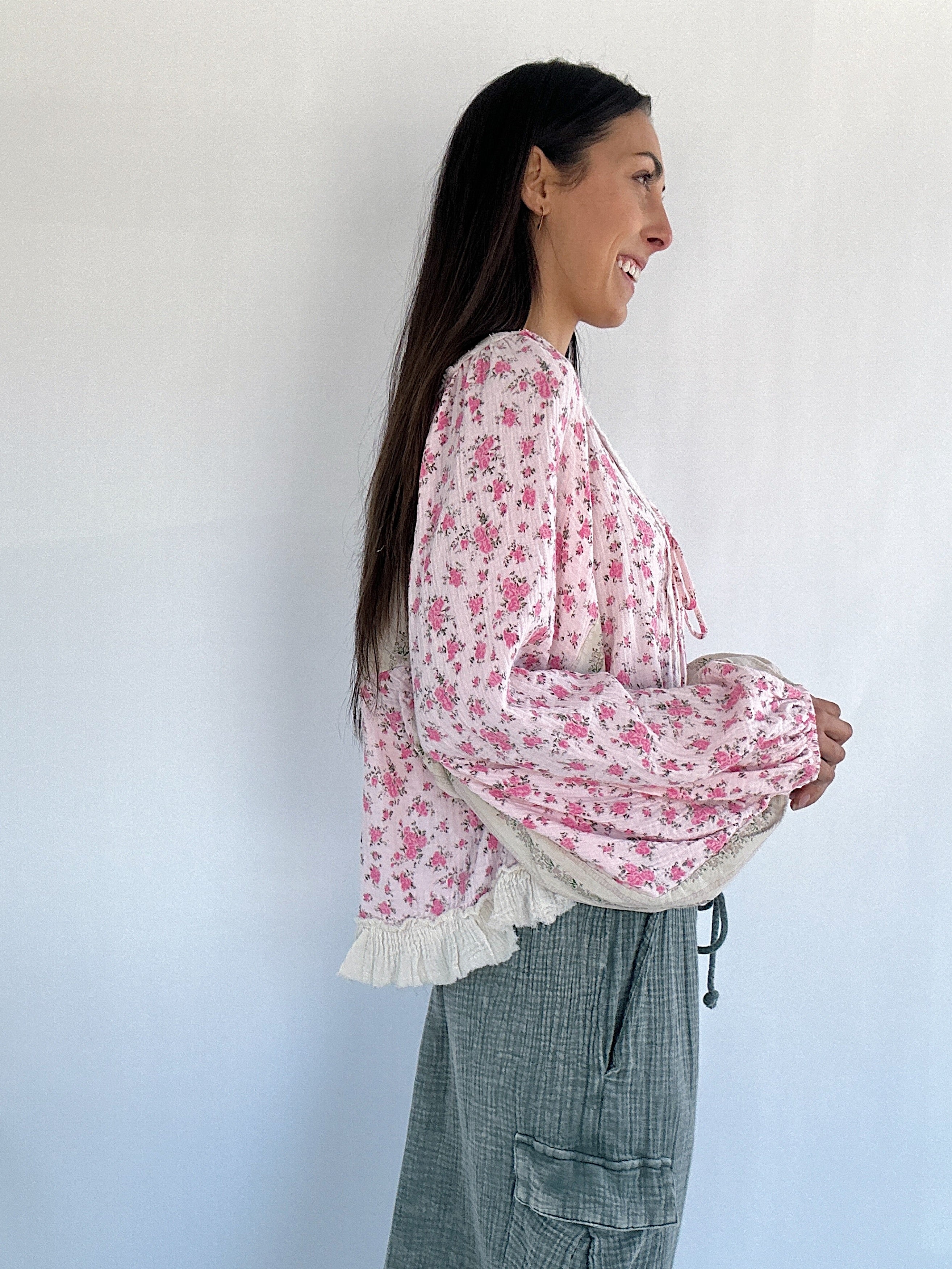 It has a sweet floral mix, vintage-inspired details, and effortlessly relaxed shape. The lace-up neckline, gauzy ruffle hem, and exposed raw seams give it that perfectly undone charm, while the billowy balloon sleeves brings a feminine boho vibe.