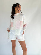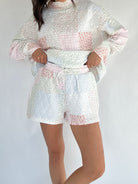 Mellie Quilted Shorts – The kind of cozy you’ll want to live in, the Mellie Quilted Shorts are perfect for lounging, coffee runs, or travel days. Made from soft quilted fabric in the same dreamy pastel floral print as the matching pullover, these shorts are as cute as they are comfortable. The elastic waist and drawstring give you the perfect fit, while the relaxed silhouette makes them easy to wear all day long. Pair with the Mellie Quilted Mockneck or Hoodie for a matching set, or style with a simple tee for an effortless everyday look.