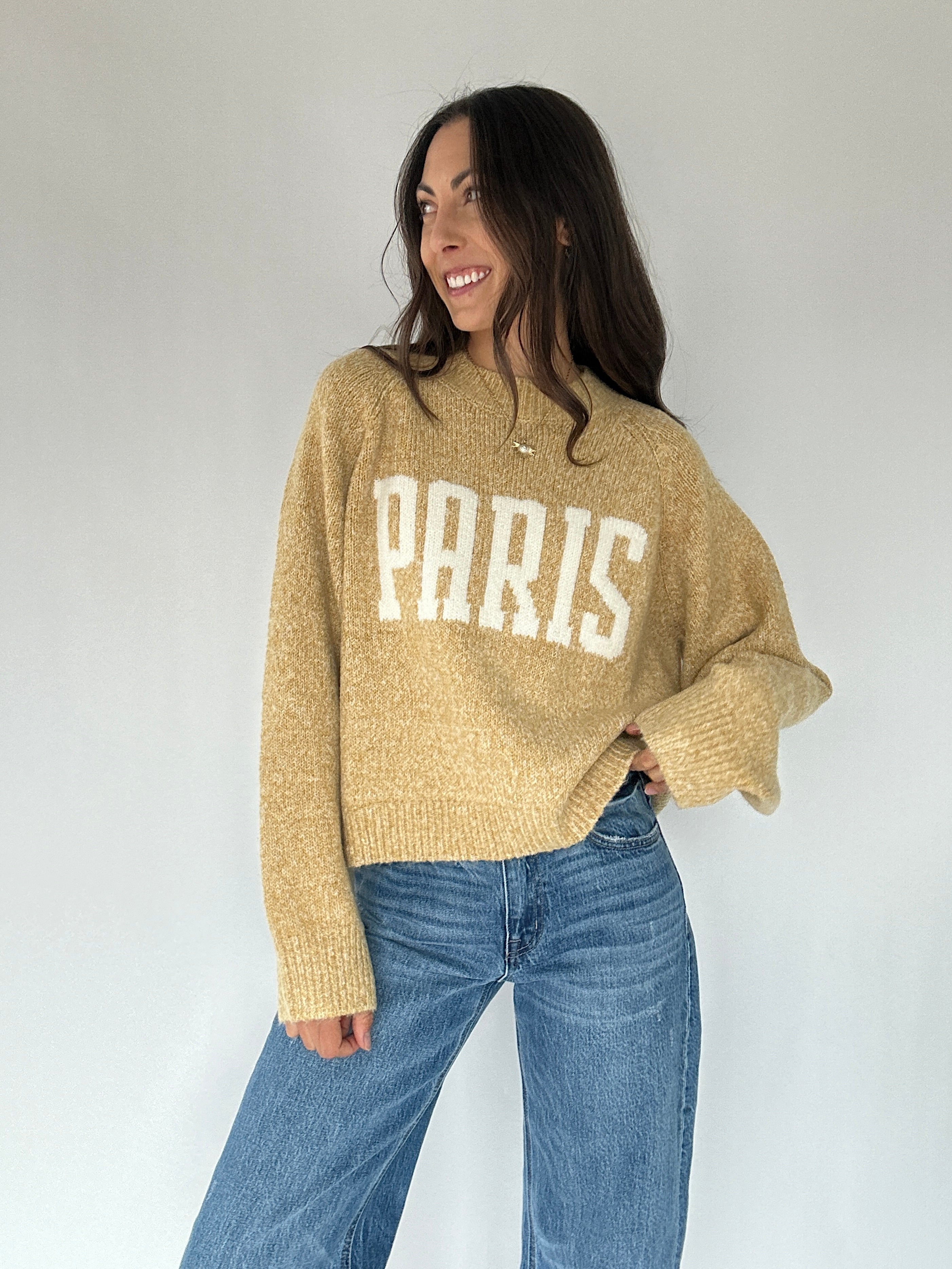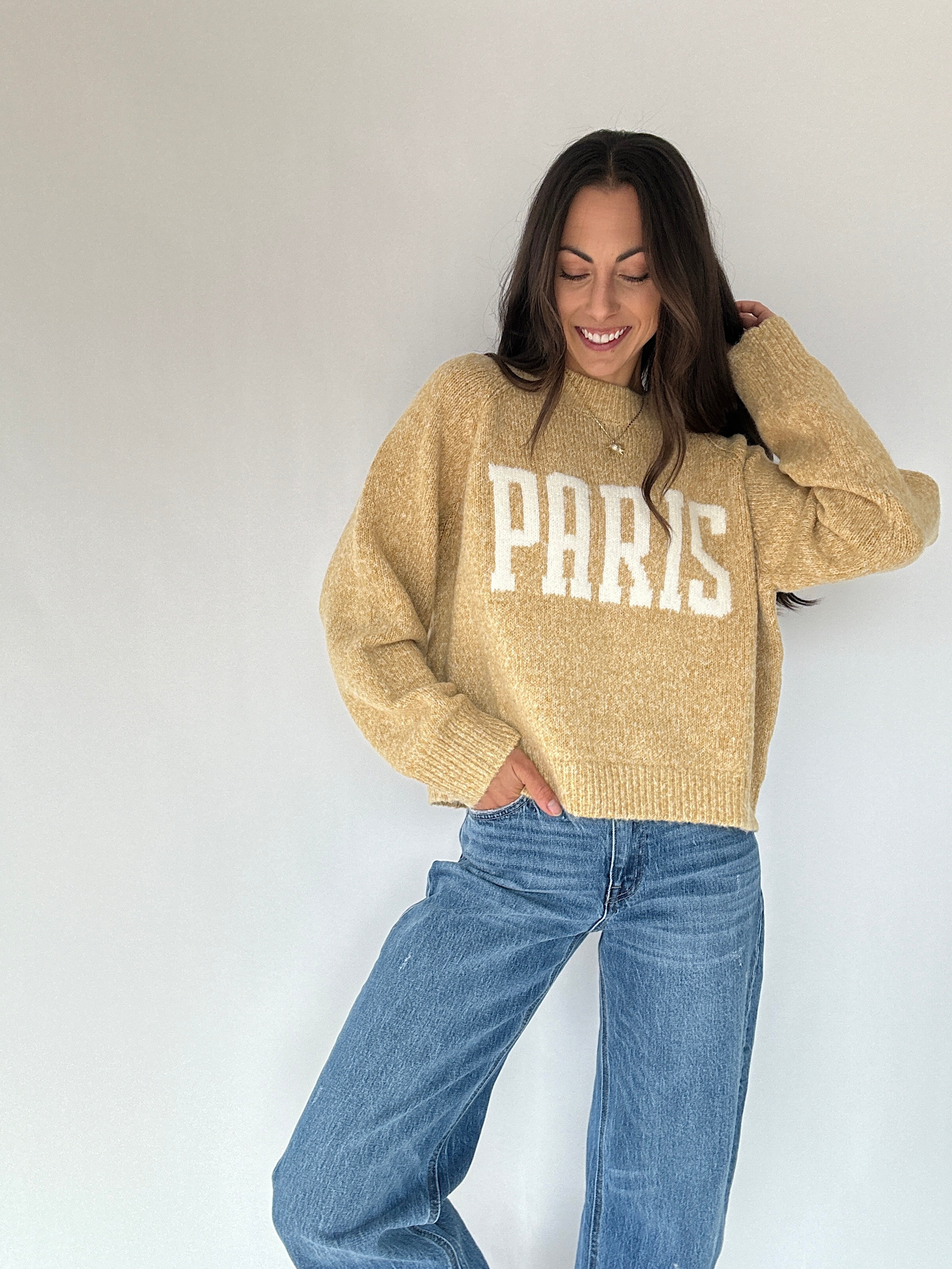 Casual, cozy, and chic—the Paris Sweater brings effortless Parisian charm to your everyday style. In a butter mustard yellow with bold “PARIS” lettering across the front, it features a classic crew neckline, ribbed hems, and a relaxed loose fit. Perfect for layering or wearing on its own, it’s a standout piece that makes even the simplest outfit feel chic!