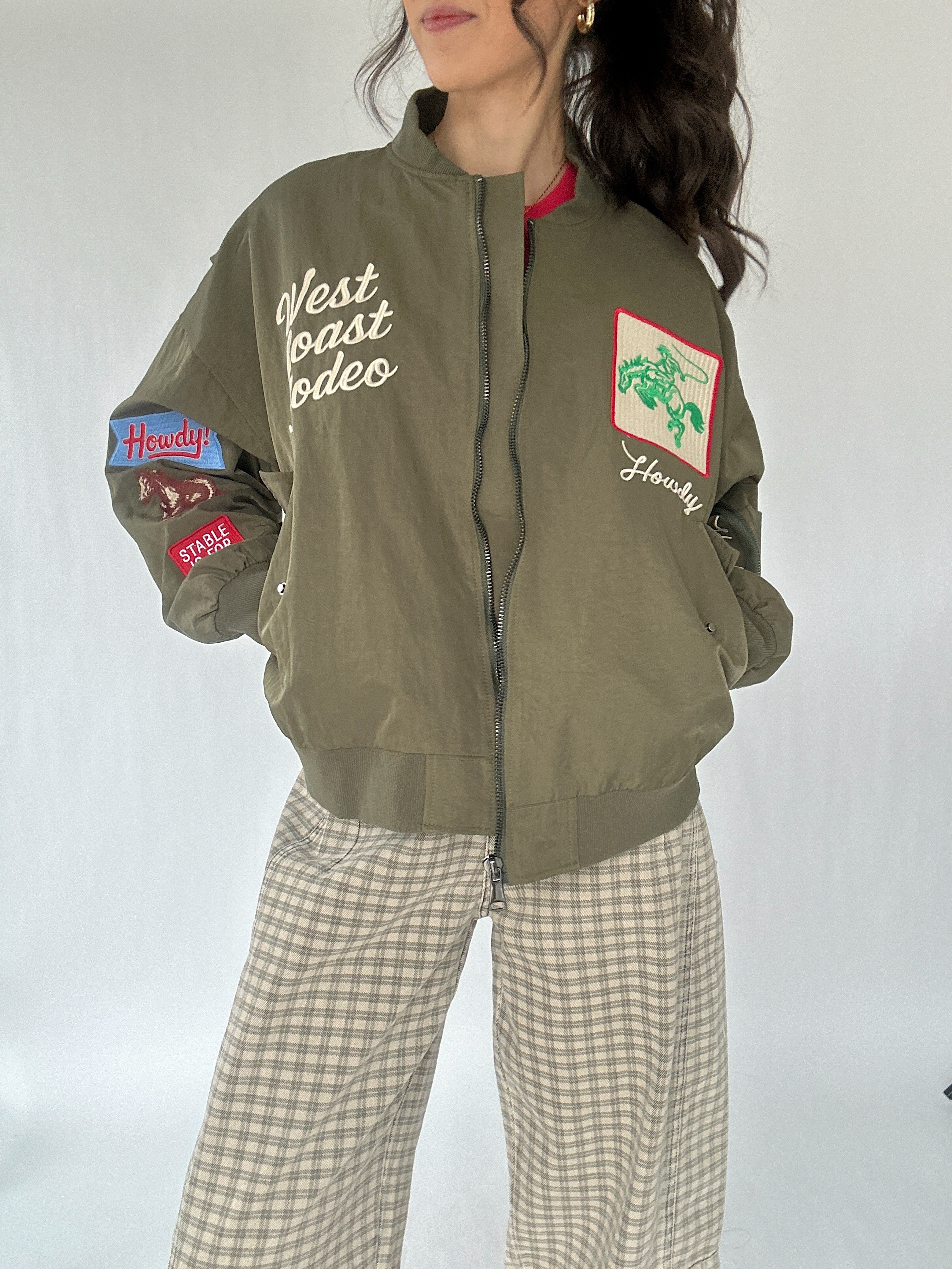 From festival weekends to city streetwear and casual nights out, the West Coast Rodeo Bomber Jacket brings western-inspired style with a modern edge. The olive green nylon shell features bold cowboy embroidery and “West Coast Rodeo” lettering, making it a standout layer for any outfit. Lightweight but structured, it’s easy to throw over tees, dresses, or hoodies for an effortless, all-season statement.