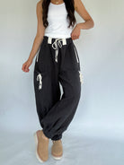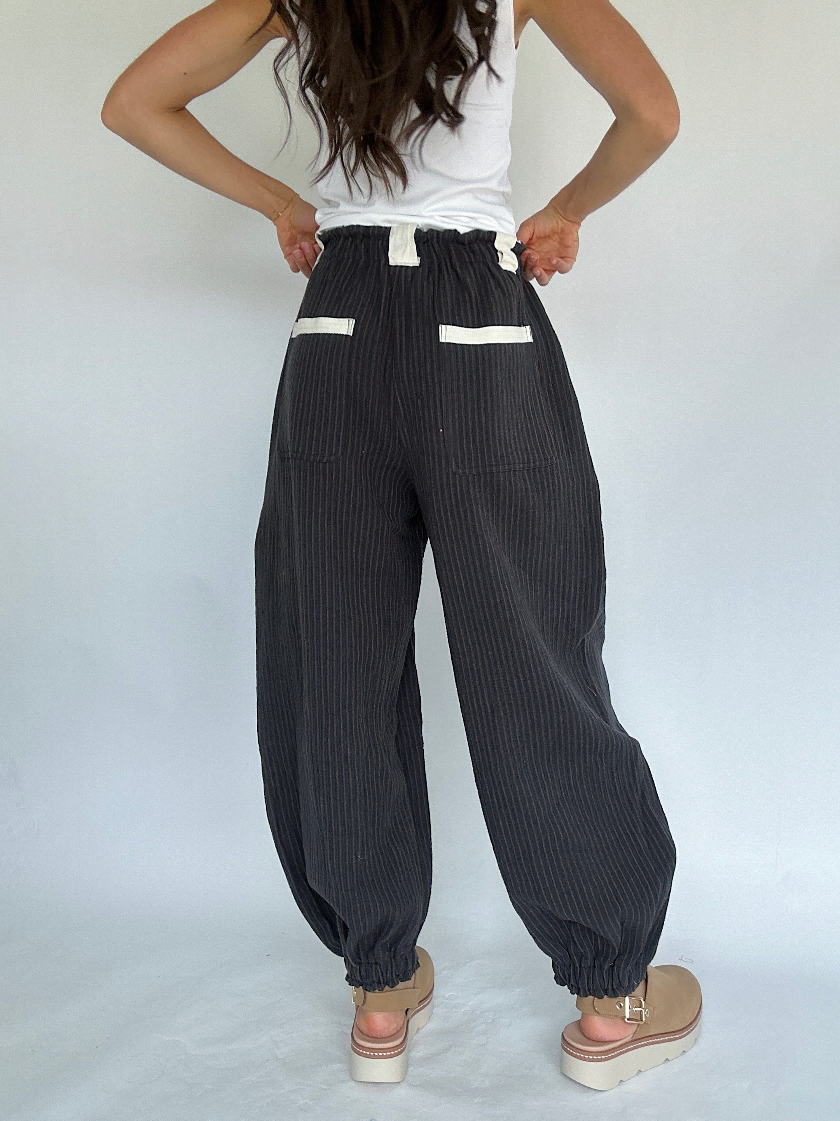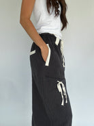 Perfect for coffee runs, casual days at work, or weekend exploring - the Bowery Striped Pants are both cute and comfy! The soft cotton-linen blend and relaxed jogger fit make them an instant favorite, while the pinstripes and contrasting ties add the perfect details. They have a wide leg, relaxed fit with an elastic waist and adjustable drawstring that makes them so comfy and a pair you will want to reach for day in and day out!