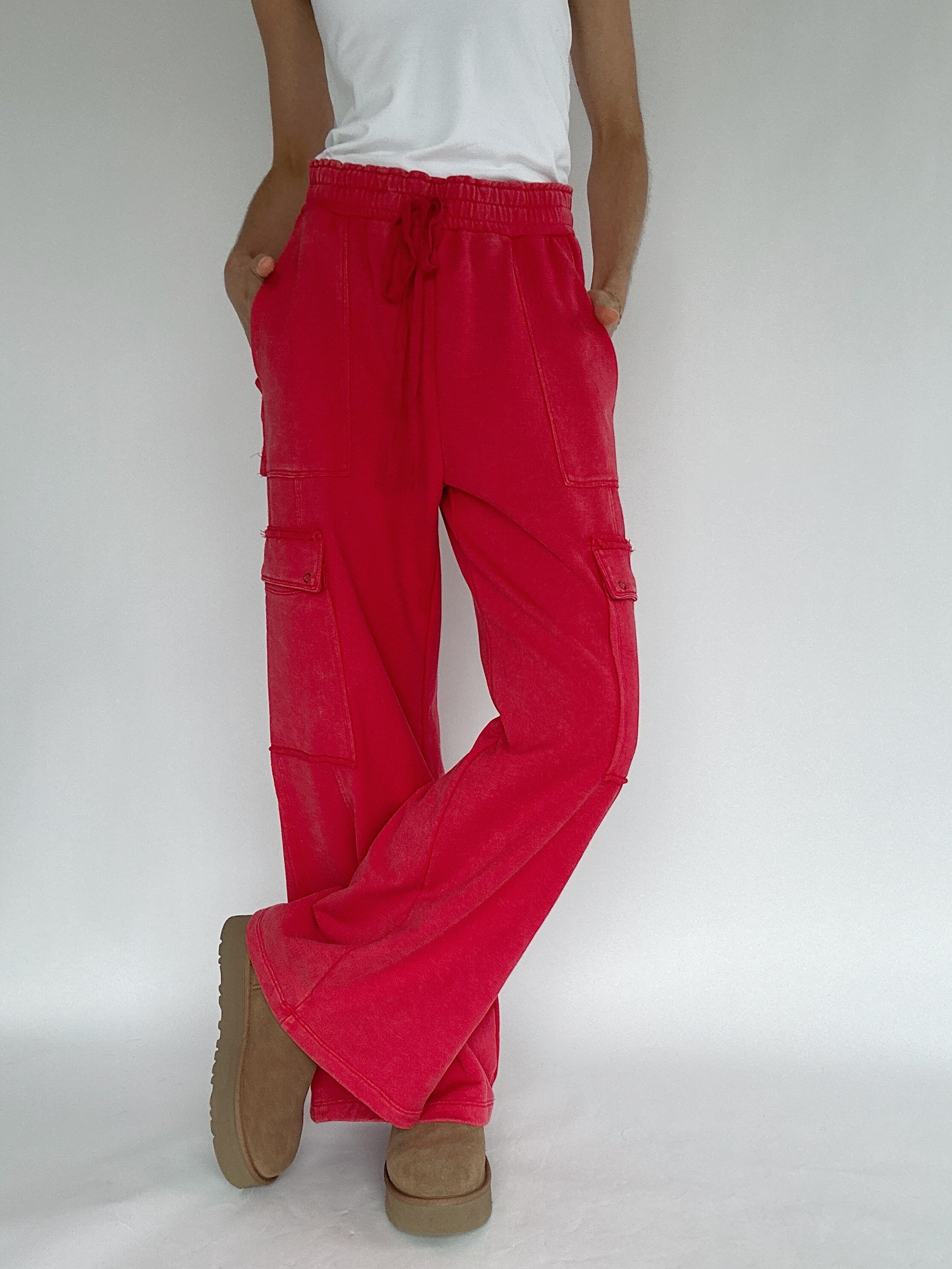 Familiar Thoughts Wide Leg Pants – Add a pop of color to your laid-back looks with these mineral-washed red wide-leg pants. Made from soft French terry knit, they feature an elastic waistband with an adjustable drawstring, front and side cargo pockets, and raw seam details for a relaxed, lived-in feel. Comfortable yet on-trend, they’re the perfect pair for cozy days, travel, or casual holiday outings.