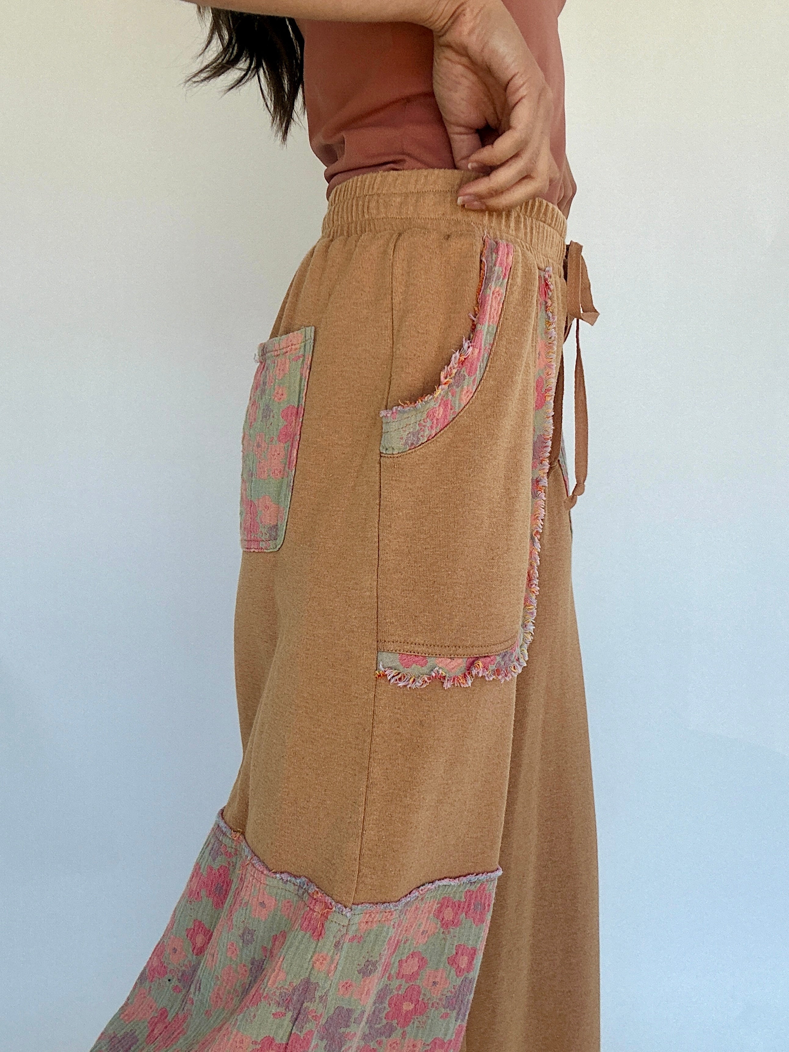 These are not your average sweats. Our Through Seasons Wide Leg Pants take the comfort you love and give it a playful, patchy upgrade. With a relaxed wide-leg fit and soft mineral-washed terry fabric, they're made for cozy days, coffee runs, and weekend errands—but the floral contrast patches make them feel cute enough to style year-round. Whether you’re lounging at home or layering up for a farmers market stroll, these pants are an easy yes.
