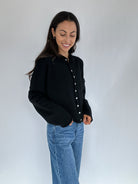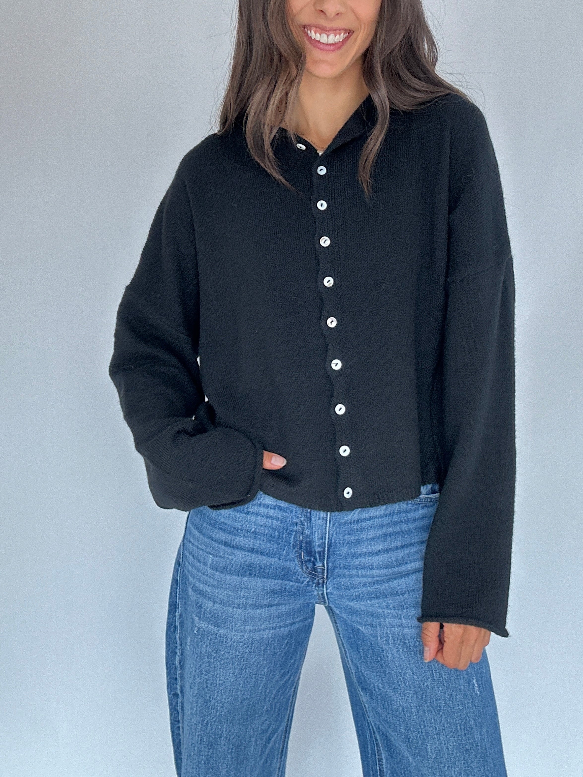 This black cardigan is soft and light weight with a full button front and is the perfect layering piece. Or wear it alone with some jeans or wide leg pants!