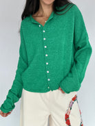 This kelly green cardigan is soft and light weight with a full button front and is the perfect layering piece. Or wear it alone with some jeans or wide leg pants!