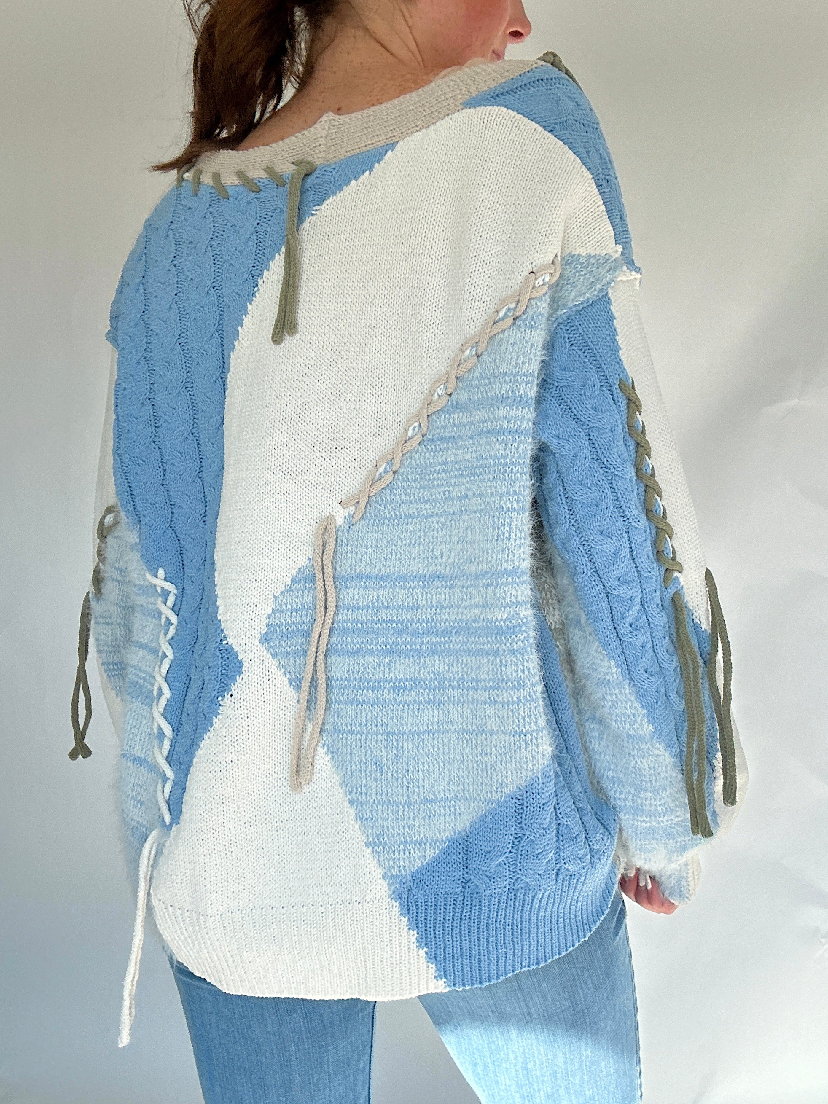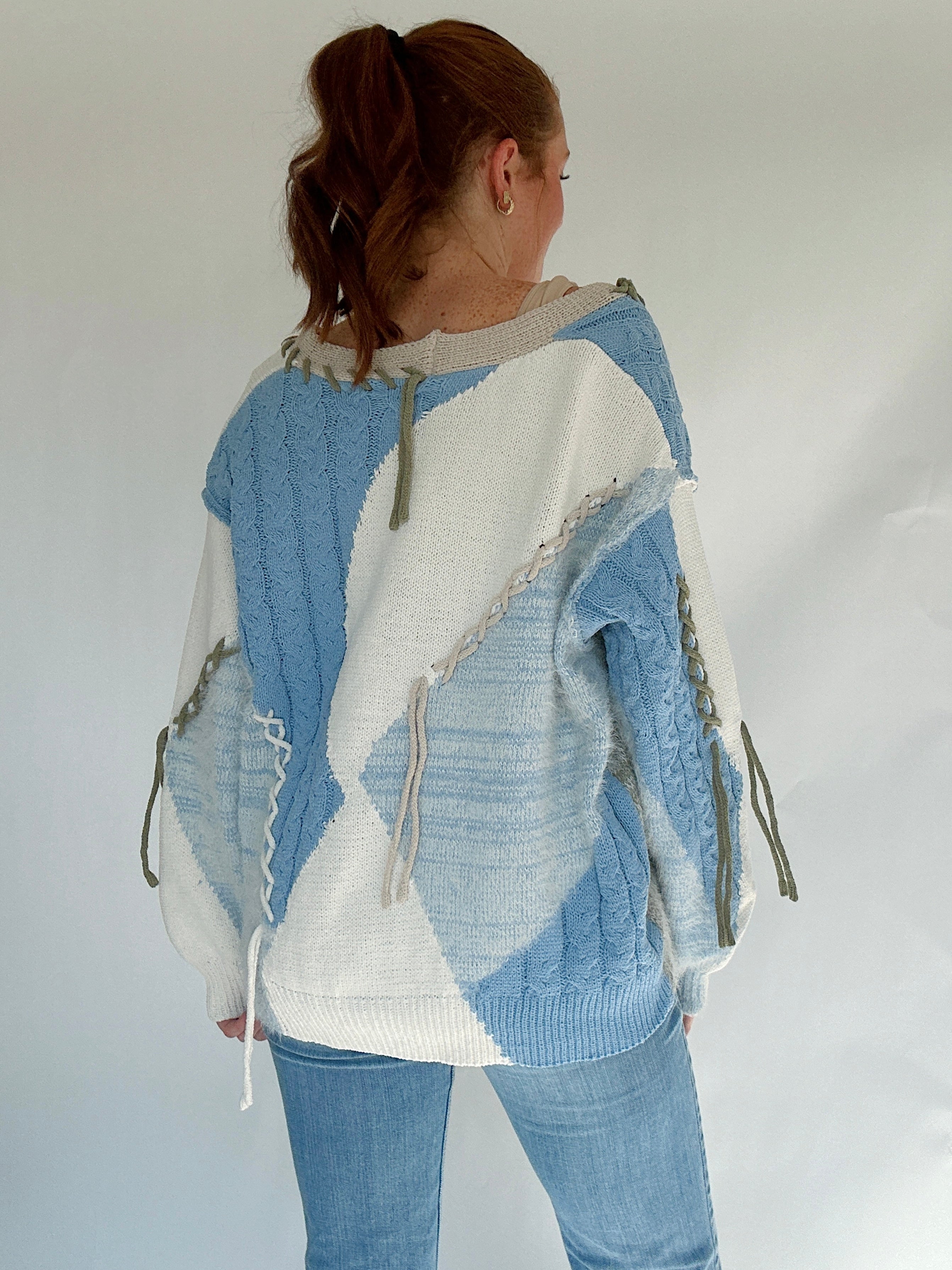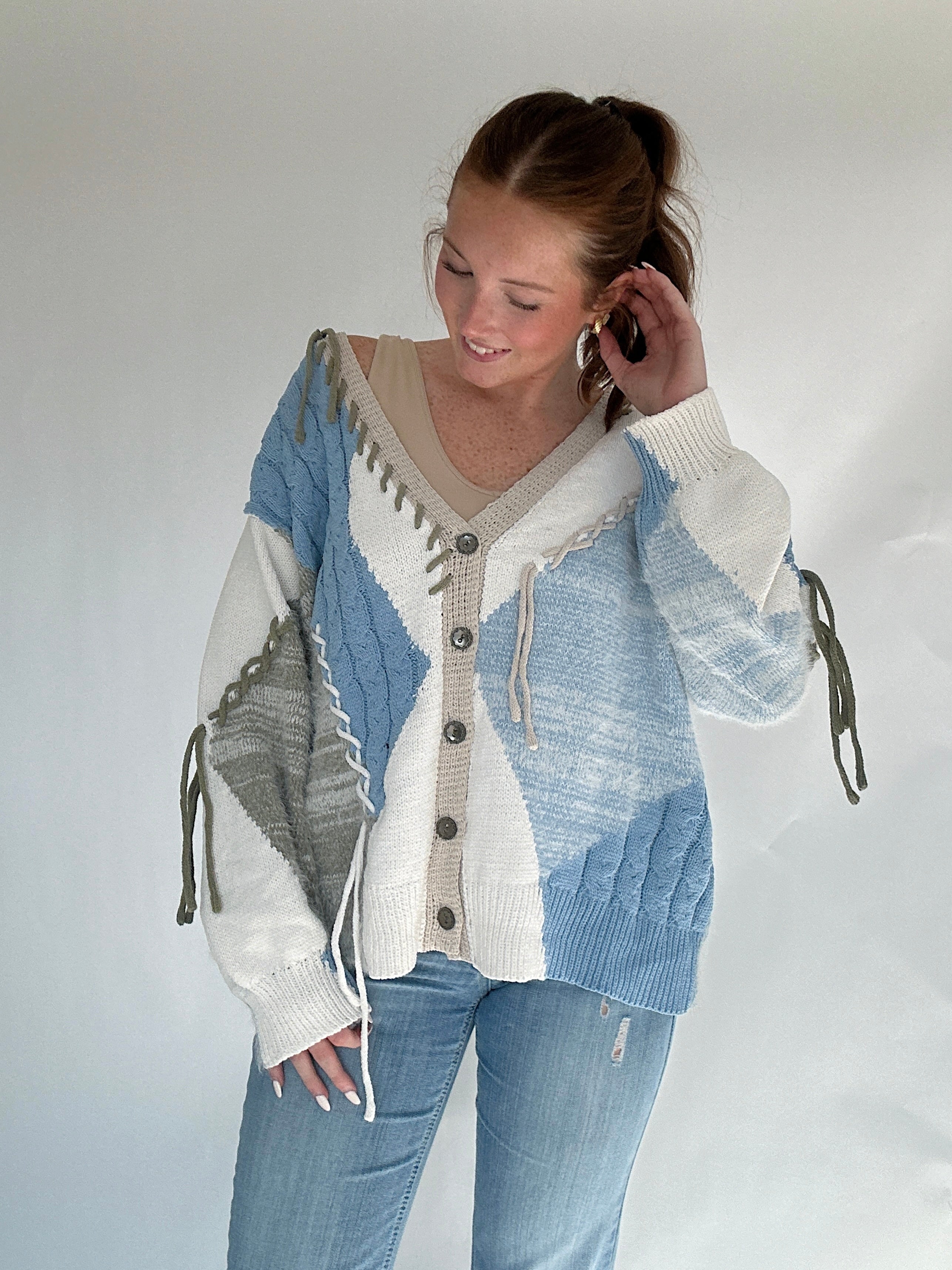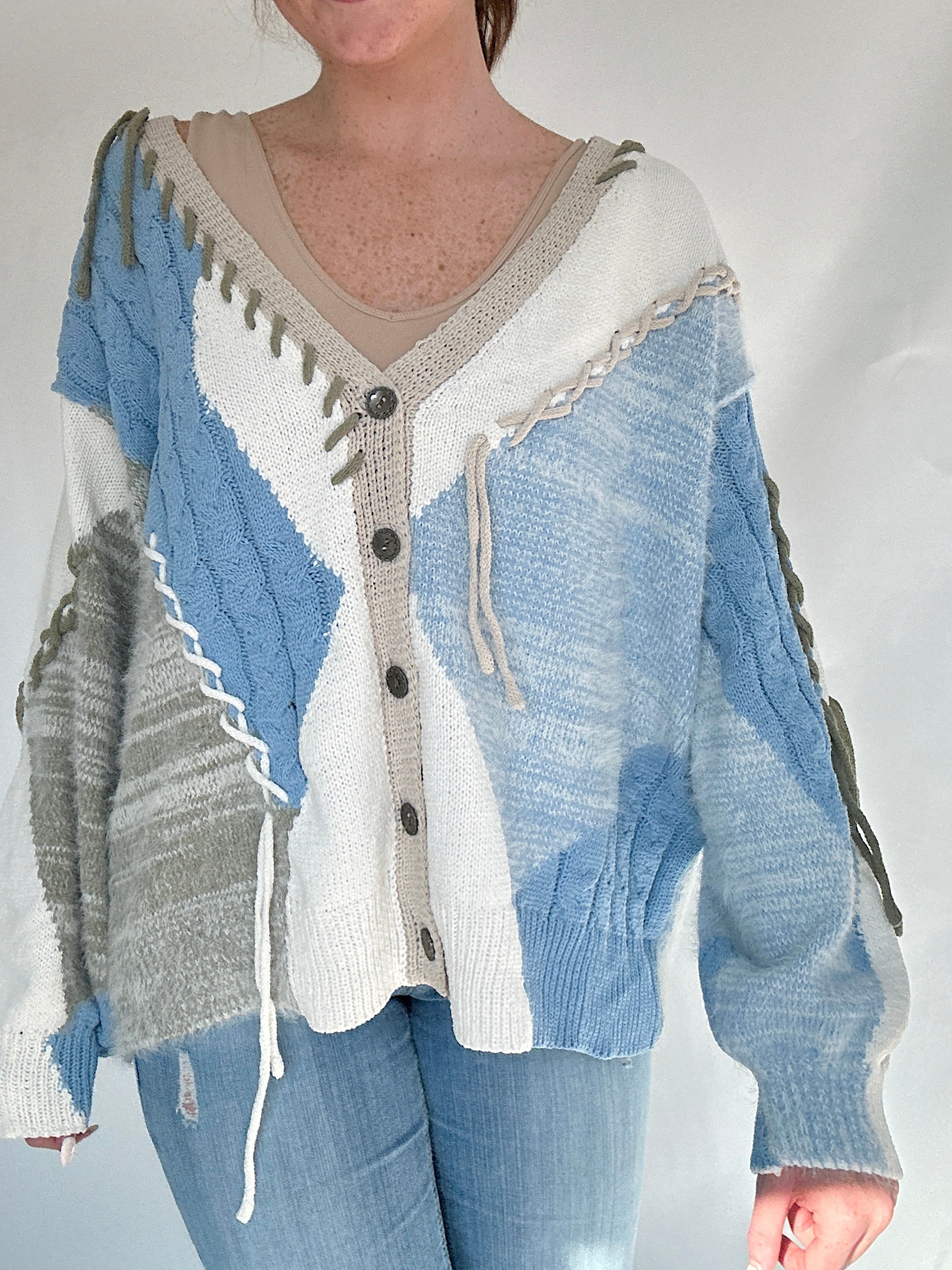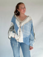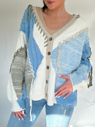 The kind of sweater that feels just as right for curling up at home as it does for layering on a breezy day out, the Reinvent Me Cardigan is cozy with a touch of edge. Designed in a soft chenille blend with mixed cable knit and mohair textures, it’s finished with frayed details that give it that perfectly undone look. The blue base is accented with cream and grey tones, while the button-front, dropped shoulders, and balloon sleeves keep the fit relaxed and slouchy.