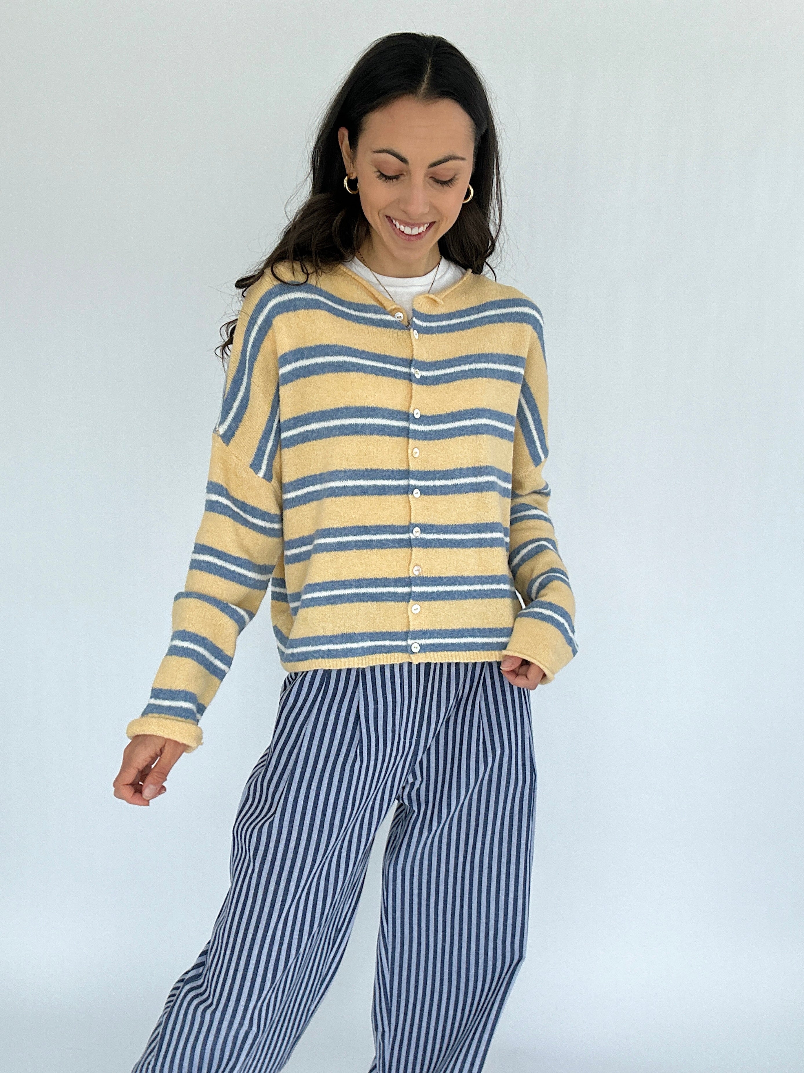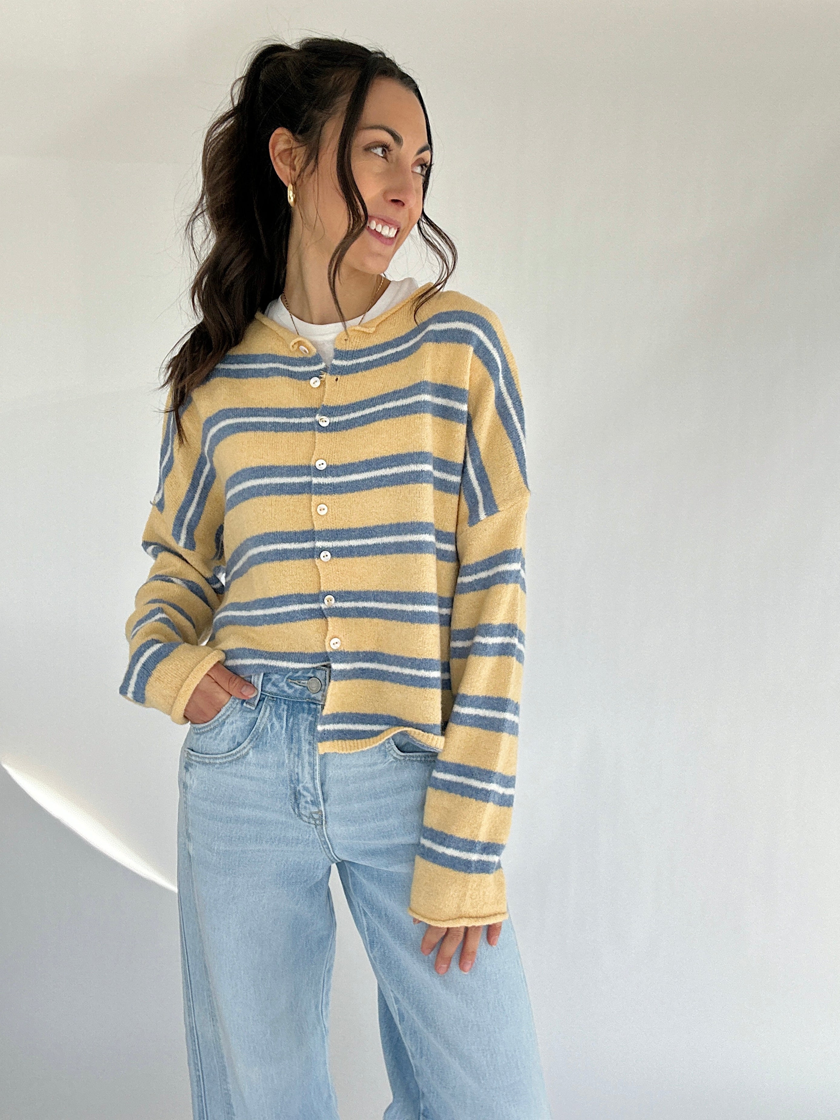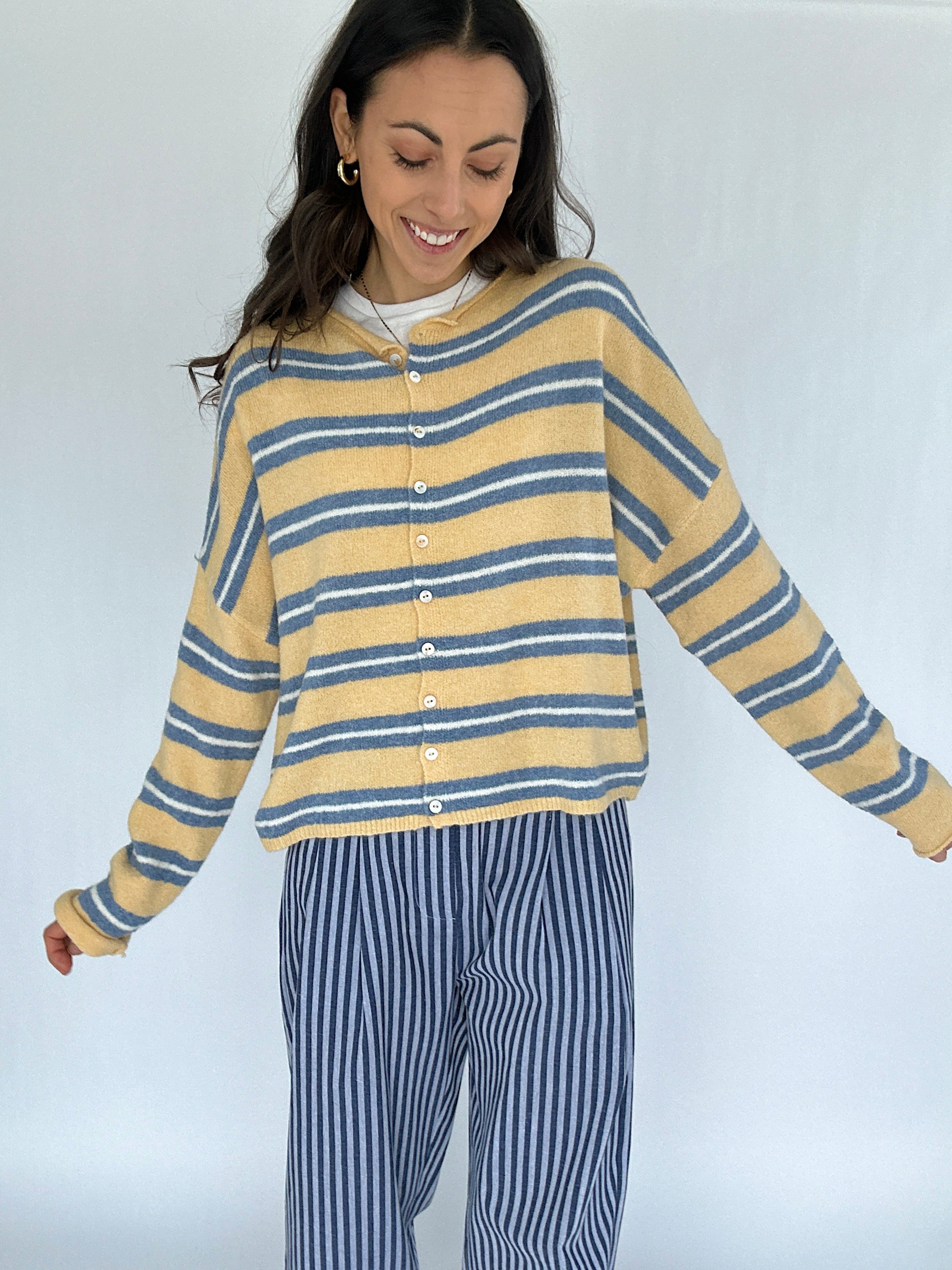 This sweet butter yellow cardigan is soft and light weight with blue and white horizontal striped pattern, full button front and is the perfect layering piece. Or wear it alone with some jeans or wide leg pants!