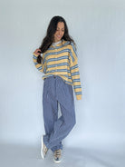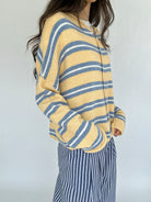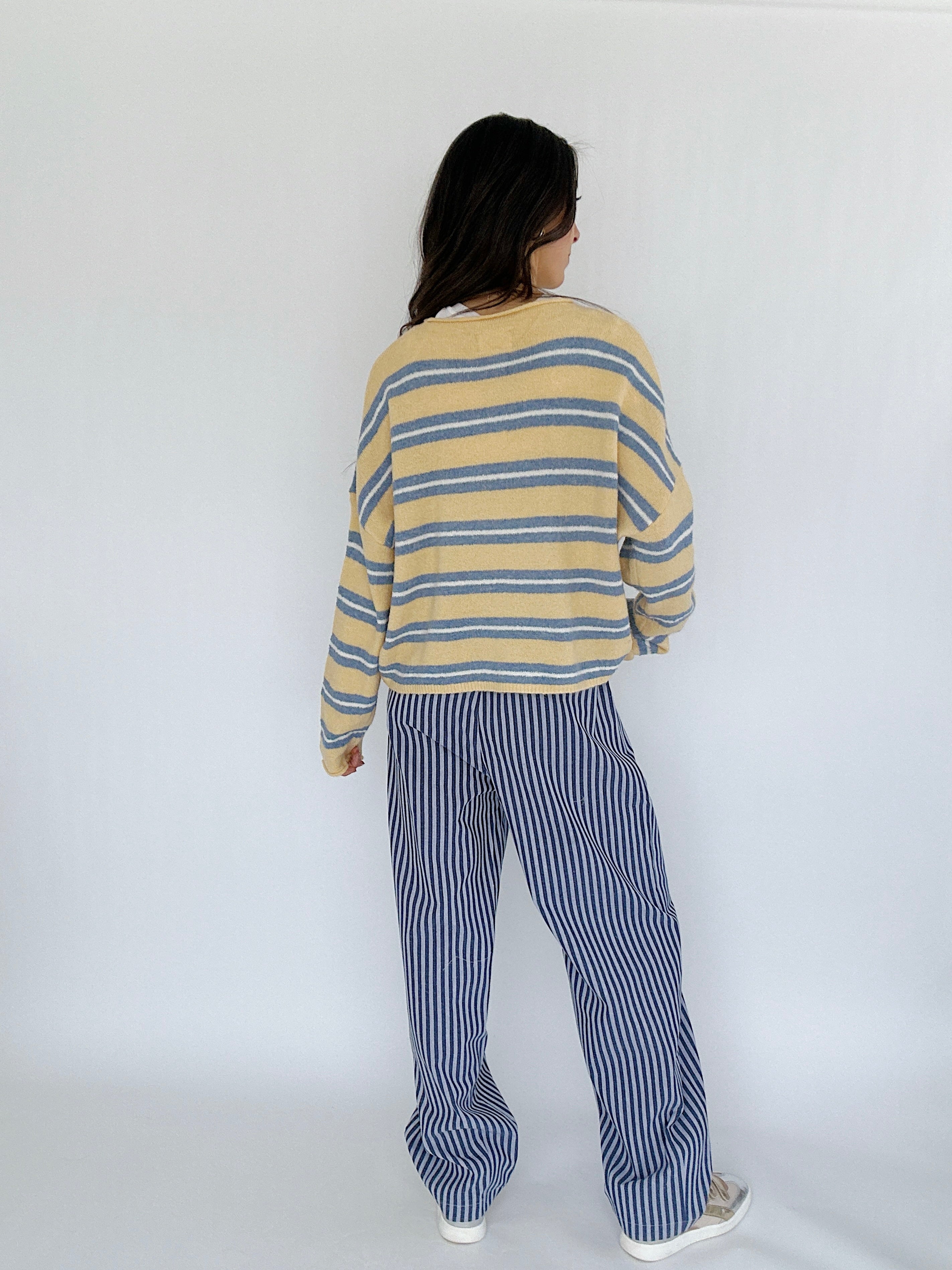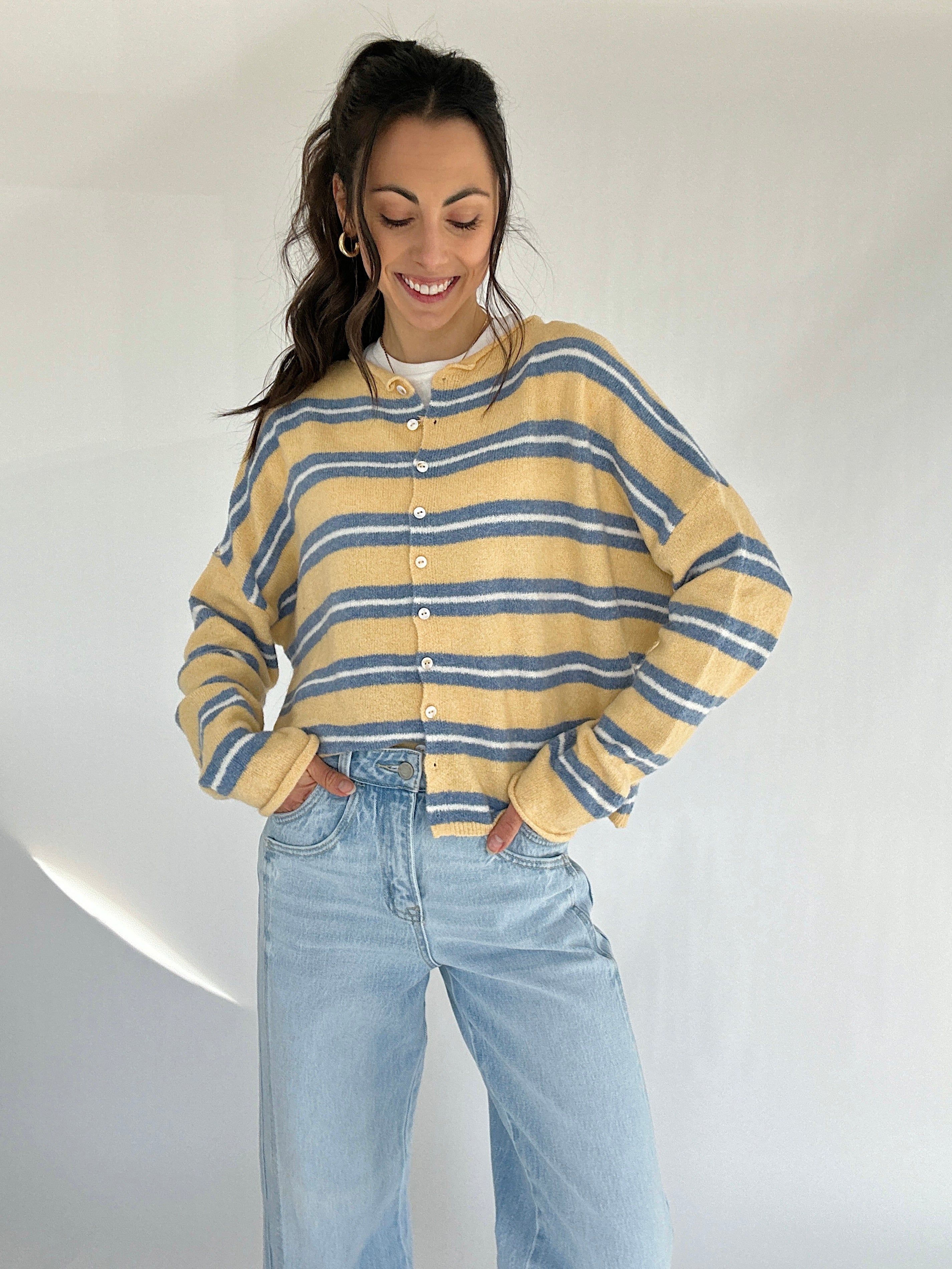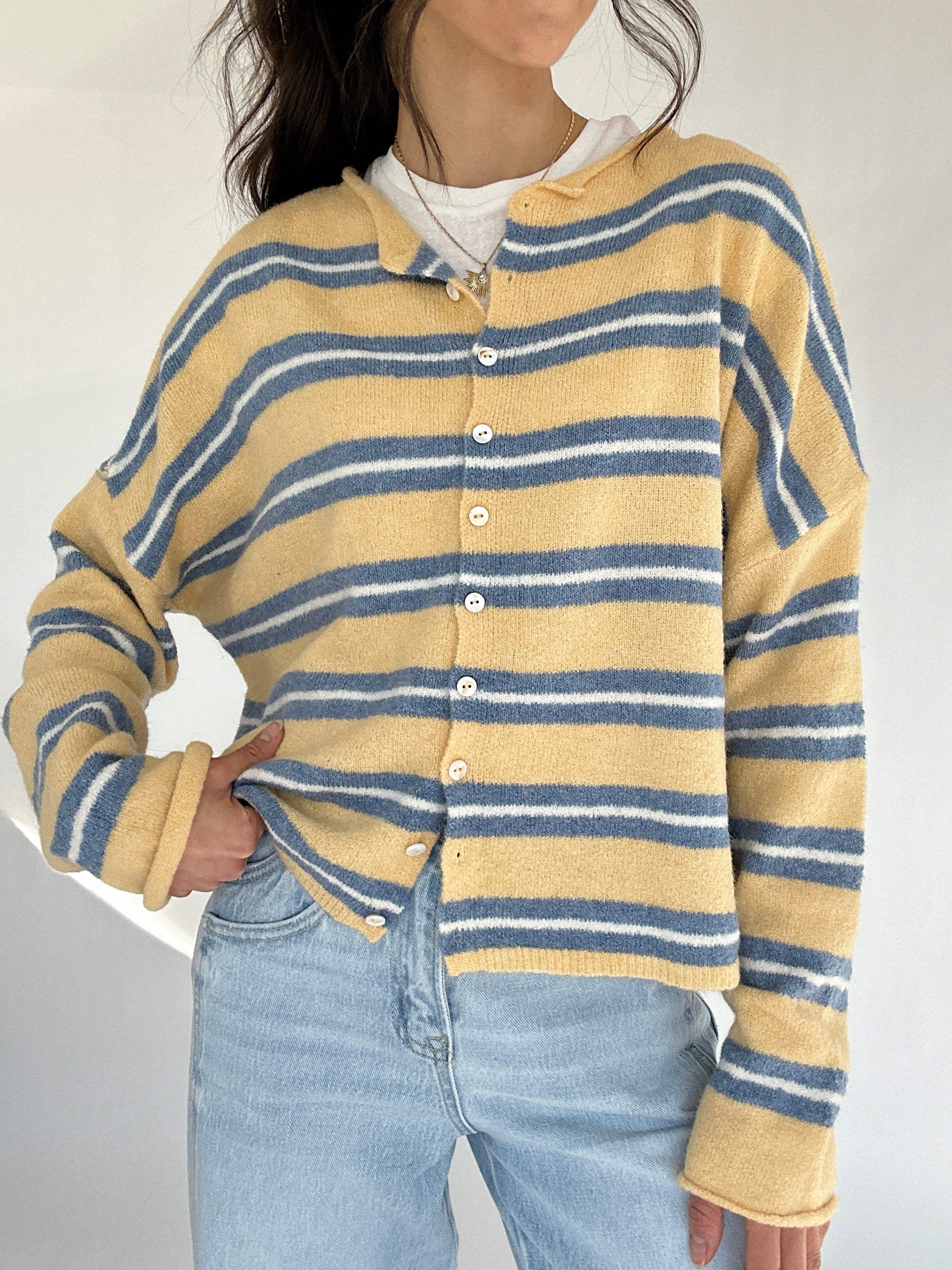 This sweet butter yellow cardigan is soft and light weight with blue and white horizontal striped pattern, full button front and is the perfect layering piece. Or wear it alone with some jeans or wide leg pants!