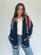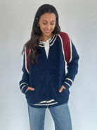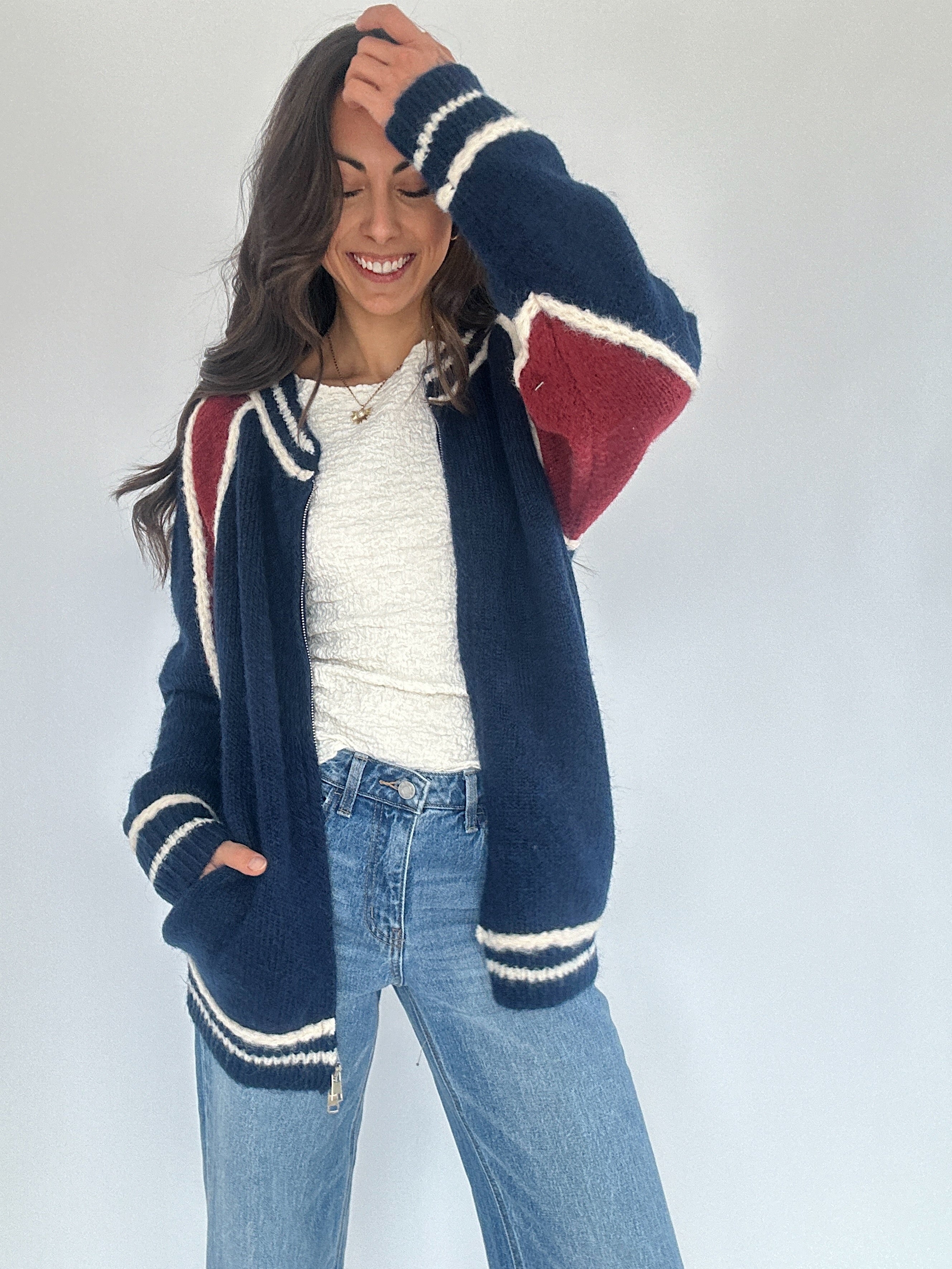 This denim blue and burgundy colorblocked cardigan has a zip up front and braided contrast trimming. It has a relaxed fit and side pockets - making it the perfect jacket/cardigan combo!