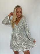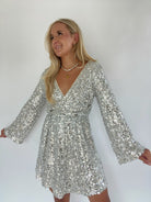 This silver all over sequin dress is THE party dress! It has a cross v neckline, waist tie and open hole back. Pair with heels or boots for a night out!