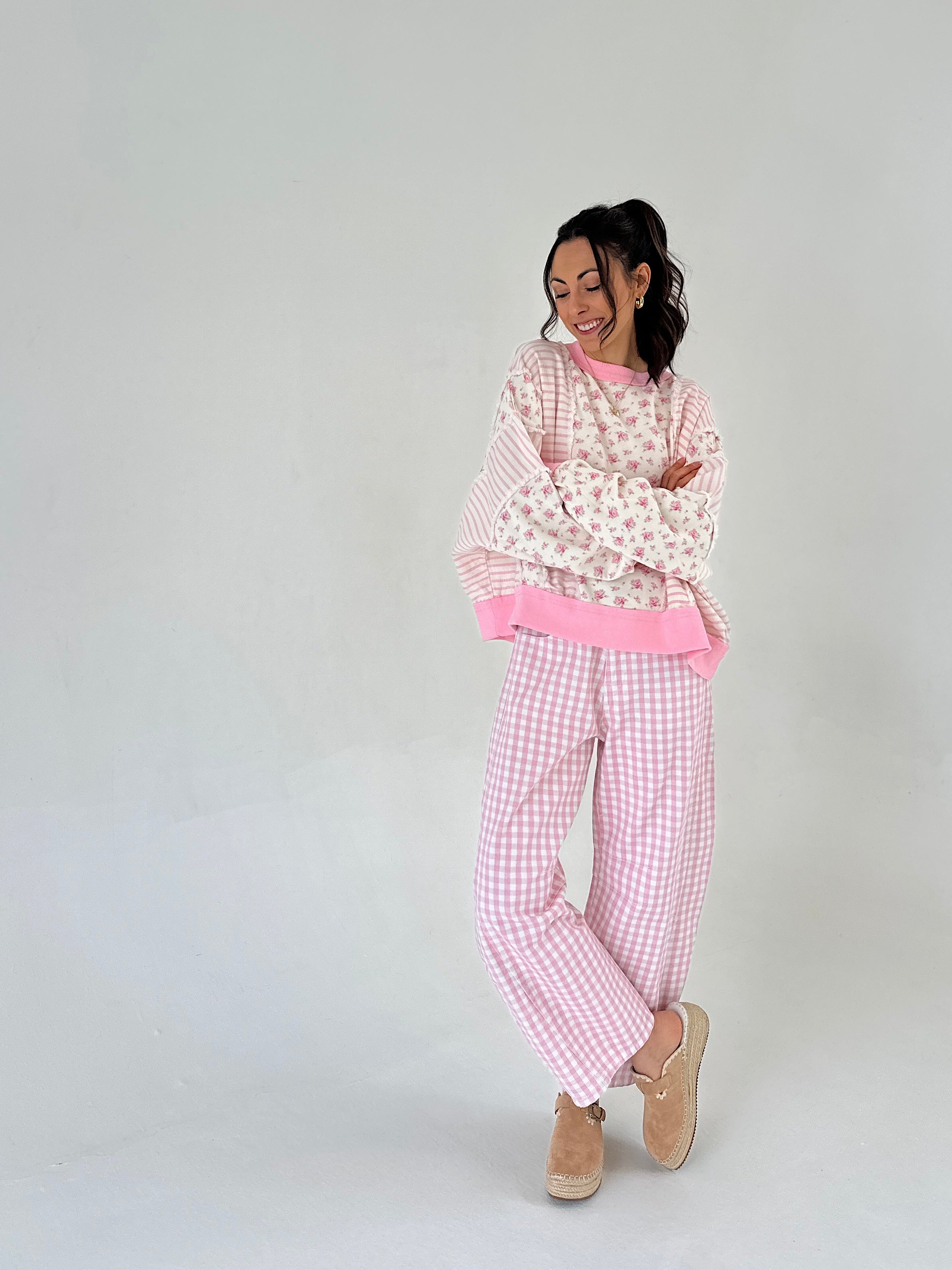 If you love a piece that feels vintage, feminine, and just a little unexpected — this is it. The Blushing Floral Striped Pullover mixes ditsy floral French terry with striped denim patchwork for a look that feels collected and one-of-a-kind. It has that effortless “found it at the cutest boutique” energy, but it’s soft and wearable enough for everyday.