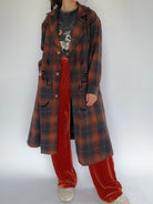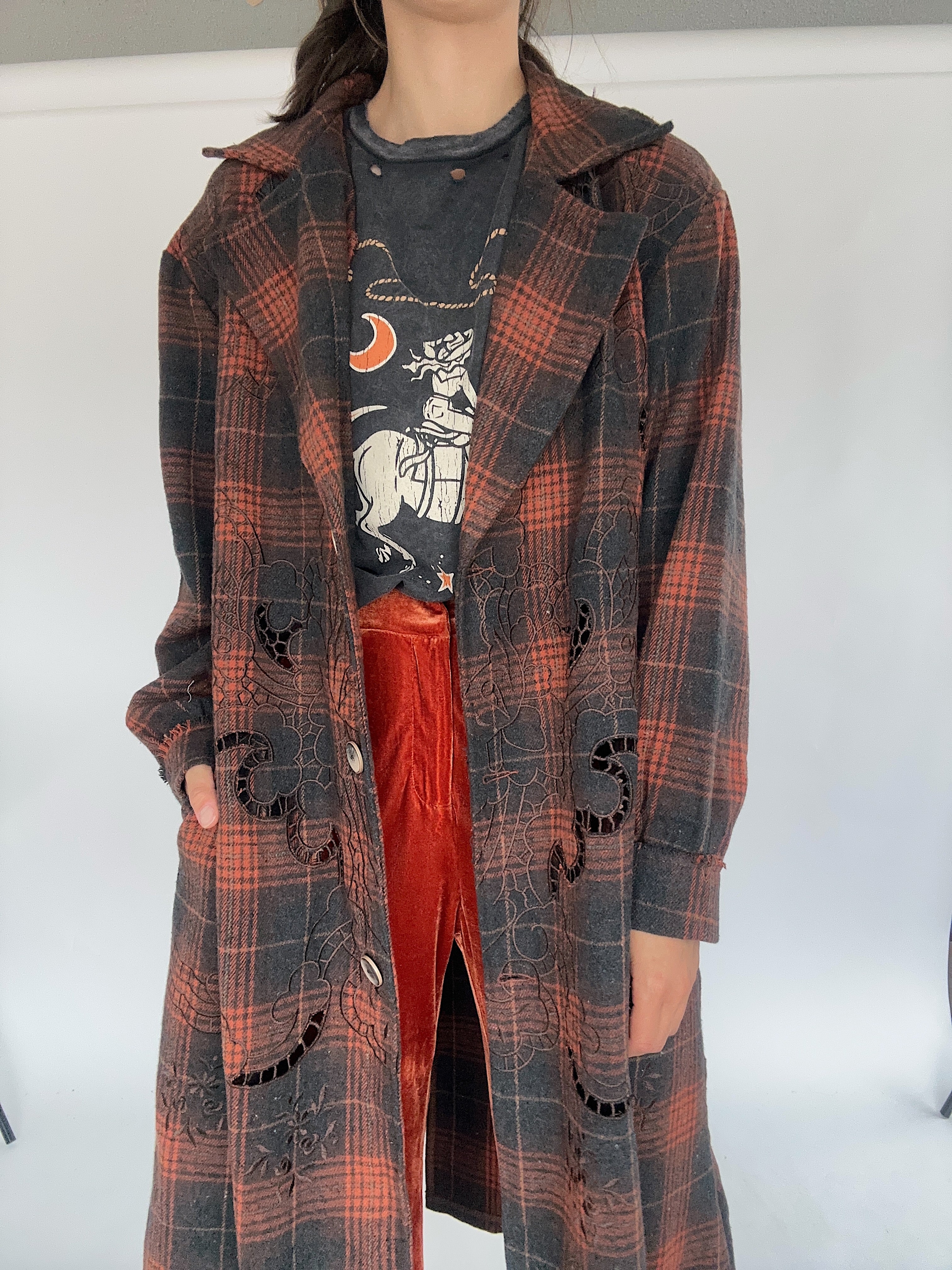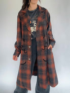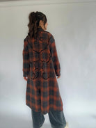 Perfect for weekend outings, chilly coffee runs, or layering over your favorite knits, the Dorothea Plaid Jacket is a statement piece with a cozy oversized feel. Designed in a charcoal and rust plaid, this longline jacket features contrast stitch details, embroidered cut-out patterns throughout, and a lapel collar for that classic touch. A split at the back hem keeps the fit relaxed and easy to wear, while the oversized silhouette makes it perfect for layering.
