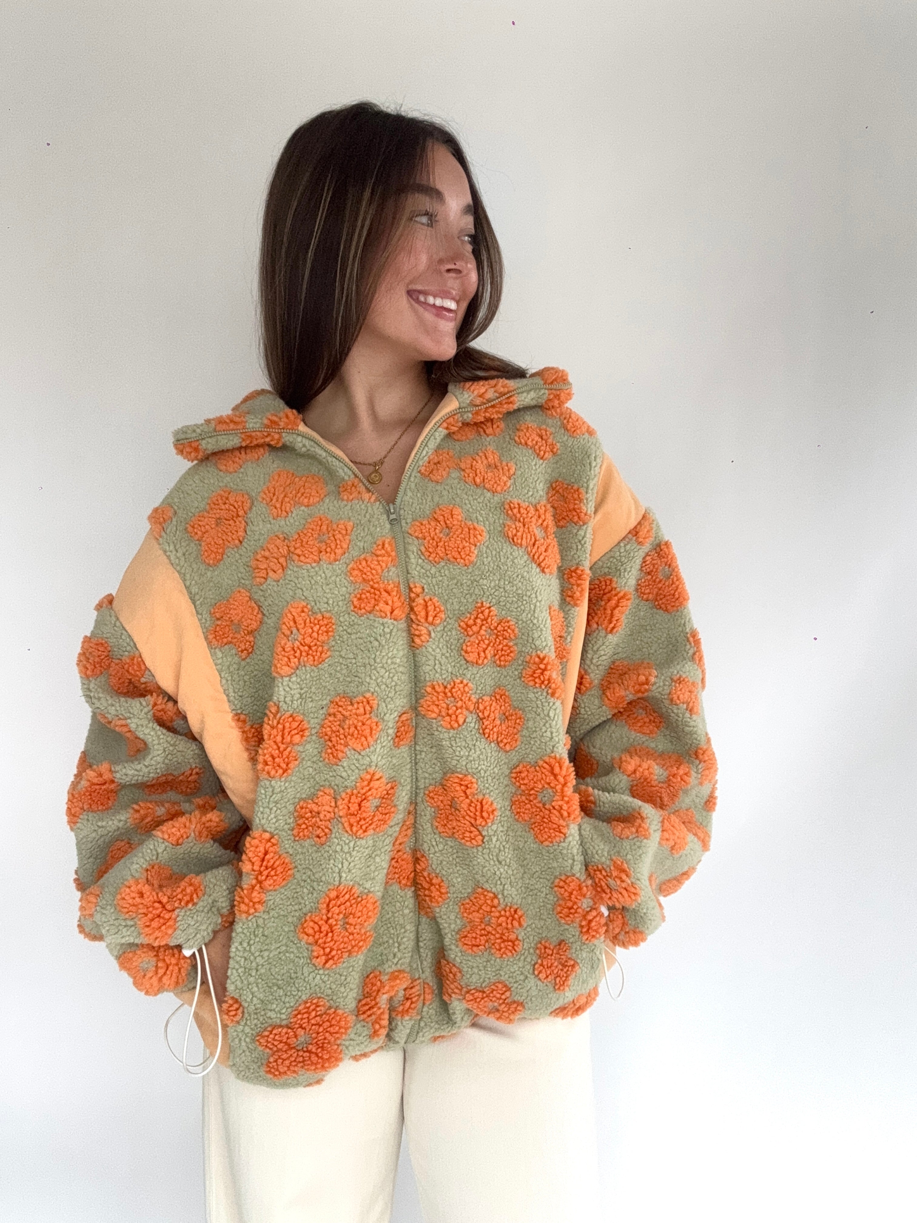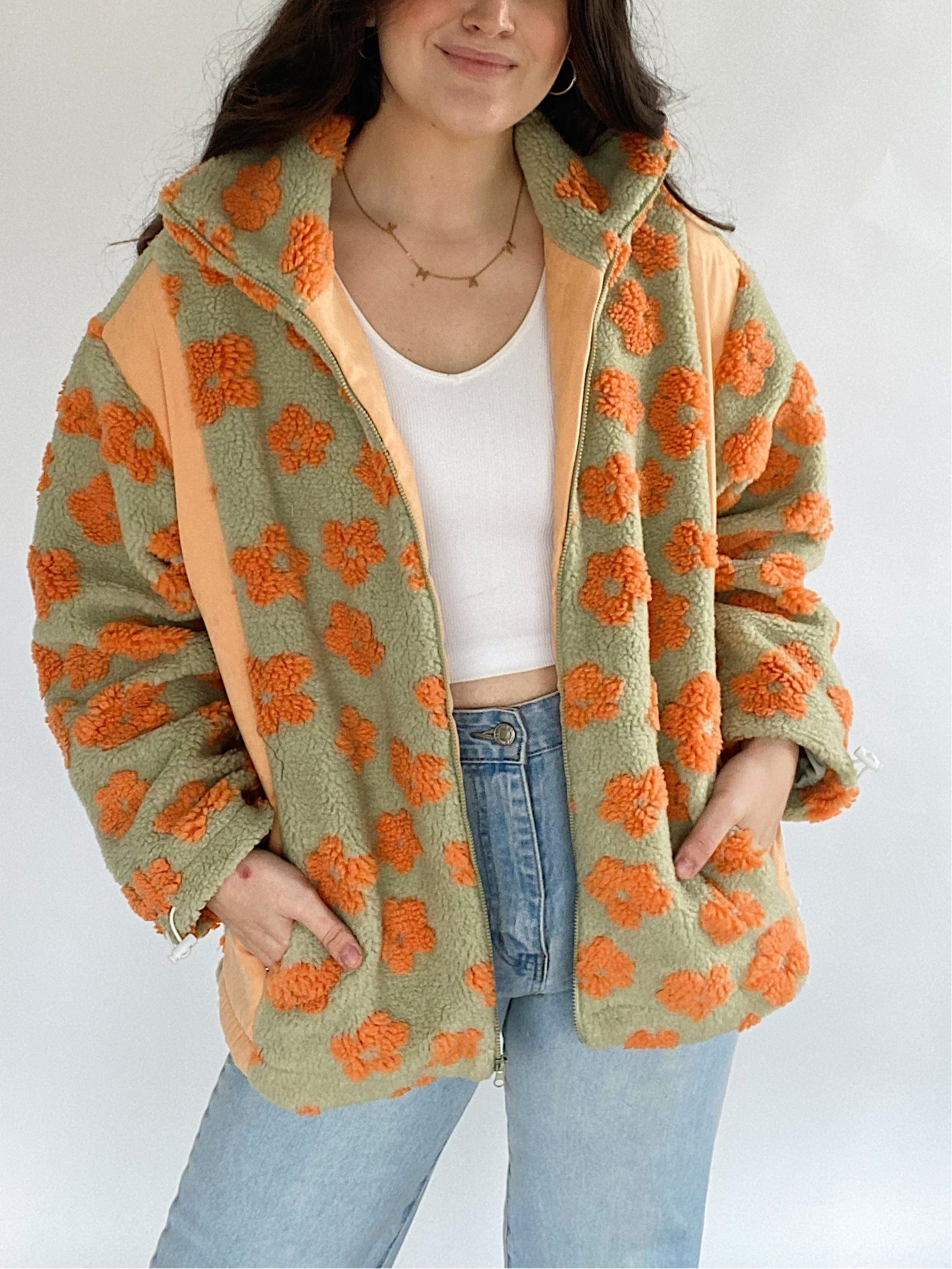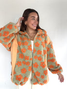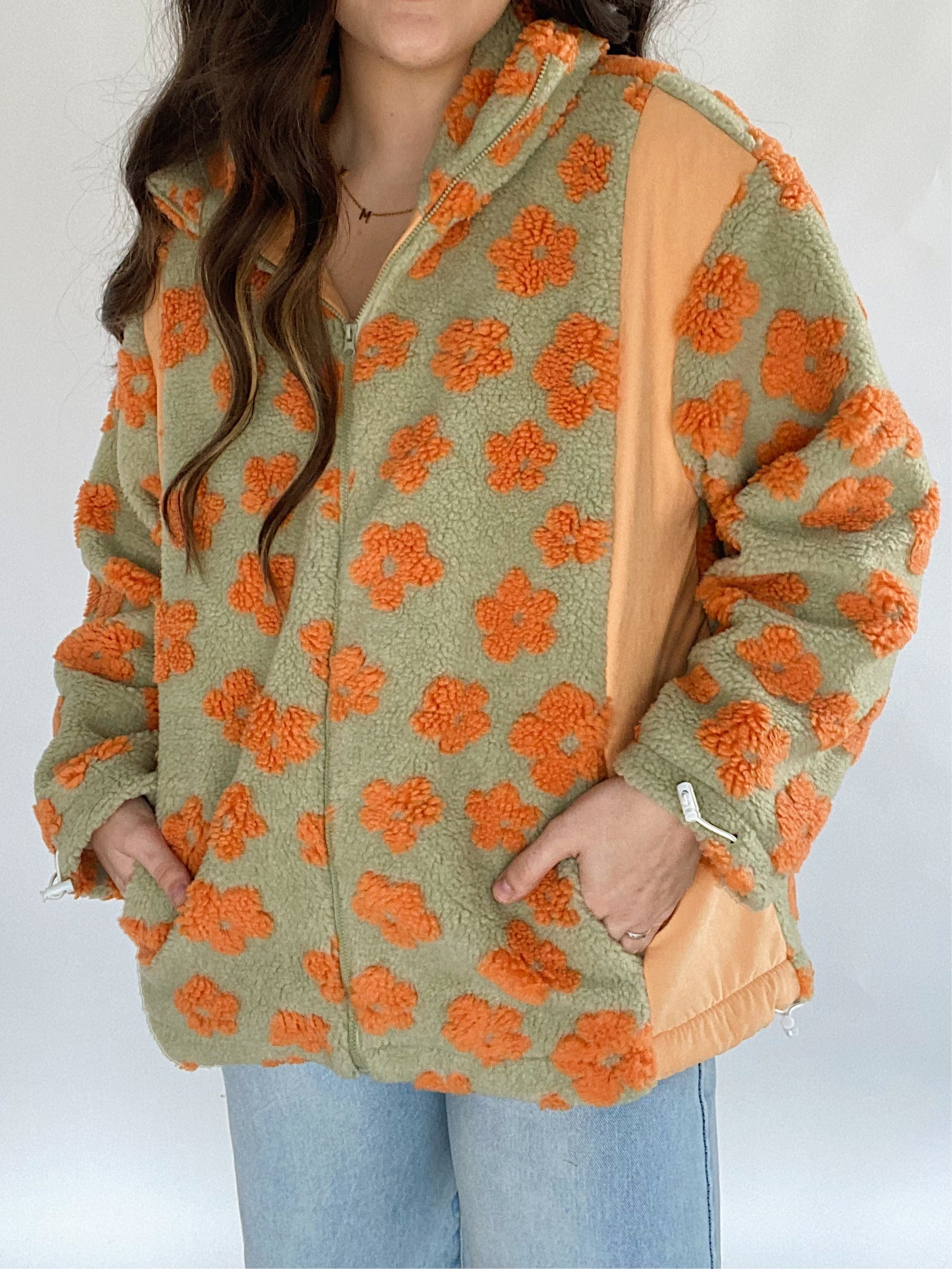 This sage green and orange sherpa zip up jacket has allover retro flower print with contrast side panels, an adjustable elastic bottom and side pockets. The cutest layering piece for cold days!
