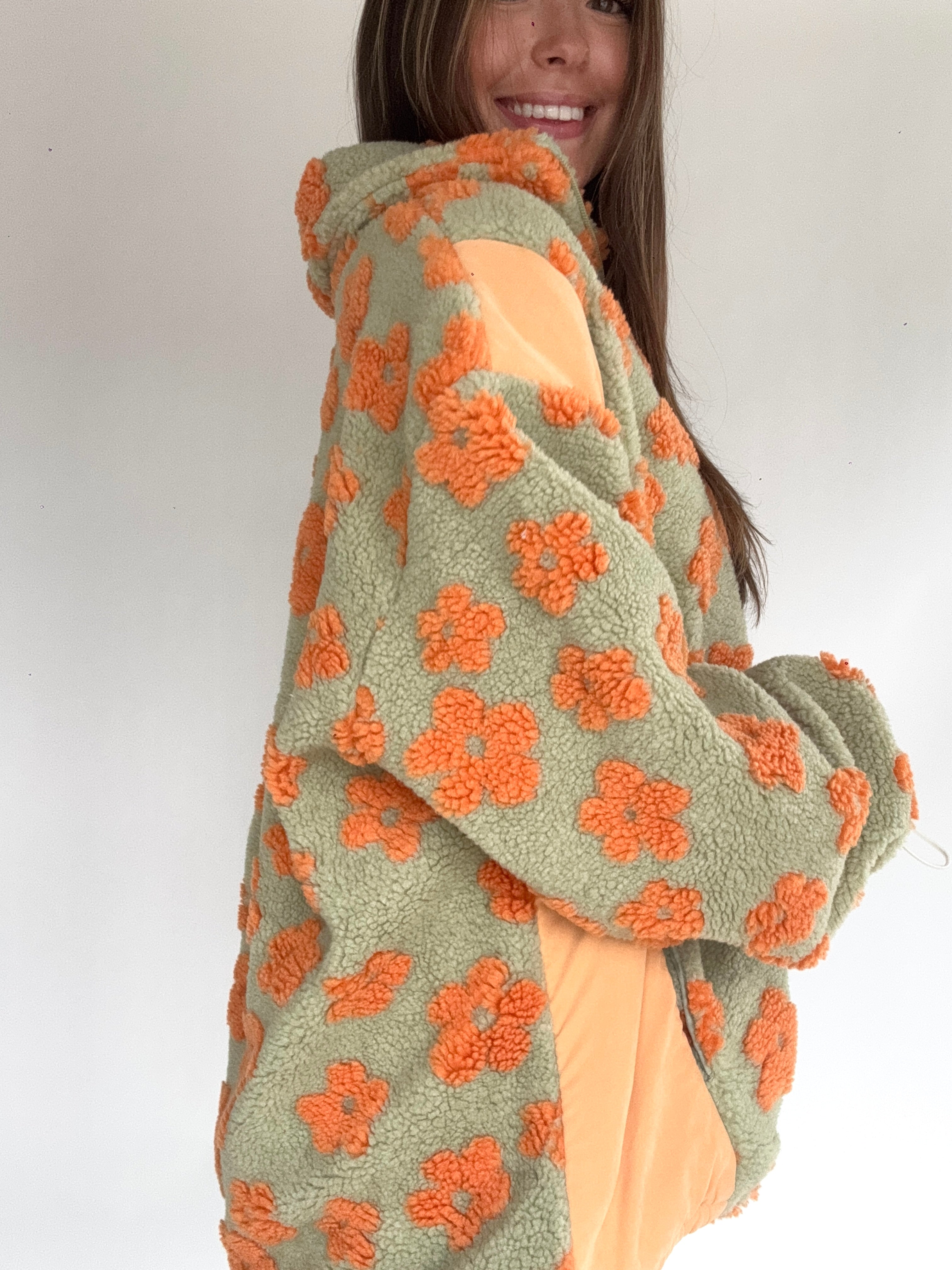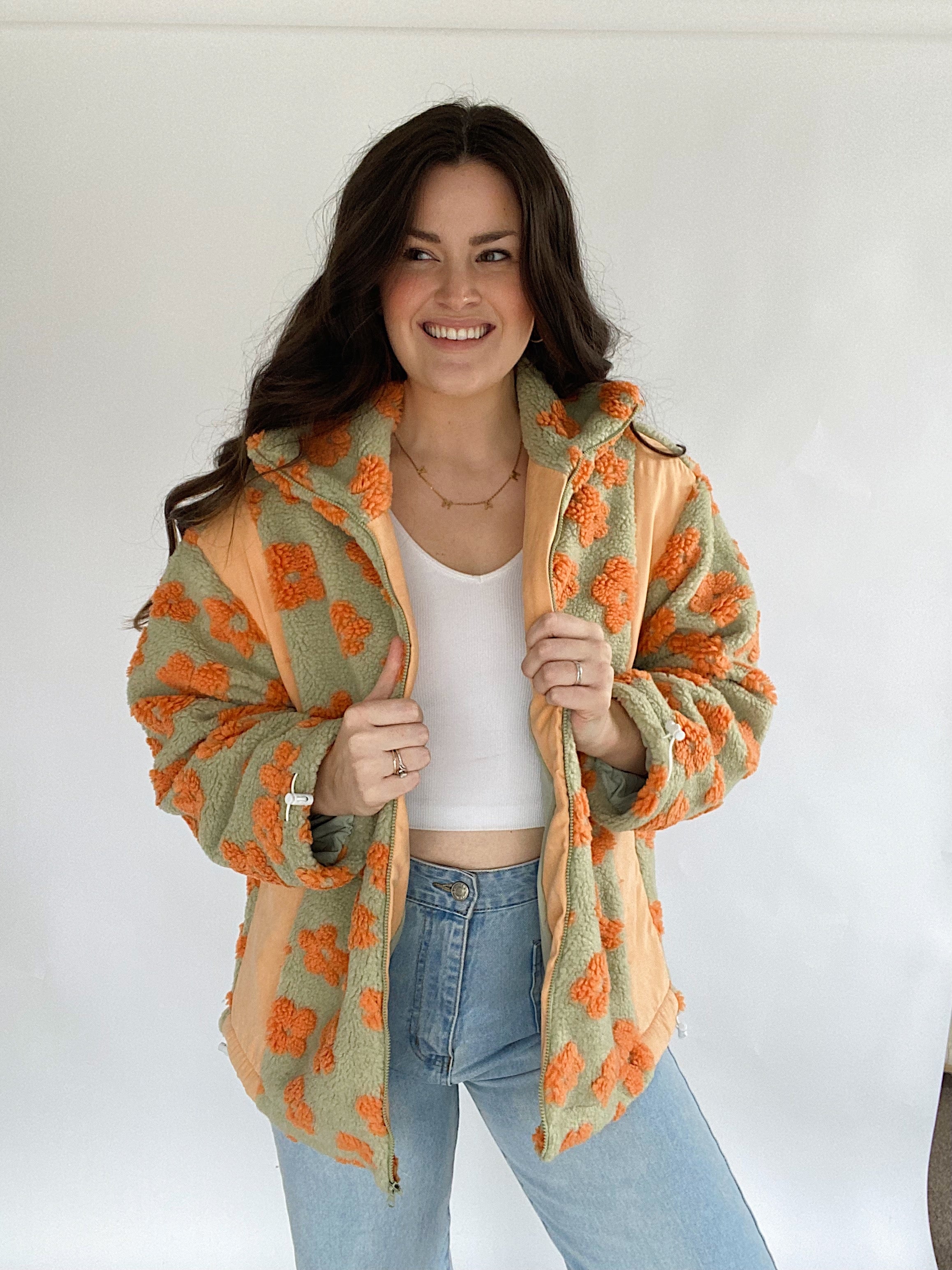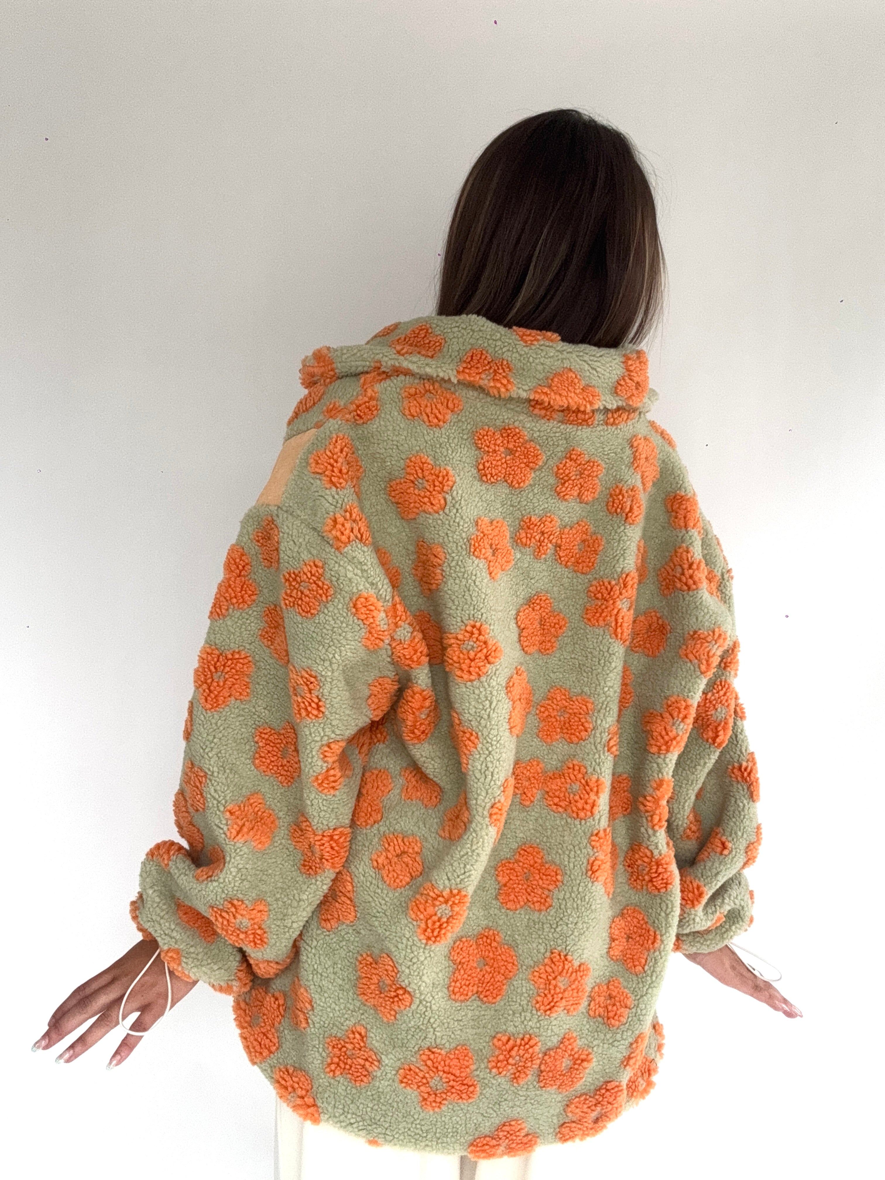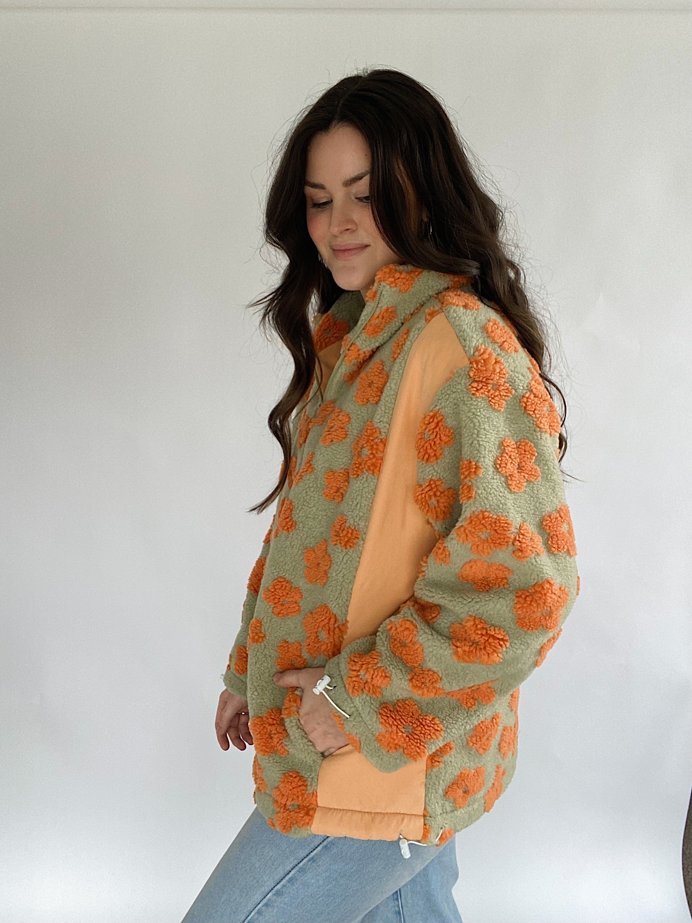 This sage green and orange sherpa zip up jacket has allover retro flower print with contrast side panels, an adjustable elastic bottom and side pockets. The cutest layering piece for cold days!