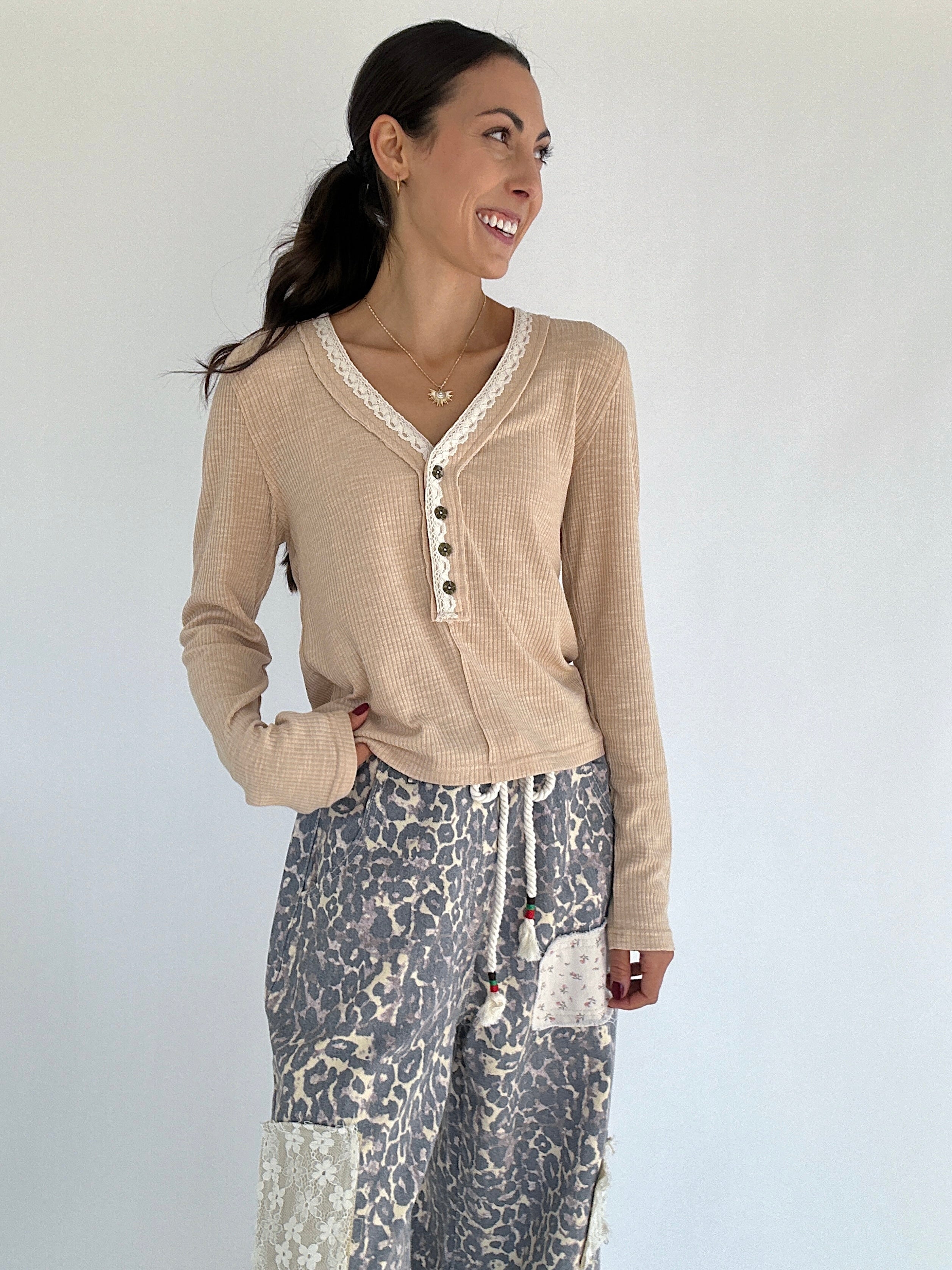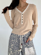 Perfect for layering on crisp mornings or pairing with your favorite jeans for a casual coffee run, the Final Chapter Long Sleeve Top brings timeless comfort with a subtle vintage touch. The neutral beige is complemented by a lace trimmed henley-style neckline featuring delicate flower metal buttons, giving this ribbed top a refined, everyday charm. Its regular fit and soft rib texture make it a versatile staple you’ll reach for again and again!