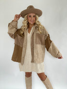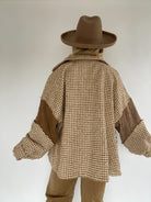 This mocha brown and cream houndstooth shacket has sweater knit panels and chest pockets, raw seaming, a button front and collared neckline.
