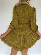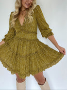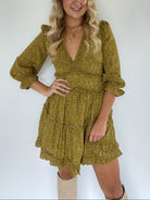 This olive green floral printed dress has the cutest ruffle detailing, a deep v neckline and slight bubble sleeves. Pair with heels or boots for an easy dressed up look!
