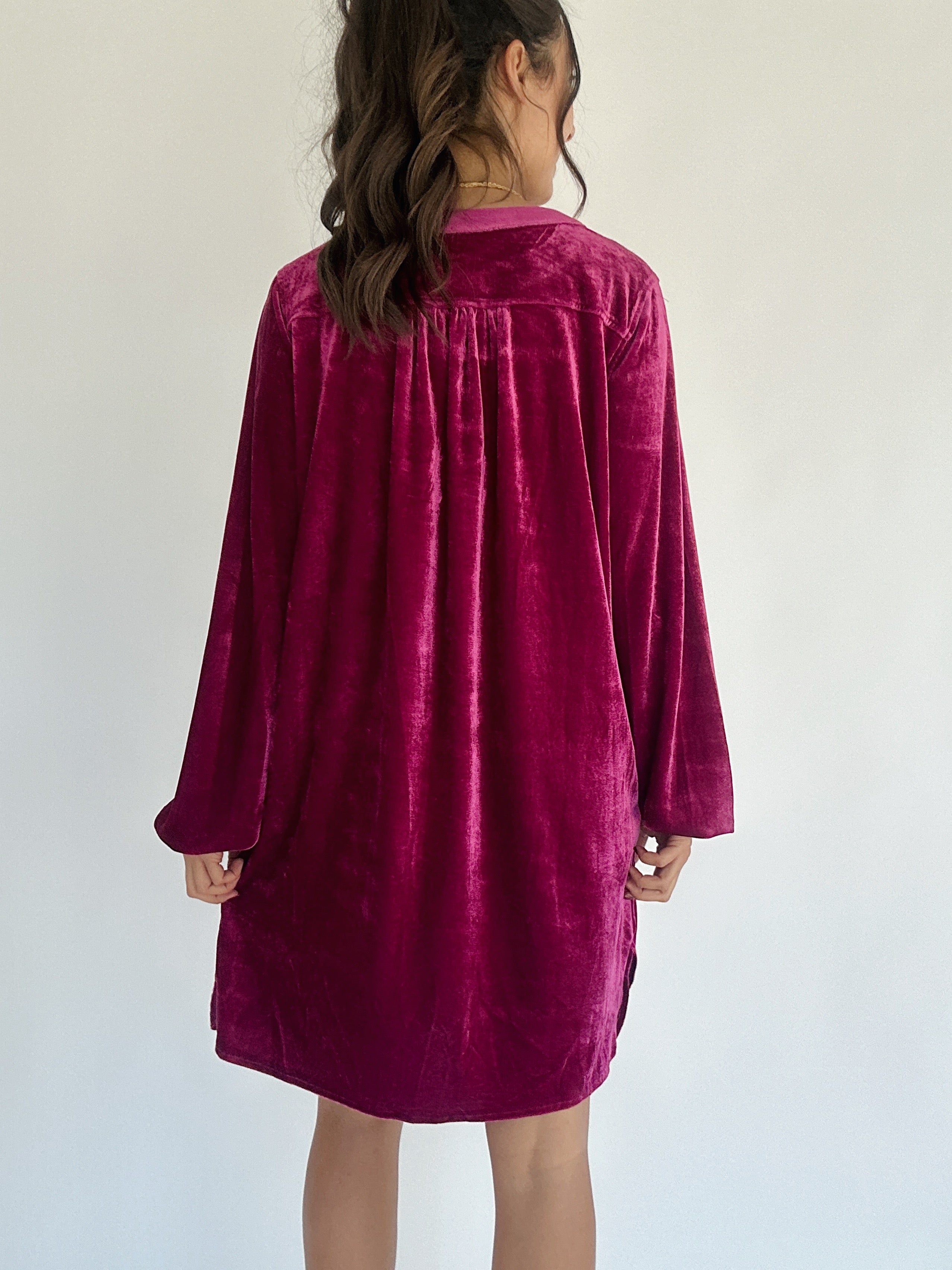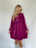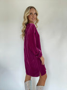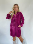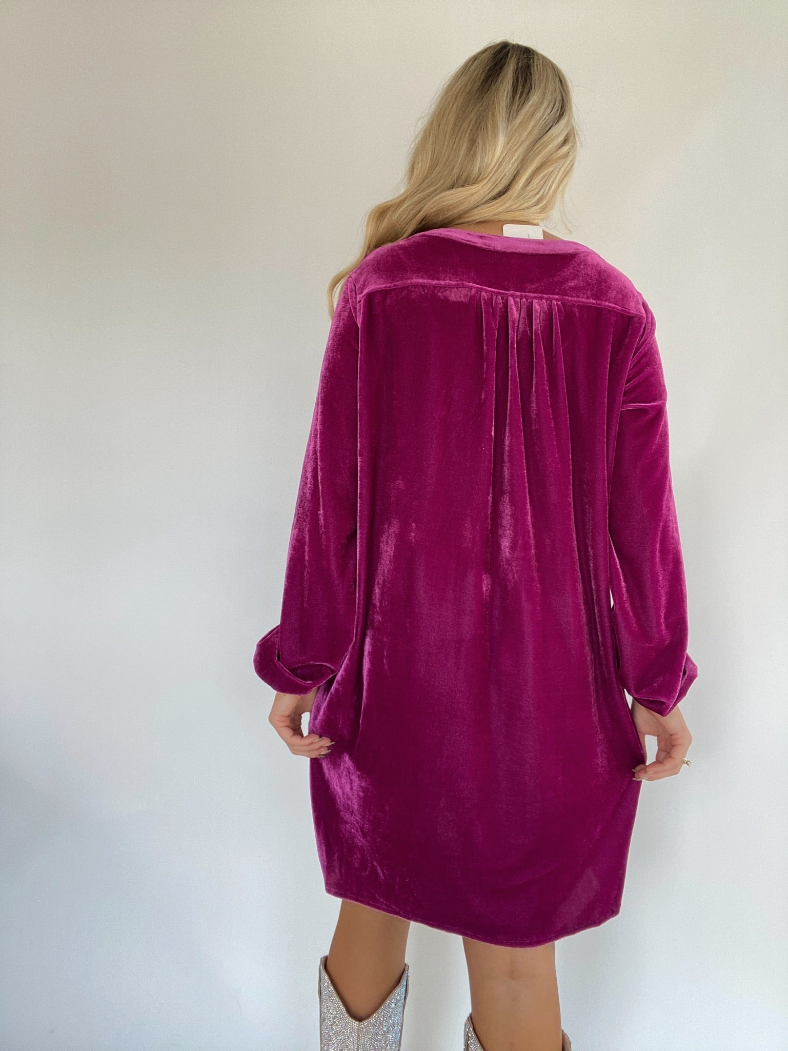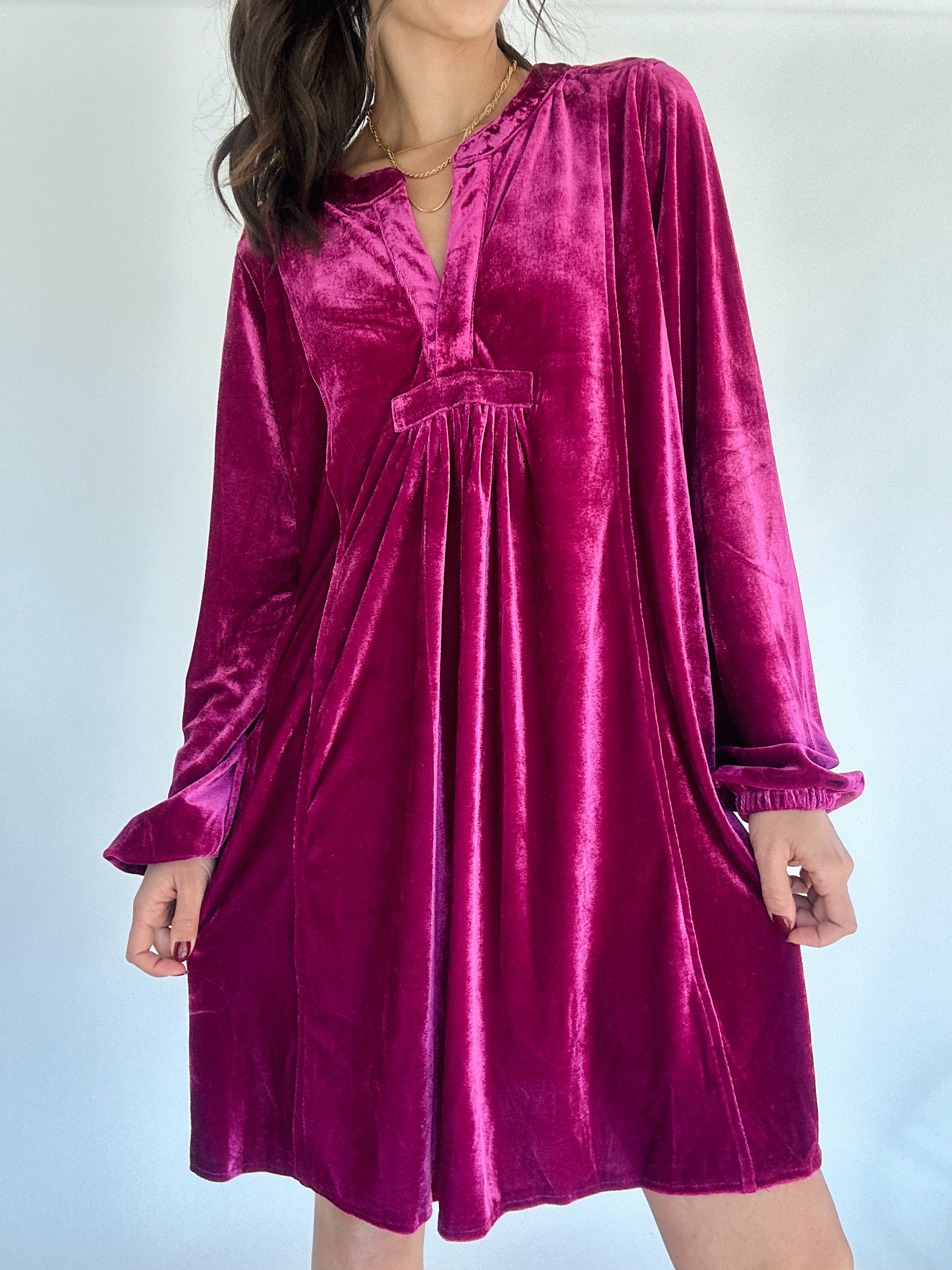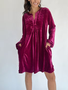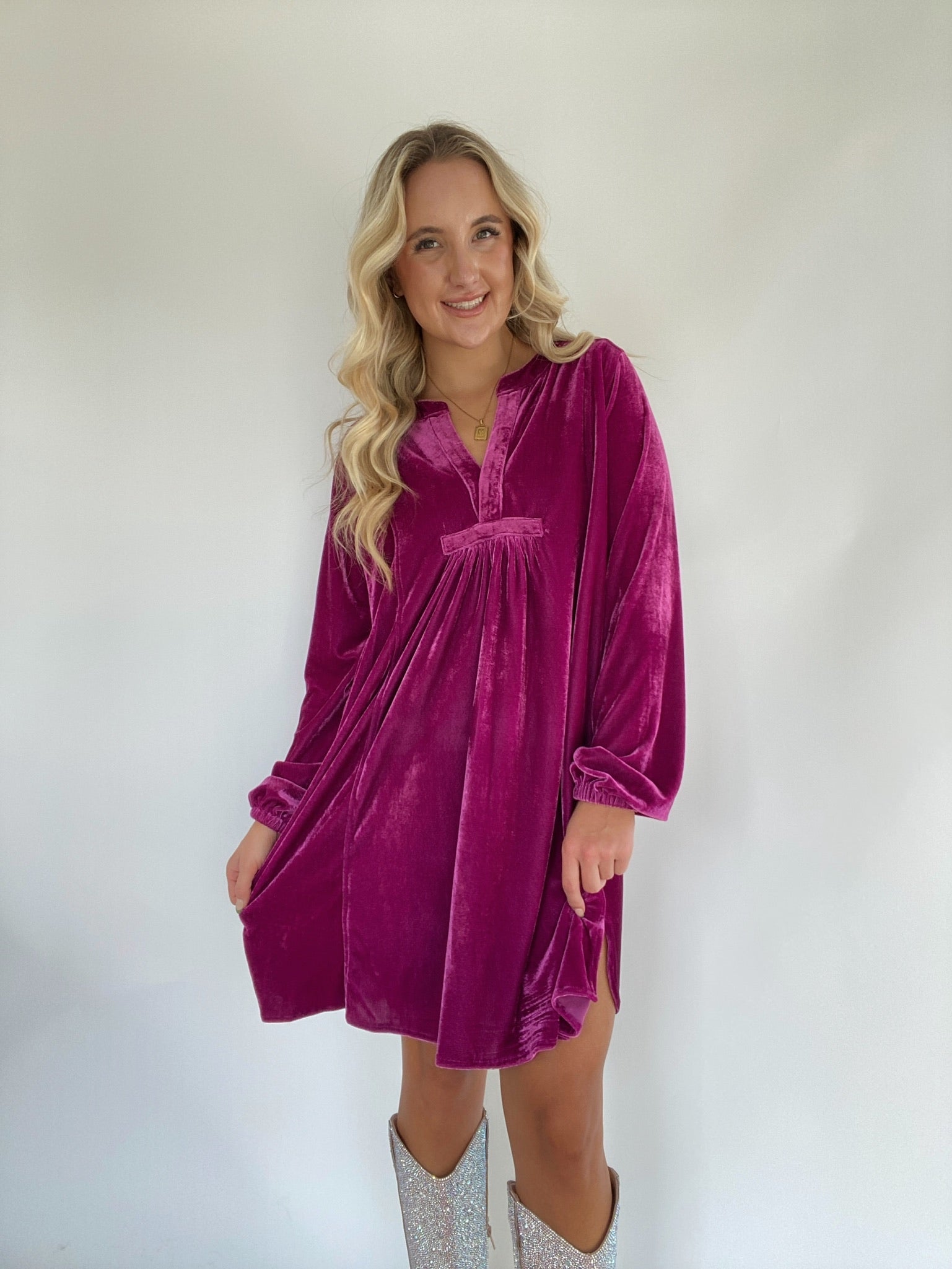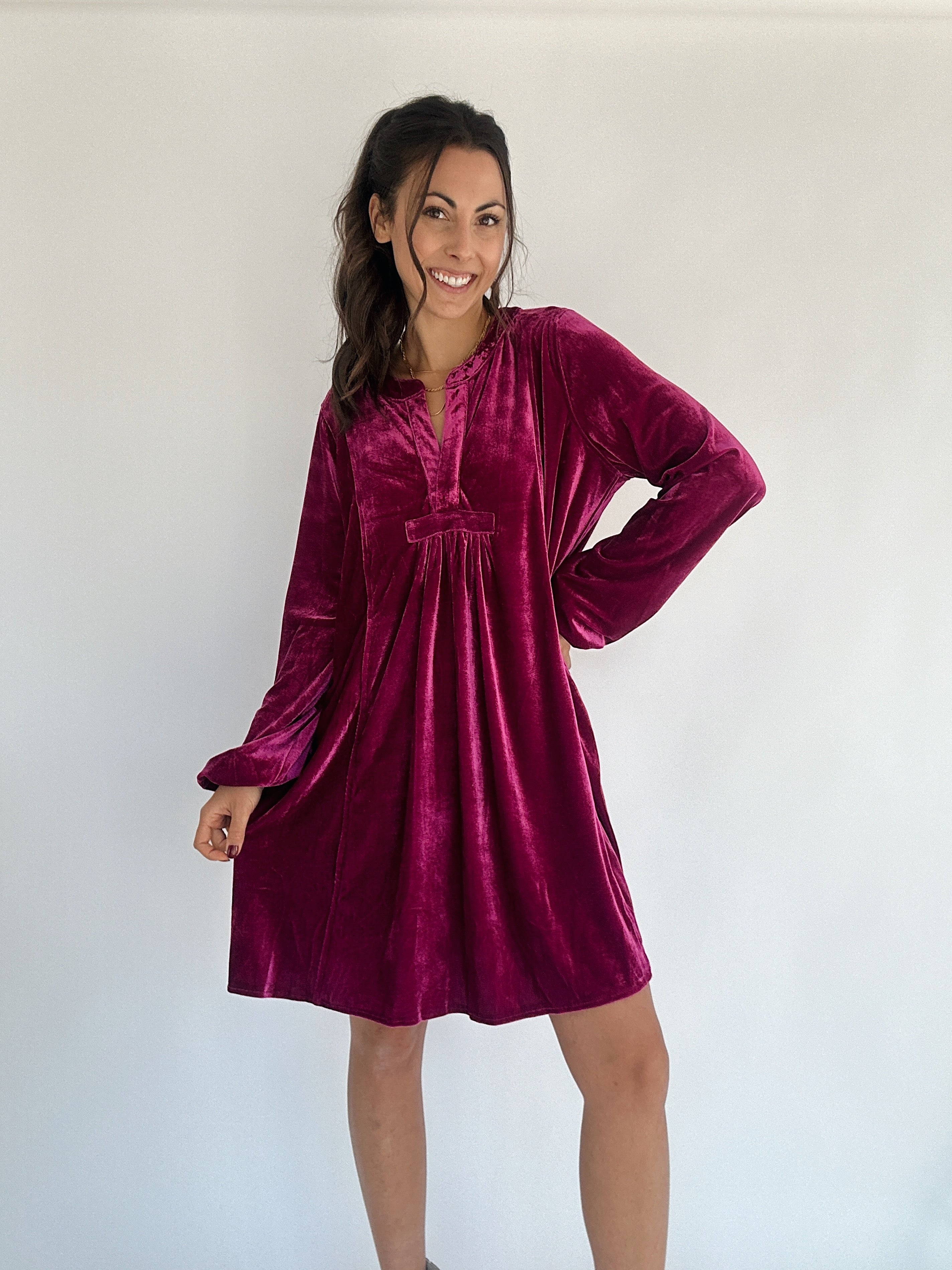 This long sleeve soft velvet tunic dress is a dream! It has a loose fit, v-neckline and pockets! The color is absolutely beautiful, perfect for fall and easy to take into the holidays!