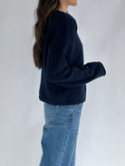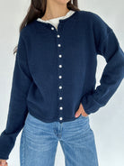 Timeless yet modern, the Jeanie Cardigan is the navy staple you’ll reach for all year long. Featuring a rolled collar, button-down front, and long sleeves with dropped shoulders, it blends classic design with an easygoing, relaxed fit. The lightweight knit and ribbed hem detail make it versatile enough to wear on its own or layered as outerwear.