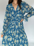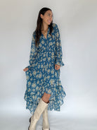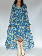 The kind of dress that floats with you—whether you're walking into a wedding, date night, or just out chasing a golden hour. The Karley High Low Maxi Dress features a dreamy mustard floral print on lightweight blue chiffon, with delicate ruffle details that accent the tiered skirt and give it that romantic, free-spirited feel. A button-up front and flattering v-neckline complete the look, while the long sleeves and high-low hem make it a perfect pick for transitional weather.