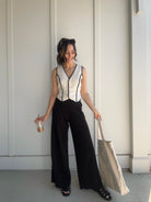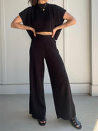 These black wide leg pants have an elastic waistband and are perfect for transitioning seasons. Pair with a sweater, graphic tee or the matching Leonie Top to make it a set!