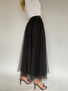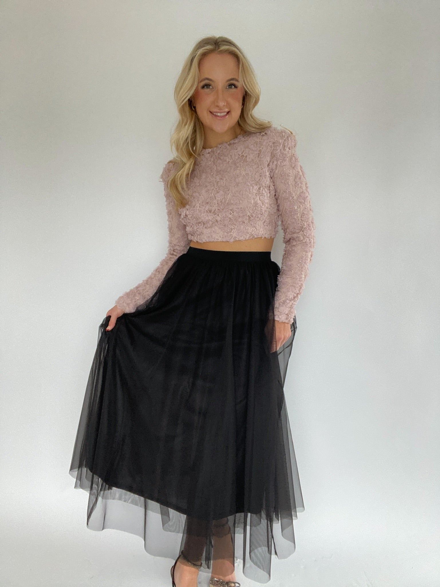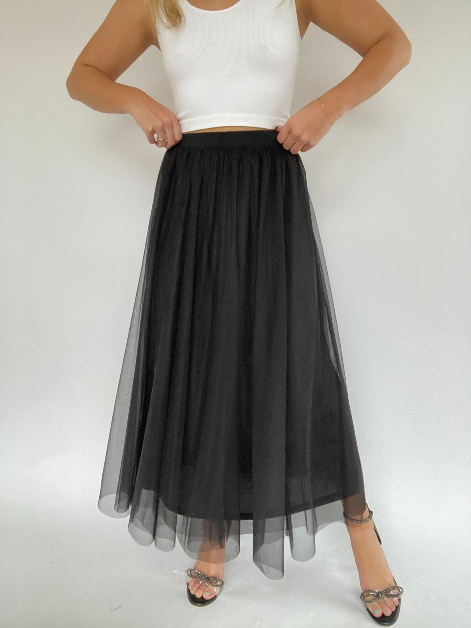 This black maxi skirt is chic and fun at the same time! It has an elastic waistband with a full lining and tulle overlay. Dress it down with a sweatshirt or graphic tee and dress it up with a sweater and heels for your next event!
