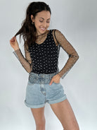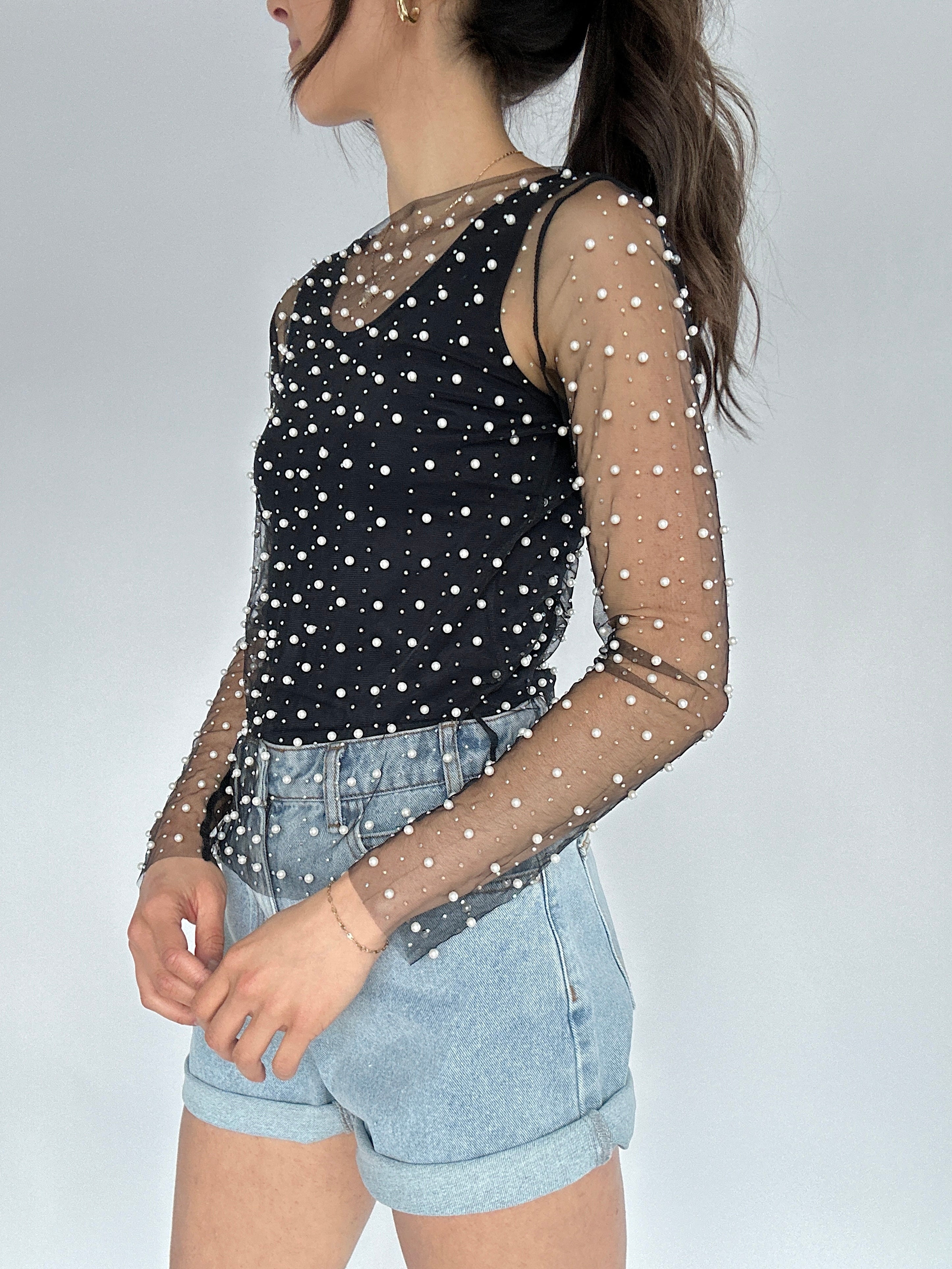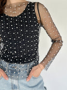 This black mesh top is embellished with pearls and studs and is sure to give that *main character energy* It has a boat neckline, long sleeves and a loose fit making it easy to layer over a tank or bralette or even under a graphic tee!