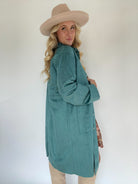 This teal green faux suede jacket has a midi length silhouette, snap button front and exaggerated pockets. Layer over your outfits or button it up and wear it as a dress!