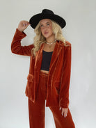 Spice up your outfit with this bronze velvet blazer! It has a classic fit with button closure and side pockets. Pair with the matching Mercy Velvet Pants or wear it over a basic outfit.
