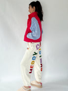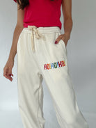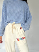 Festive, cozy, and full of holiday cheer, the Merry Christmas Lettered Joggers are the perfect statement pants for lounging, gifting, or casual holiday outings. These ivory joggers feature multicolor “Merry Christmas” patches along the legs and back, plus a playful “HO! HO! HO!” embroidered on the hip. With an elastic waistband, drawstring, and cinched bottoms, they’re as comfortable as they are merry!