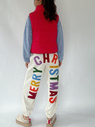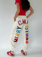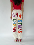 ✶ Ivory joggers with multicolor “Merry Christmas” patches along legs + back