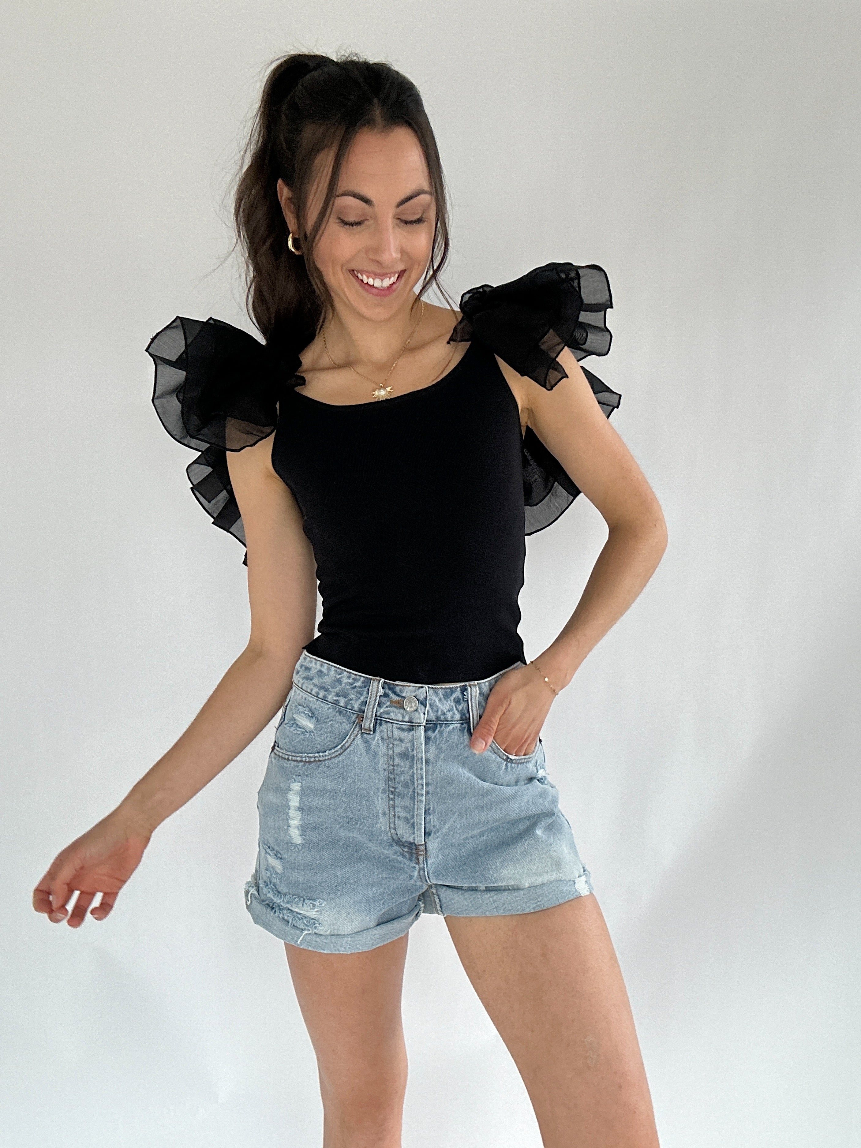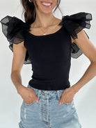 This black ruffled sleeve top will make you feel like you should be walking down a runway! It has a stretchy knit bodice and dramatic sleeves. The cropped fit makes it easy to wear with high waisted jeans, trouser pants, skirts... classy or edgy, it's so versatile!