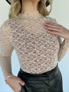 This nude sheer lace long sleeve top has a mock neck and it perfect for layering! Throw on a tank or graphic tee over it to add a little extra detail to your outfit.