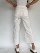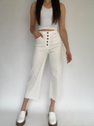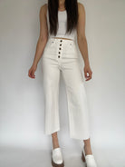 These button front high waisted pants are super stretchy with a wide leg cropped fit. The raw hem makes it easy to cut off to your favorite length!
