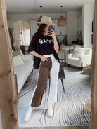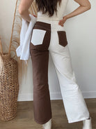 These two tone cropped wide leg pants have a high waist, button and zipper fly, belt loops and mix matched pockets. Wear them with any neutral top and some booties for the perfect fall look!