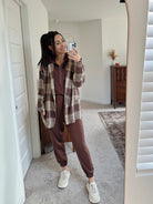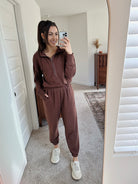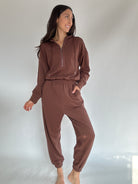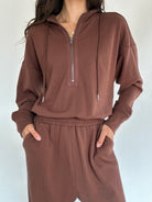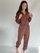 Casual, comfy, and endlessly versatile, the Wherever You Go Hoodie Jumpsuit is designed to keep up with your day-to-day. Made in a soft cocoa brown cotton terry, it features an elastic waistband for shape, jogger-style bottoms, and side pockets for functionality. The half zip top and hood add a sporty touch—making it easy to dress down with sneakers or elevate with a blazer and booties.