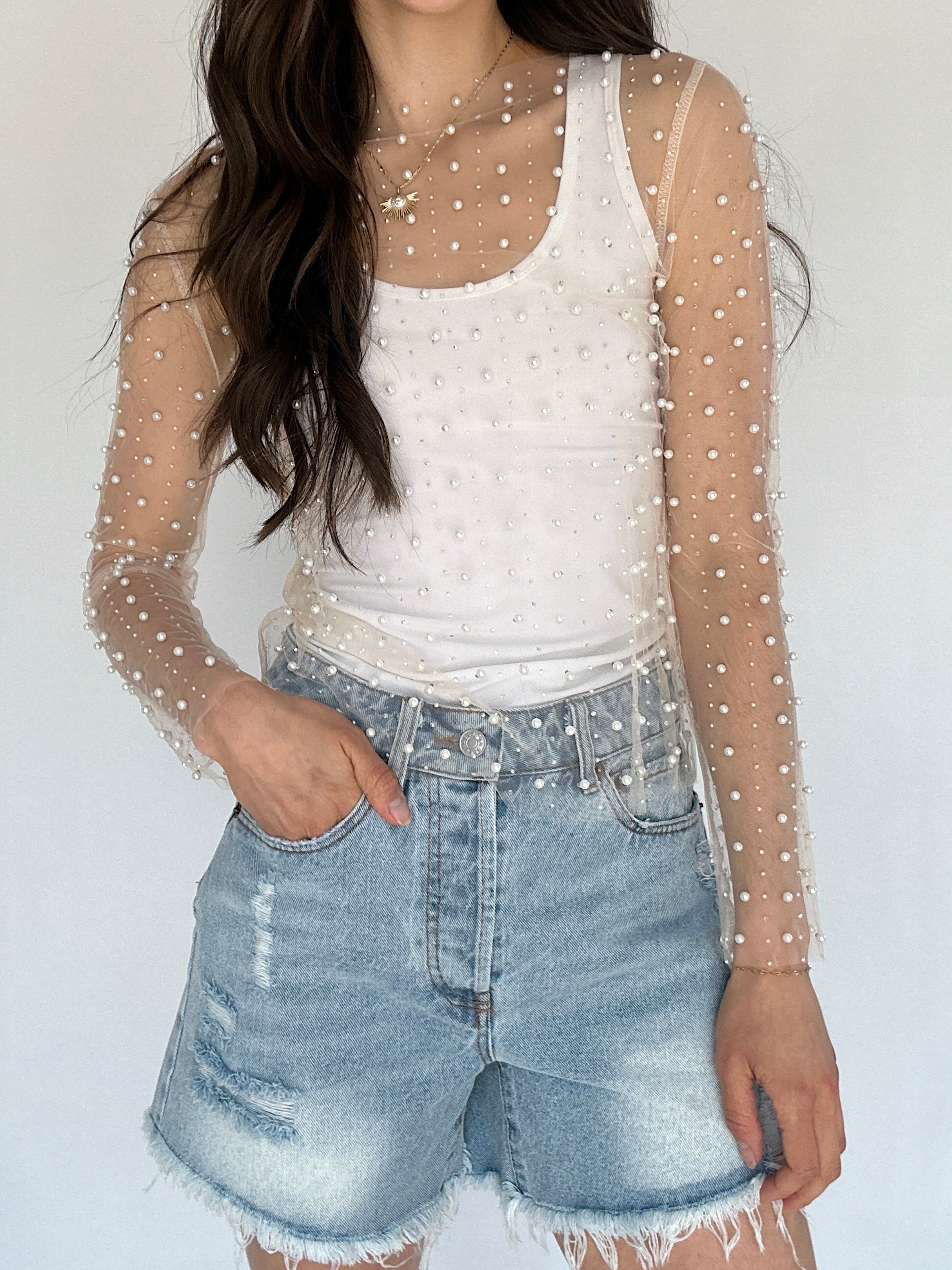 This nude mesh top is embellished with pearls and studs and is sure to give that *main character energy* It has a boat neckline, long sleeves and a loose fit making it easy to layer over a tank or bralette or even under a graphic tee!