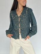 Rorey Quilted Denim Top – Picture yourself in this dreamy denim number — soft, quilted, and covered in the sweetest little floral pattern. The scalloped edges, Peter Pan collar, and triple front ties give it that just-right mix of vintage and playful. It’s one of those pieces that turns even a simple outfit into something special — perfect for brunch, errands, or cozy coffee dates.