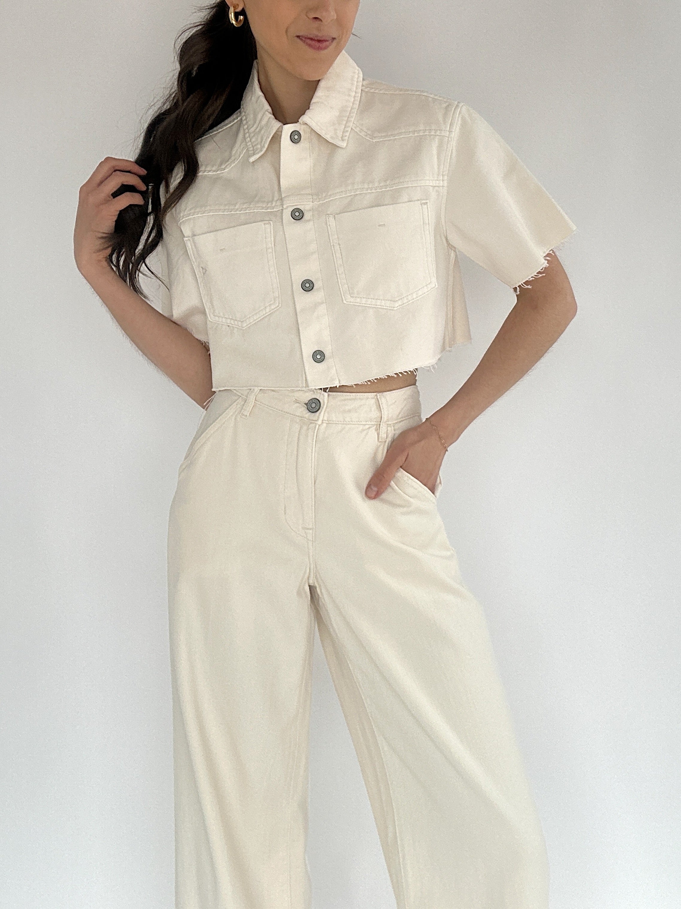 This ecru denim cropped top is a must have! It has a short sleeve, cargo style with chest pockets, a button front and boxy fit. Pair it with high waisted pants, maxi skirts, over dresses or with the matching Nori Wide Leg Trouser Jeans in Ecru for the cutest set!