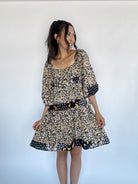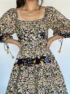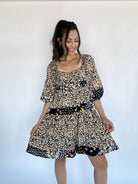 This black floral mini dress has contrasting patterns, a square neckline, half bubble sleeves with tie details and a tiered ruffled bottom.