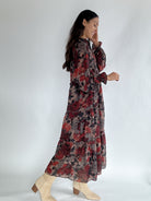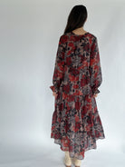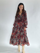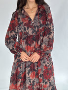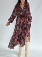 Perfect for brunches, weekend outings, or date nights, the Said And Done Floral Midi Dress is a romantic, flowy piece with timeless charm. Made in a sand toned fabric with brown and red floral print, it features a deep V-neckline with button closure, ruffle collar, and tassel neck tie. Long sleeves with ruffle cuffs and a tiered ruffle skirt with trim complete the loose, calf-length silhouette that is lined to the knee. Pair with heels for a holiday party or boots for a casual day out!