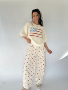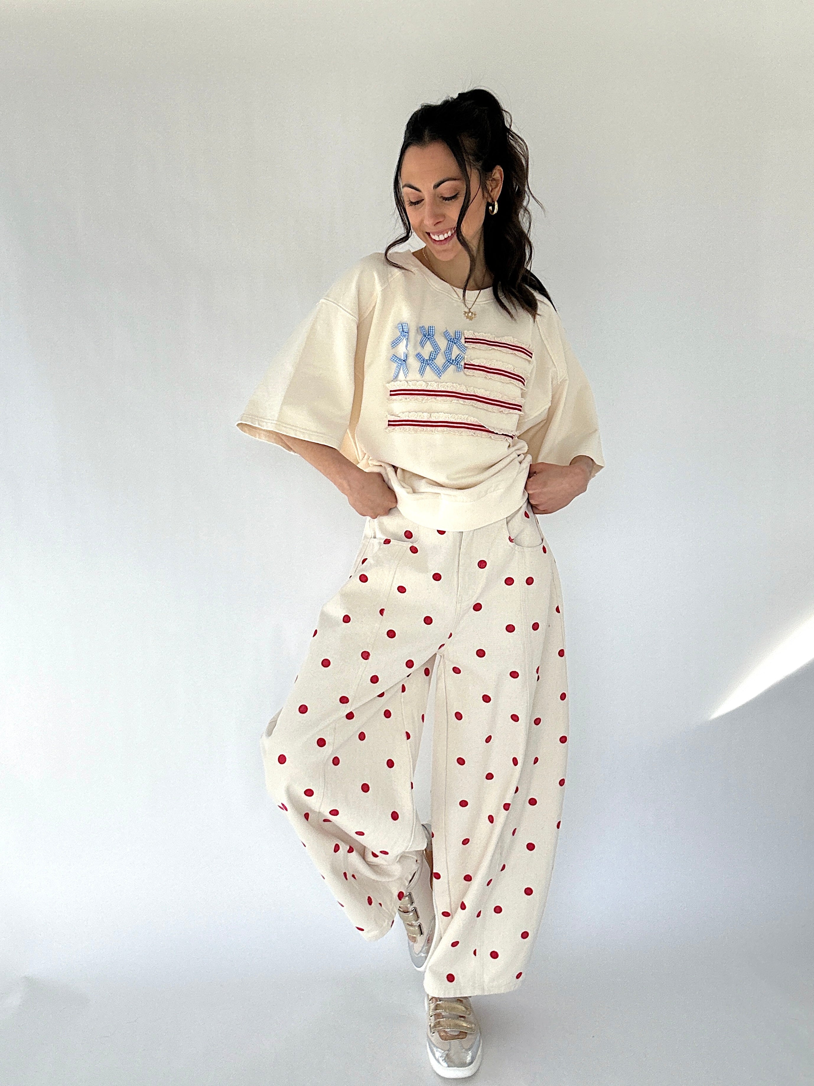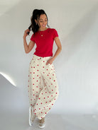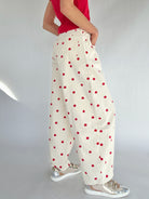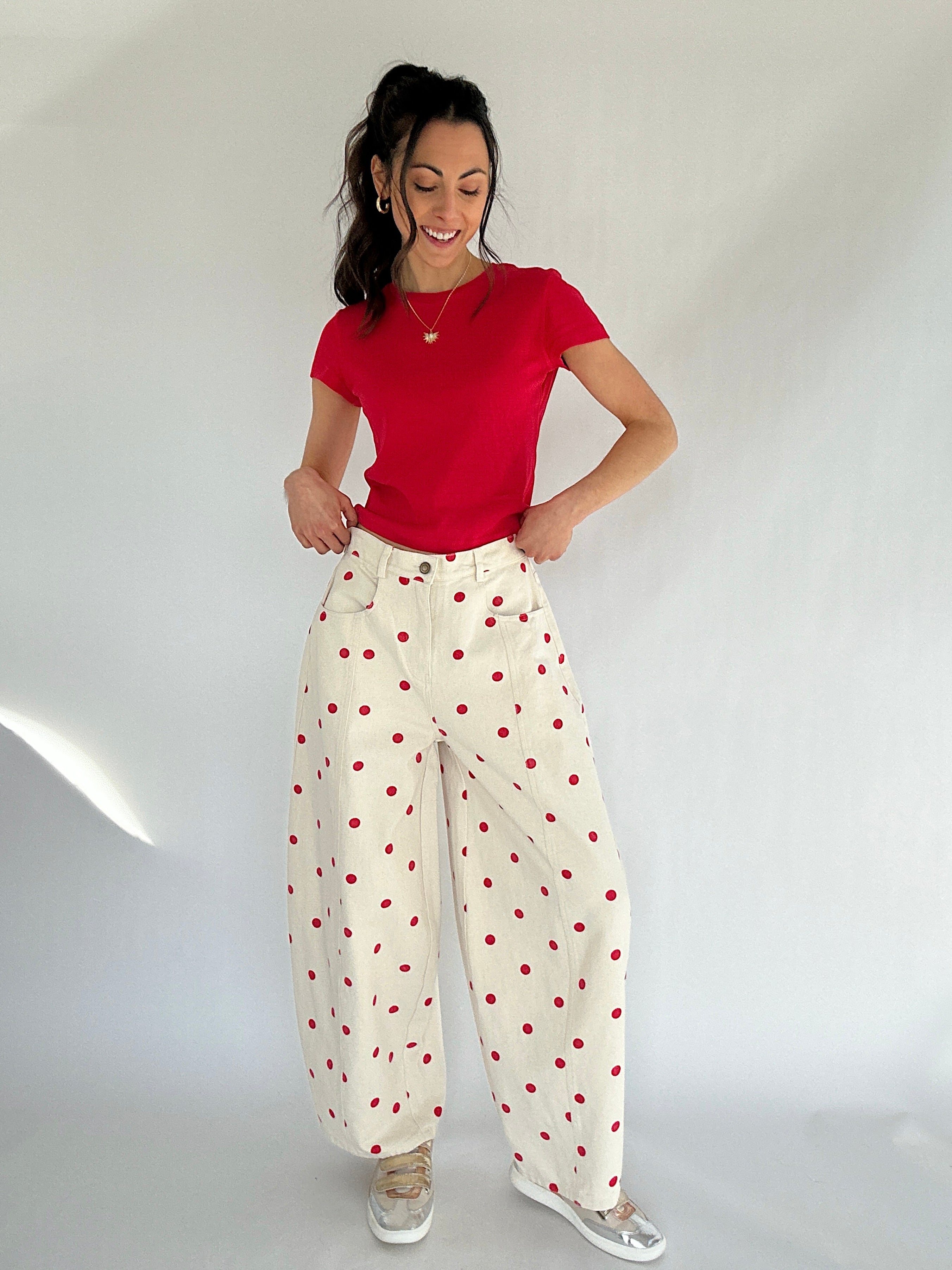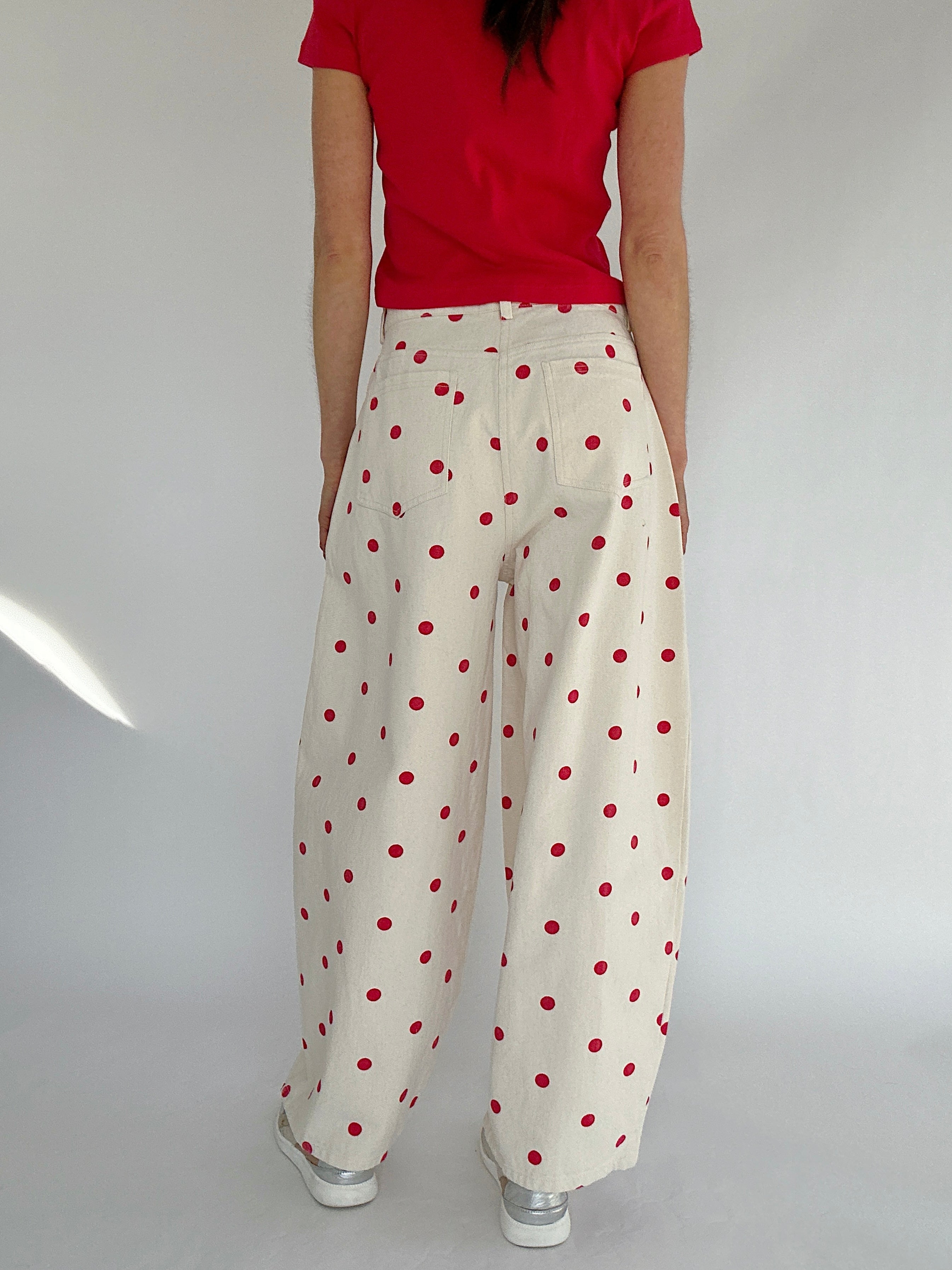 Polka Dot Barrel Pants - Red – Sweet, fun, and SO cute, these cream pants with red polka dots bring a playful twist to your everyday looks. The flattering barrel-leg silhouette gives them a modern edge, while the soft yet structured cotton fabric keeps them looking effortlessly put-together. Perfect for coffee dates, weekend brunches, or casual workdays that could use a little extra personality!